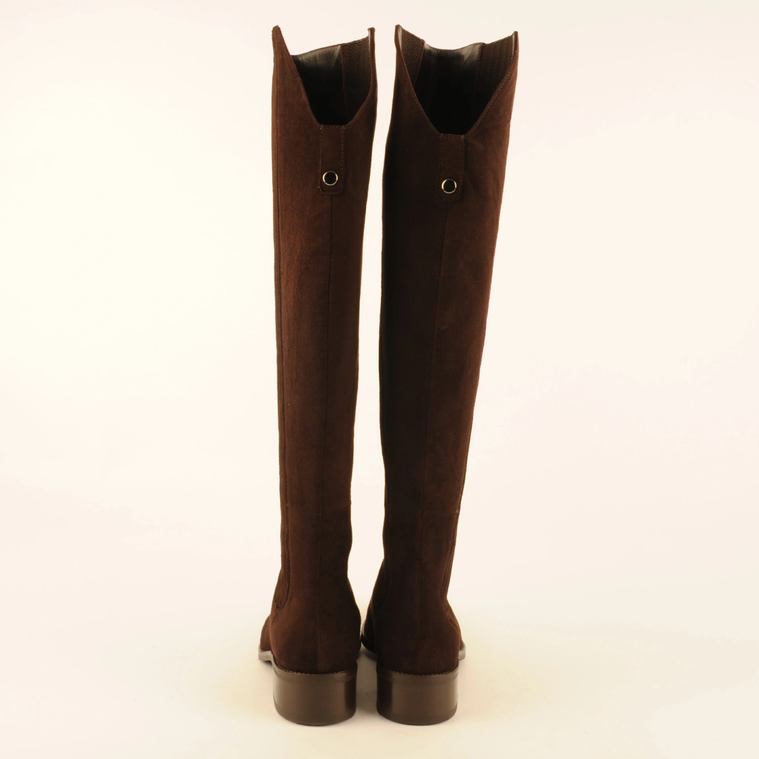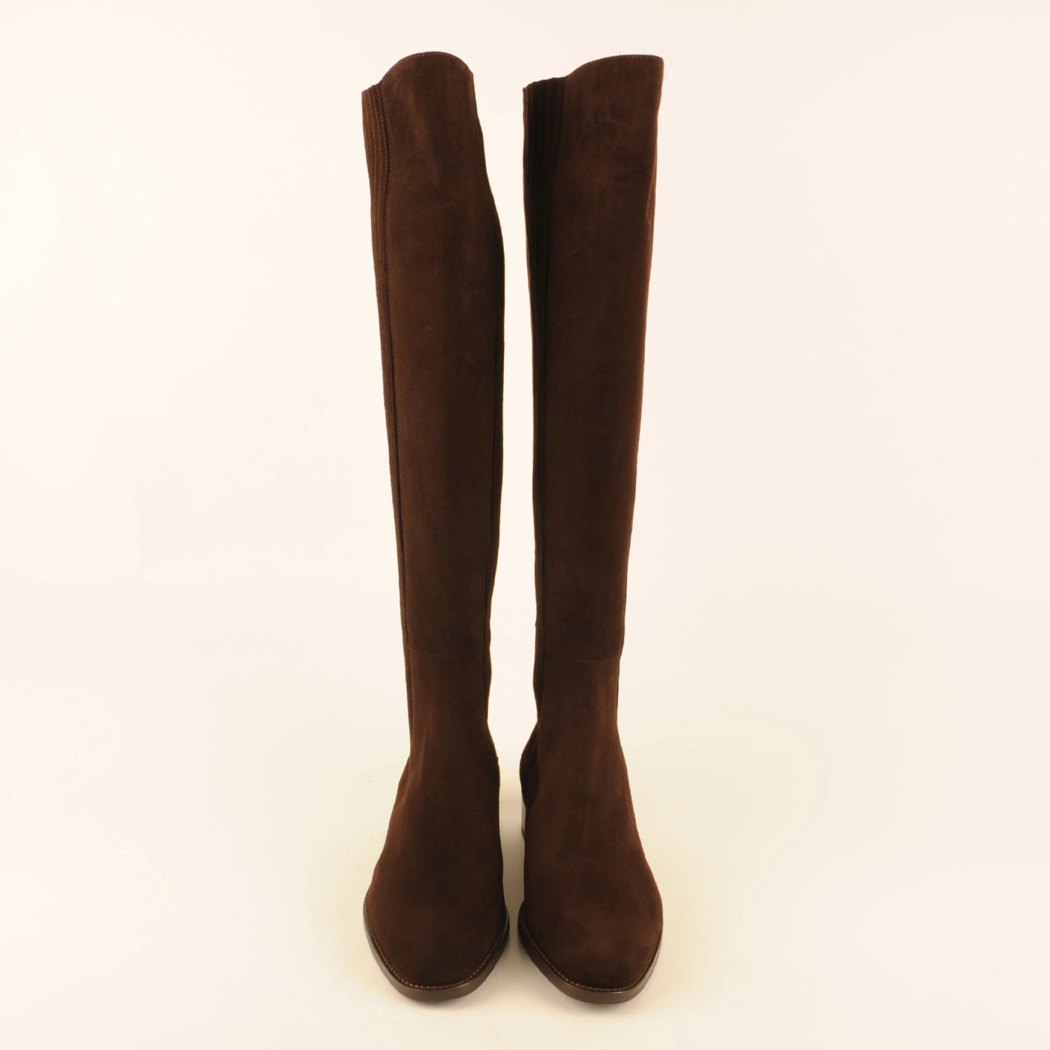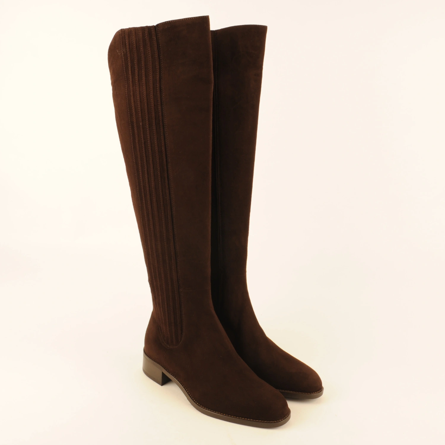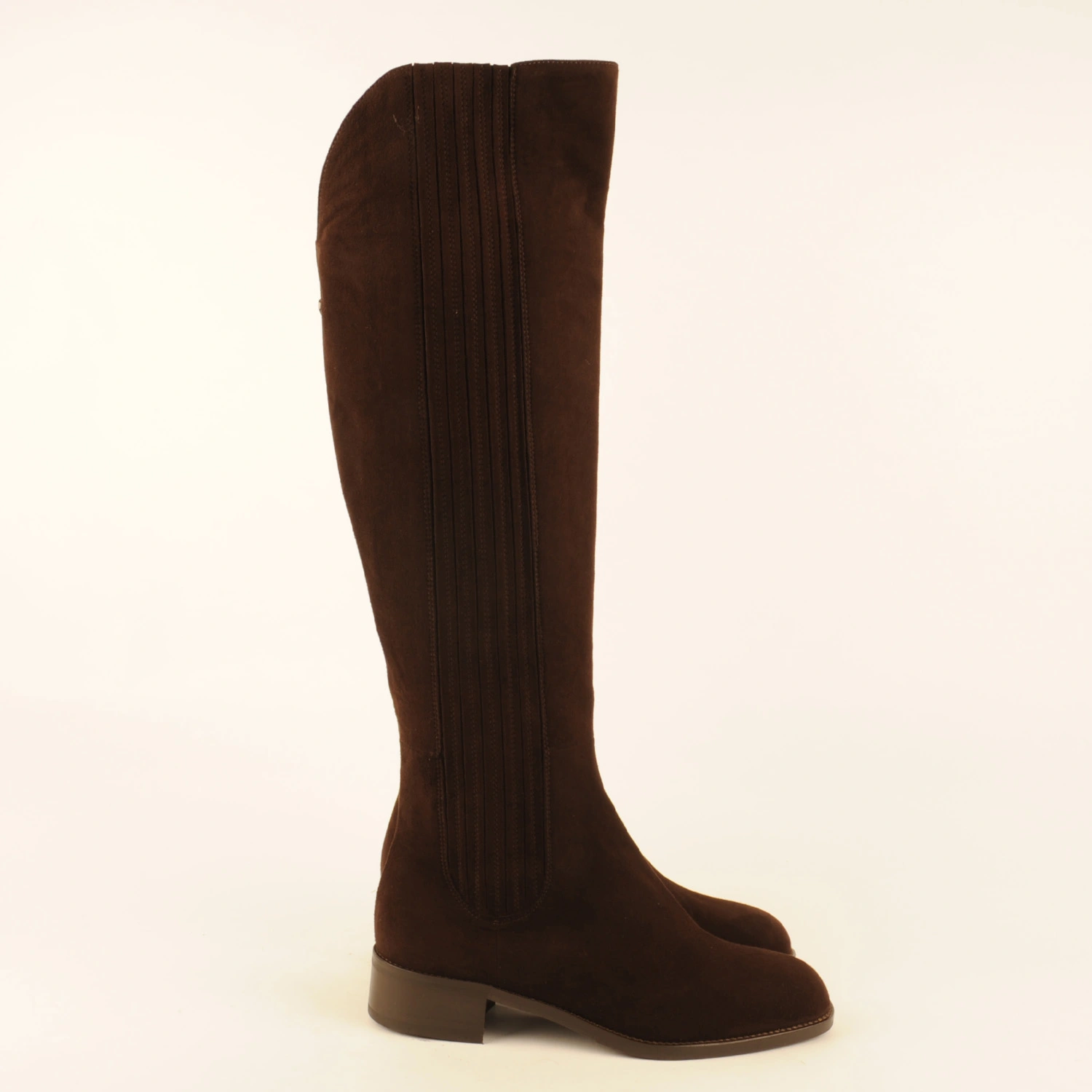 Extra-long tailored boot made of dark brown suede with suede-covered elastic. This boot is leather-lined and has a rubber sole with a 3-centimetre heel. This boot runs half a size larger than usual. We therefore recommend ordering half a size smaller.