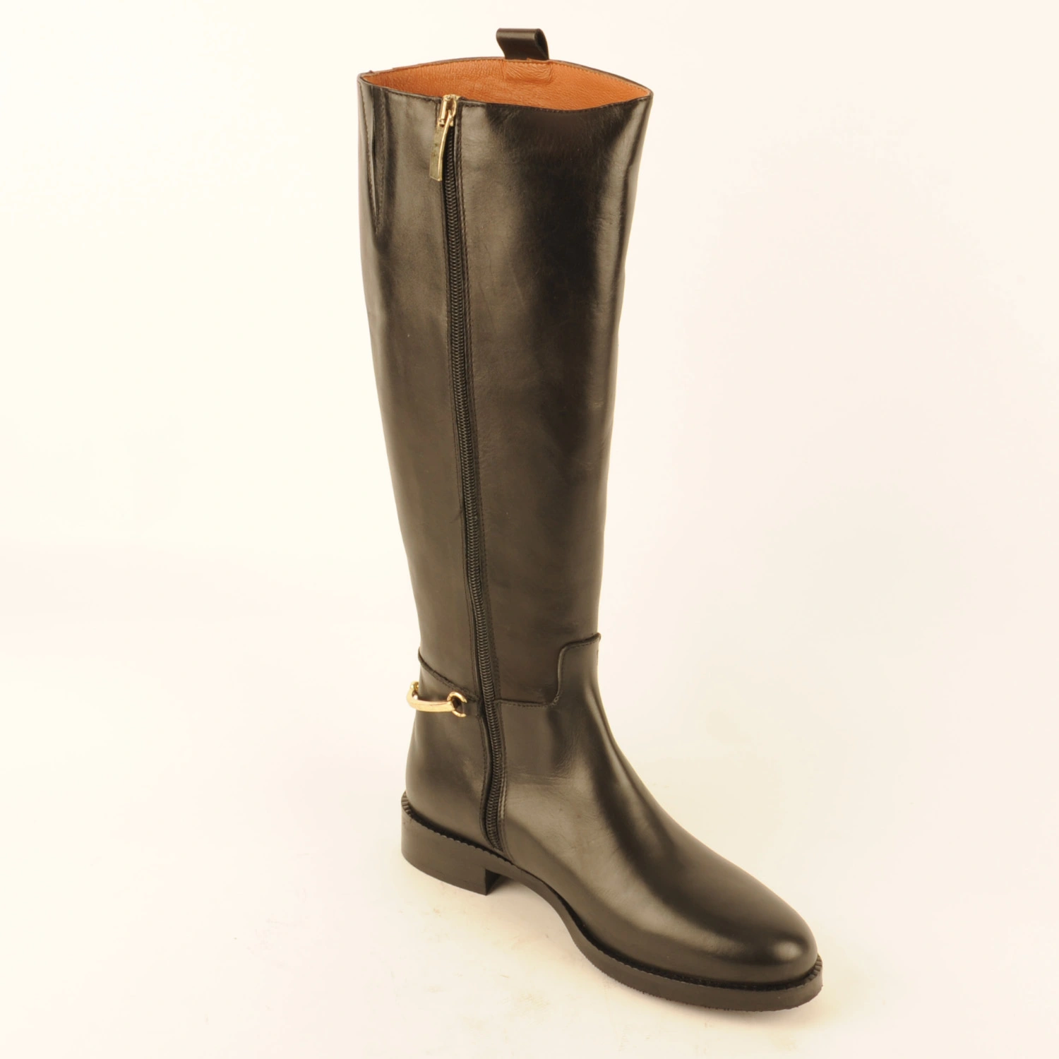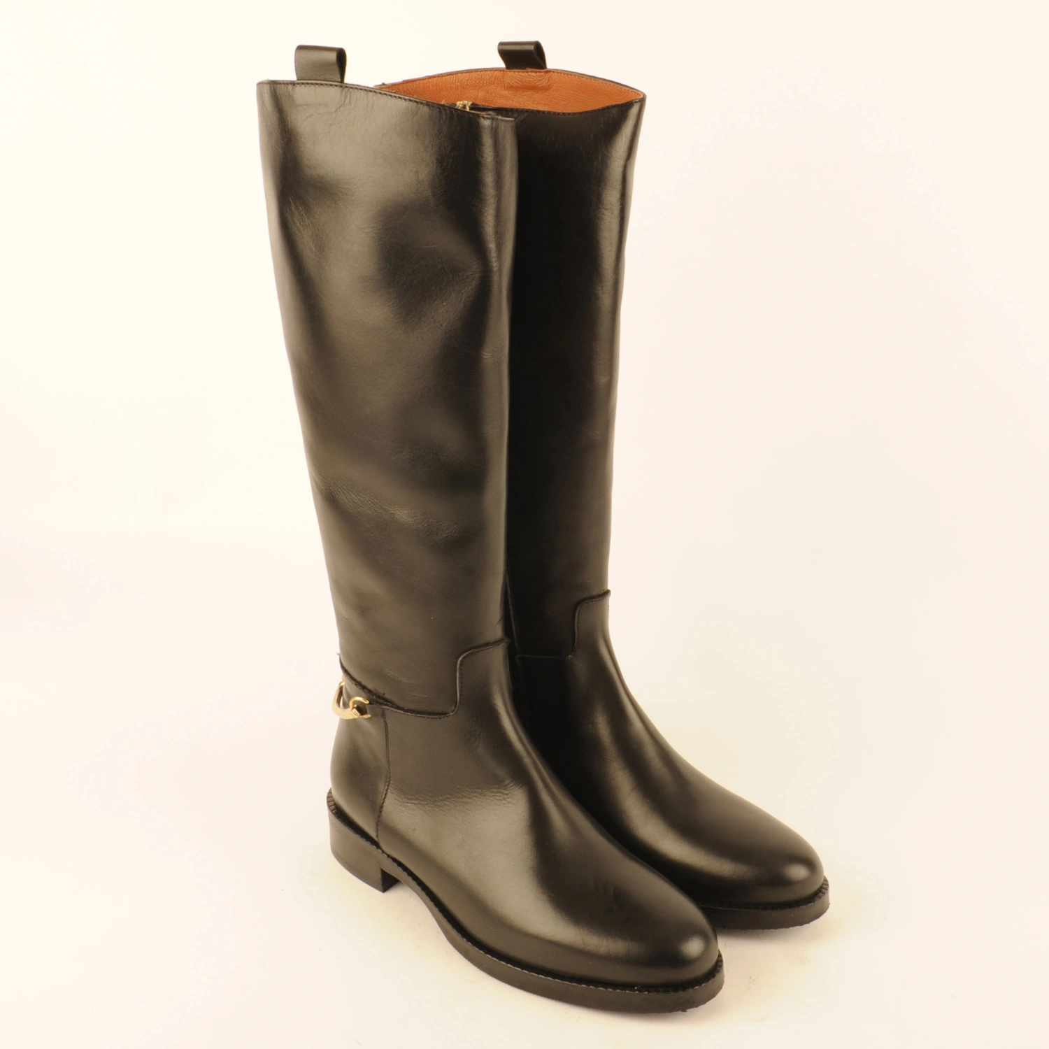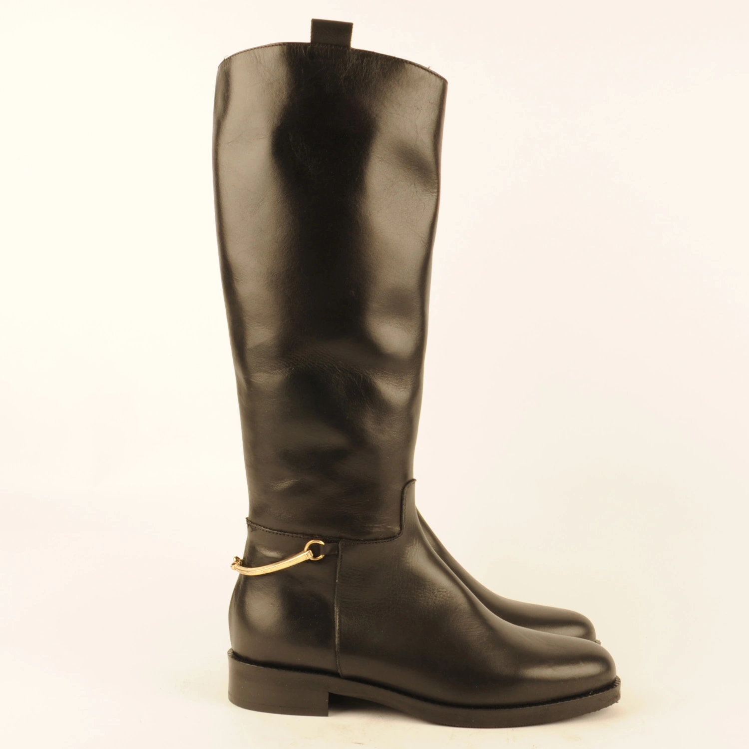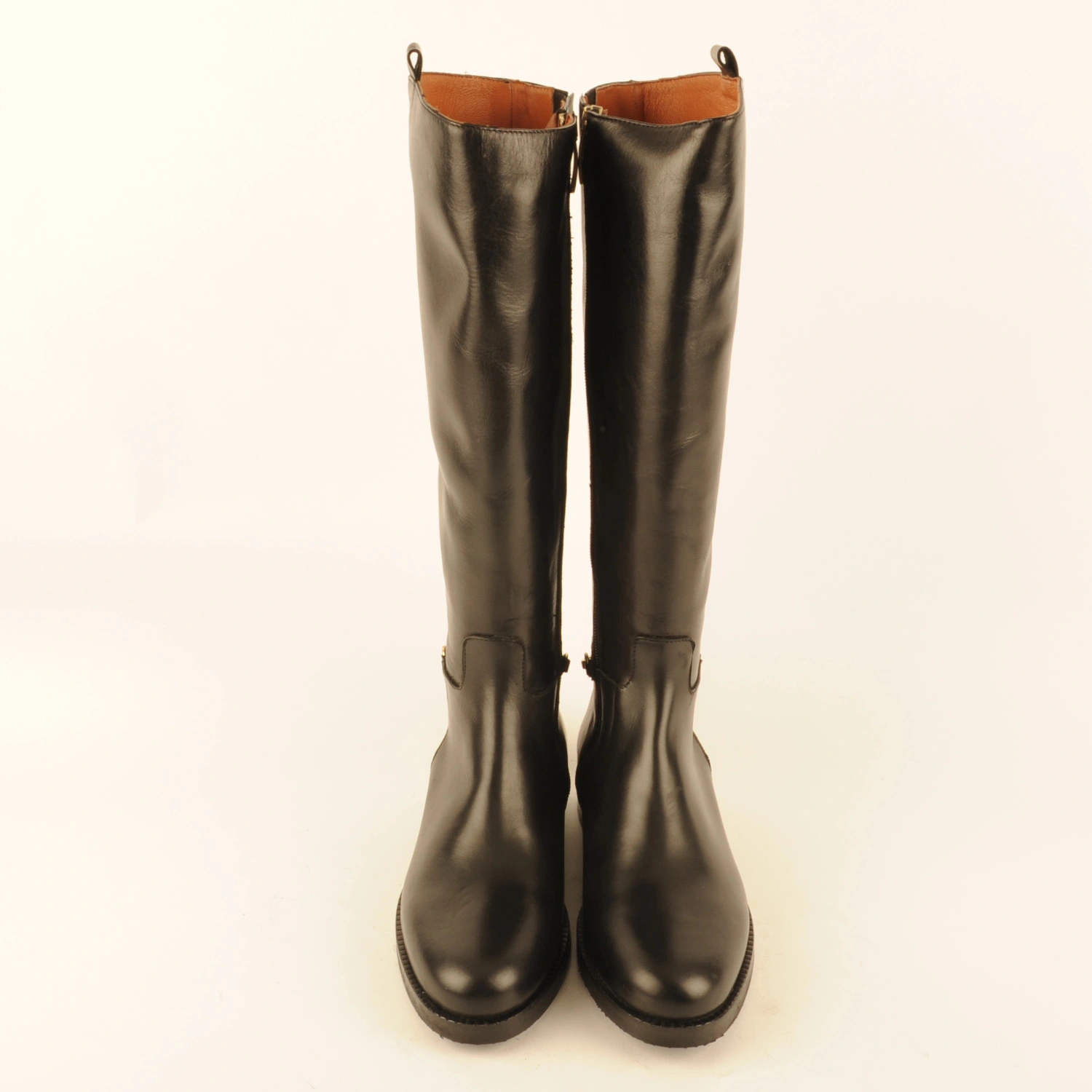 Prisca € 229.00 Colors Sizes 36 37 38 39 40 41 42 Quantity select a size to continue Product information Article number: 1624.10.6 Tall boot made of black leather with a gold-coloured detail in the heel. This boot is leather-lined and has a rubber sole with a 2-centimetre heel.