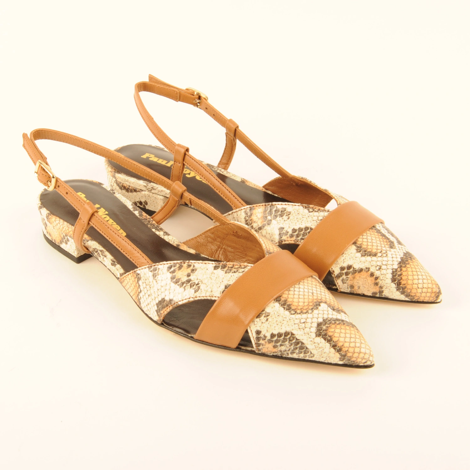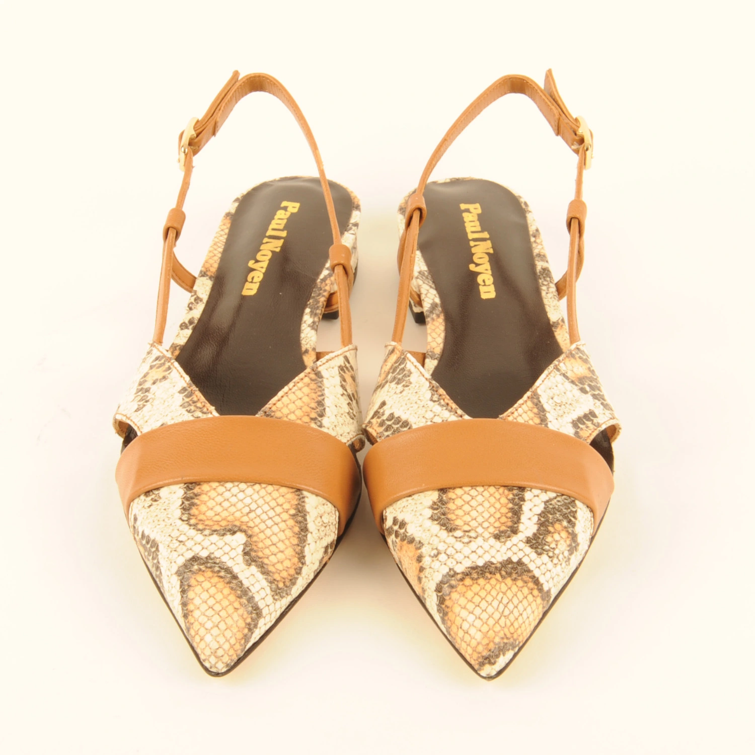 Giulia € 219.00 Colors Sizes 36 36+ 37 37+ 38 38+ 39 39+ 40 40+ 41 Quantity select a size to continue Product information Article number: 1214.60.2 Pointed slingback in a combination of snake-print leather and medium brown leather. This open-worked shoe is leather-lined and has a leather sole.