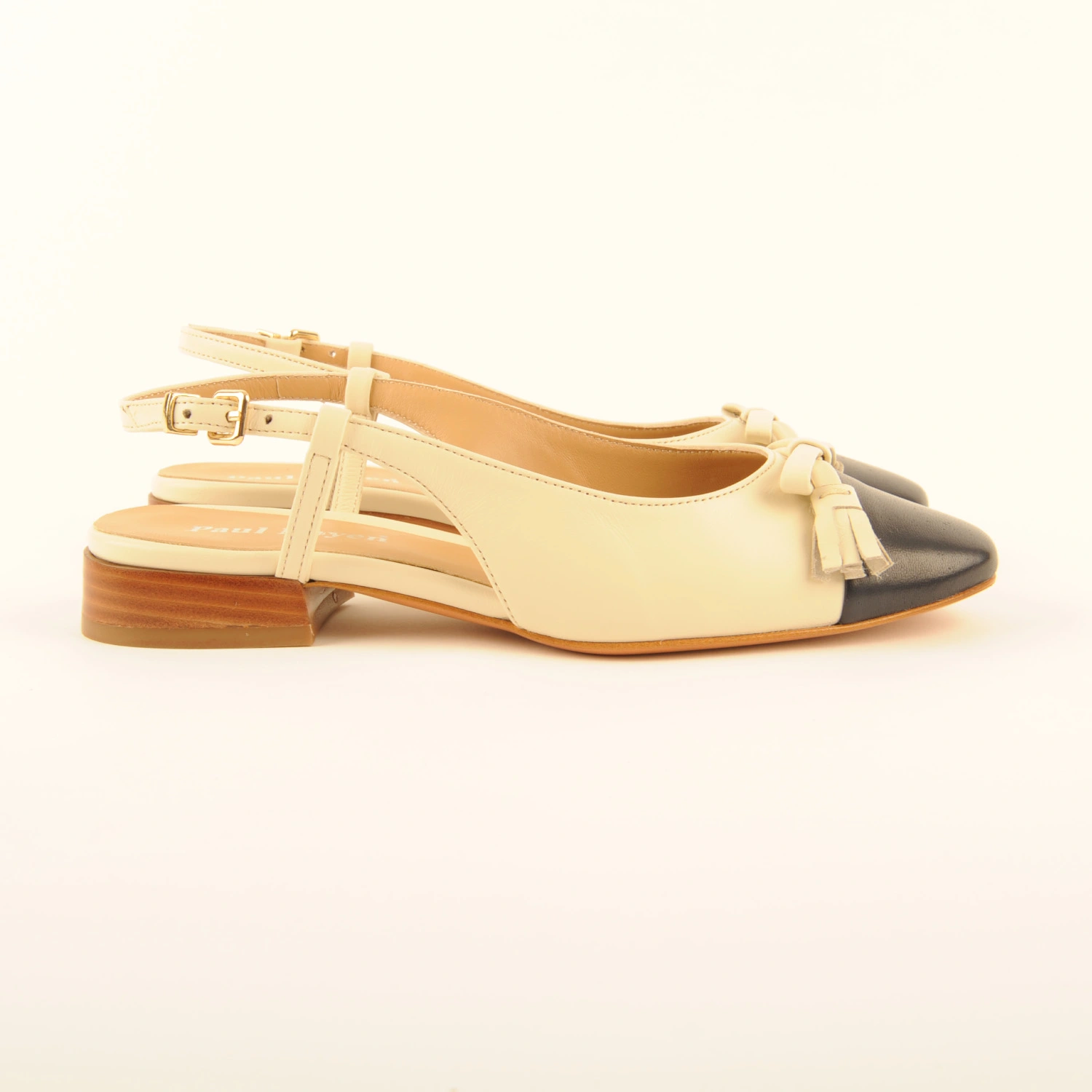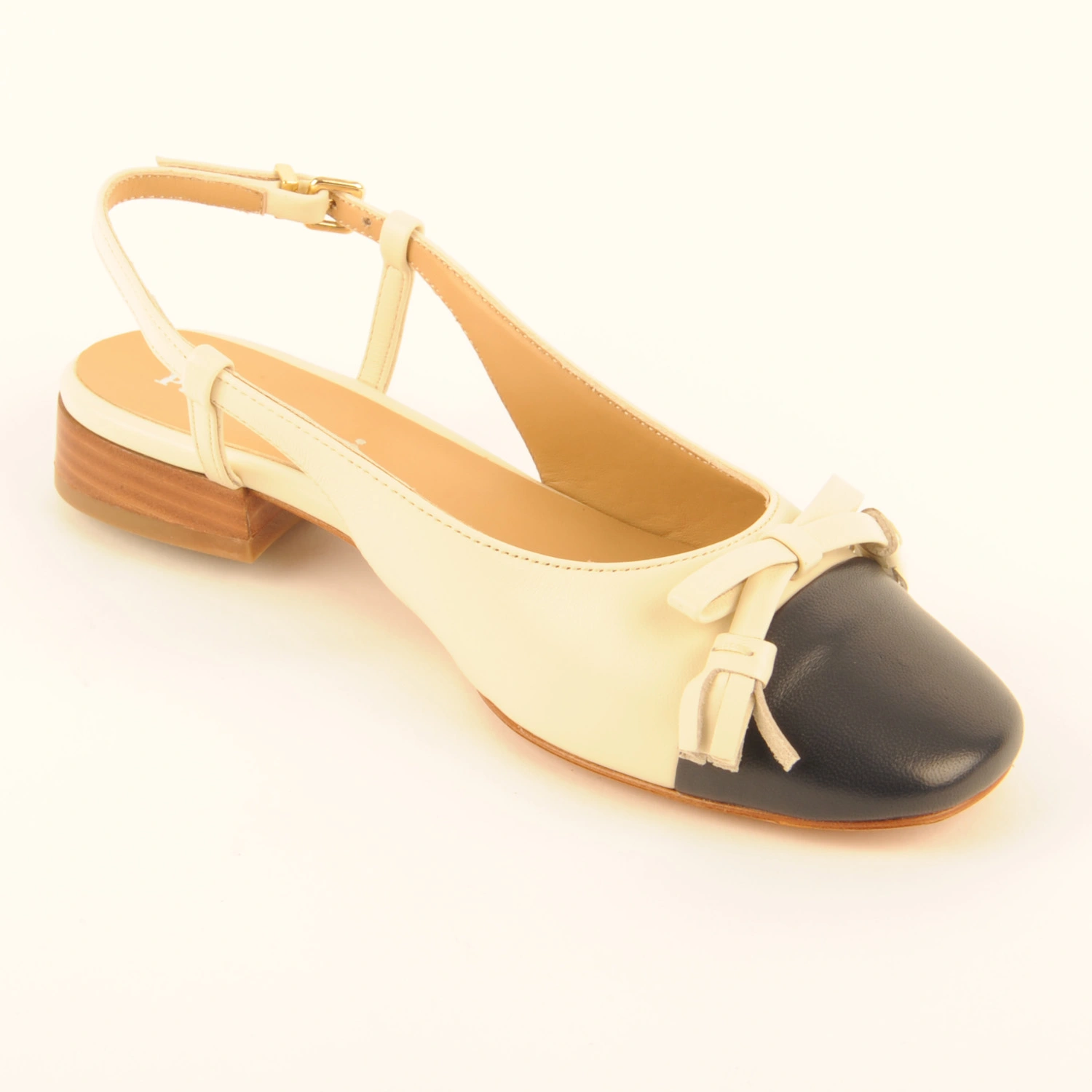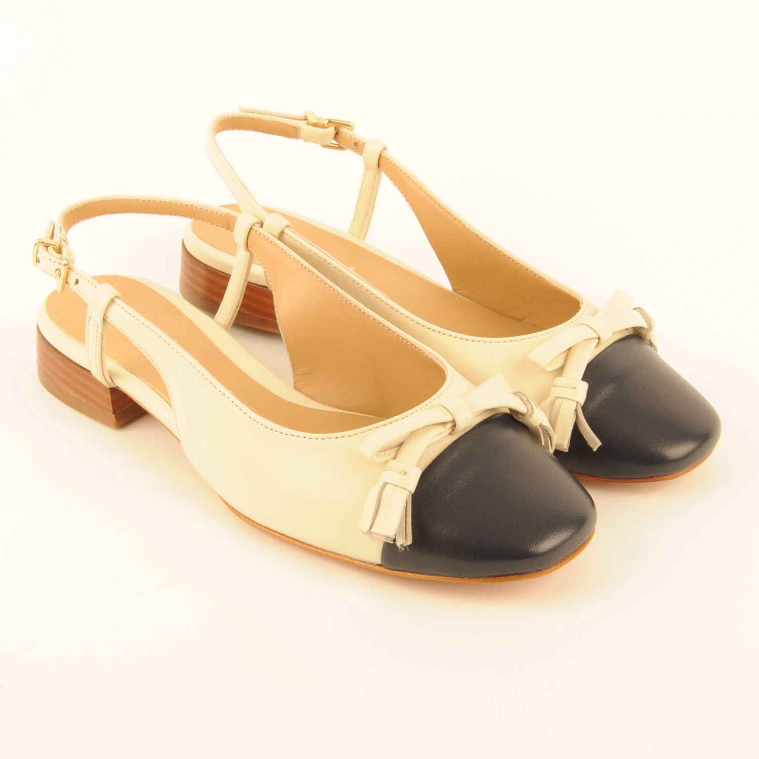 Noemi € 179.95 Colors Sizes 36 36+ 37 37+ 38 38+ 39 39+ 40 40+ 41 Quantity select a size to continue Product information Article number: 1724.20.4 Slingback ballerina made of off-white leather with a dark blue leather toe and an off-white leather bow. This ballerina is leather-lined, has a leather sole, and a 2-centimetre heel.