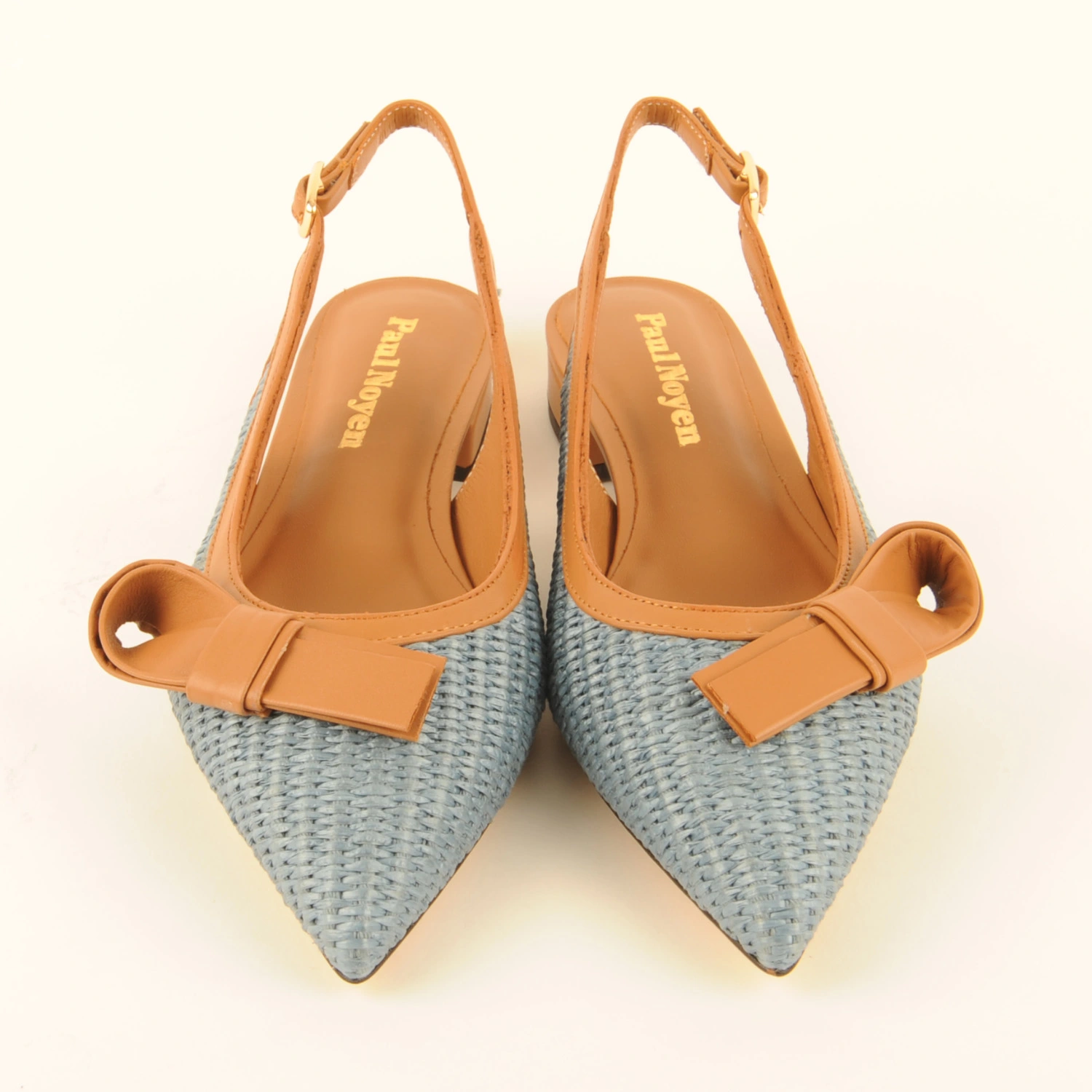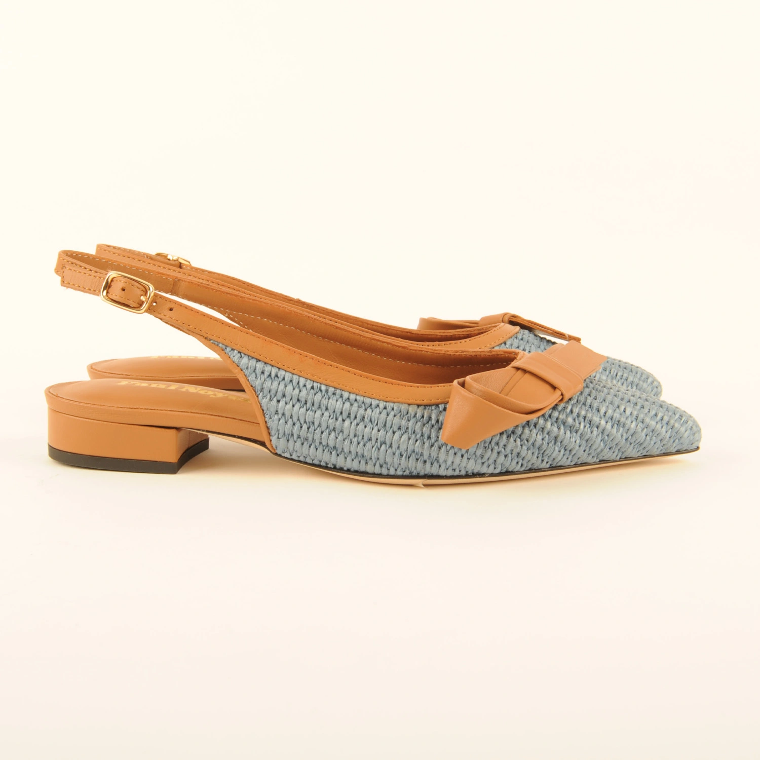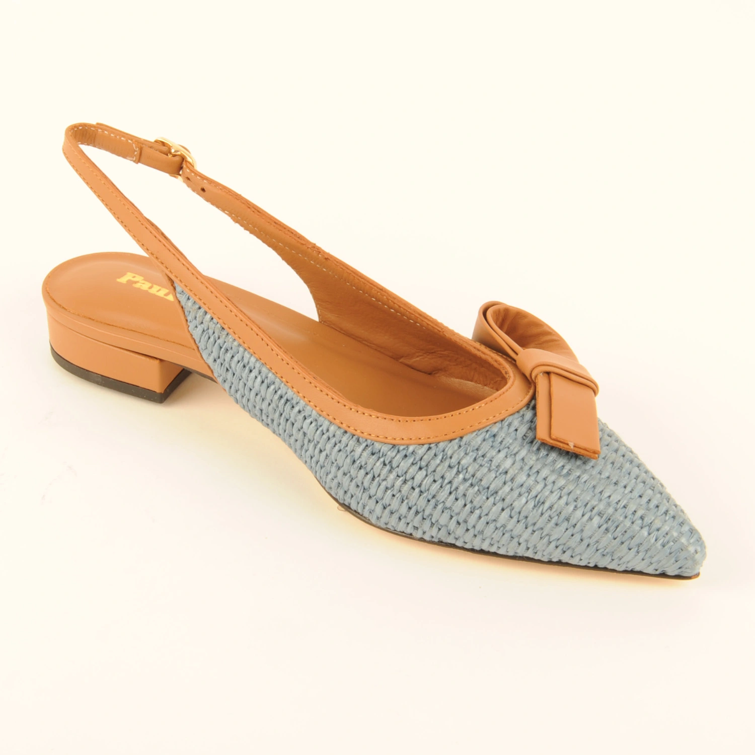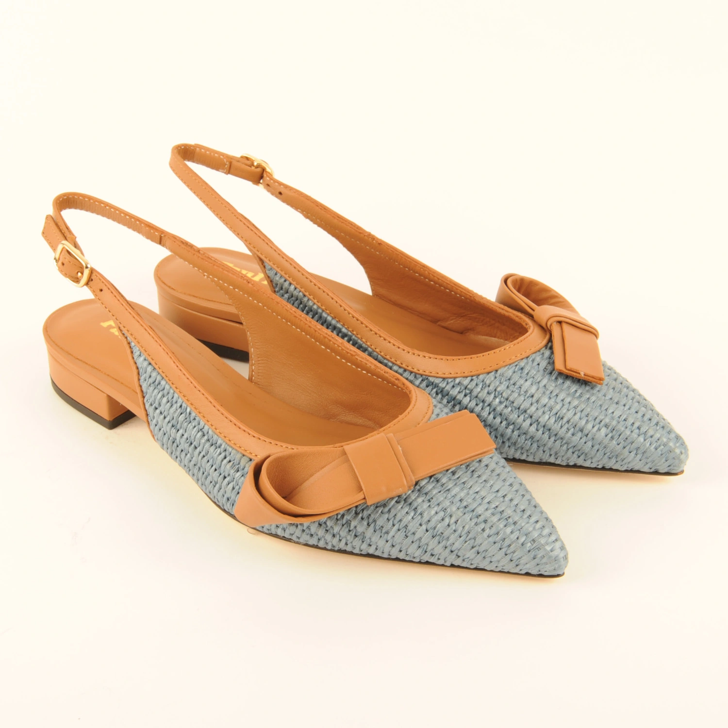 Jackie € 198.00 Colors Sizes 36 36+ 37+ 38 38+ 39 39+ 40 40+ 41 Quantity select a size to continue Product information Article number: 1217.20.1 Pointed slingback in a combination of blue raffia and medium brown leather, with a bow on the toe. This slingback is leather-lined and has a leather sole.