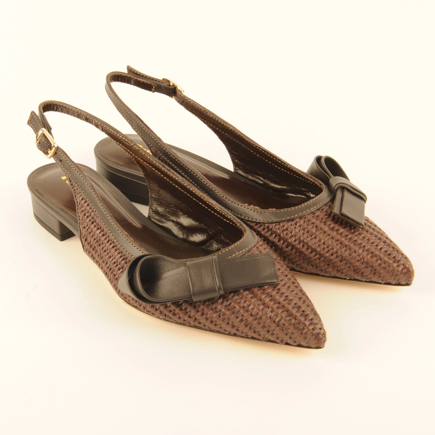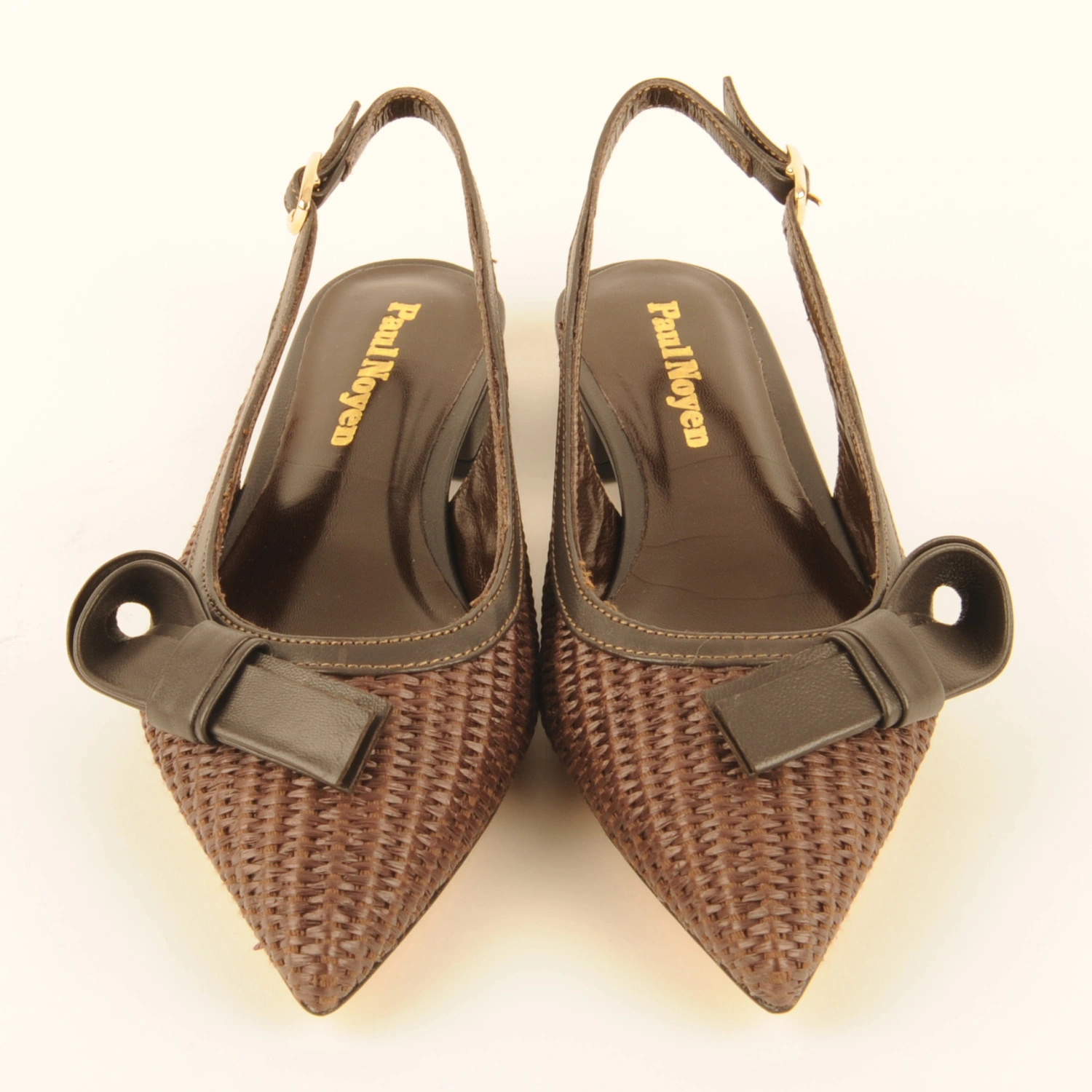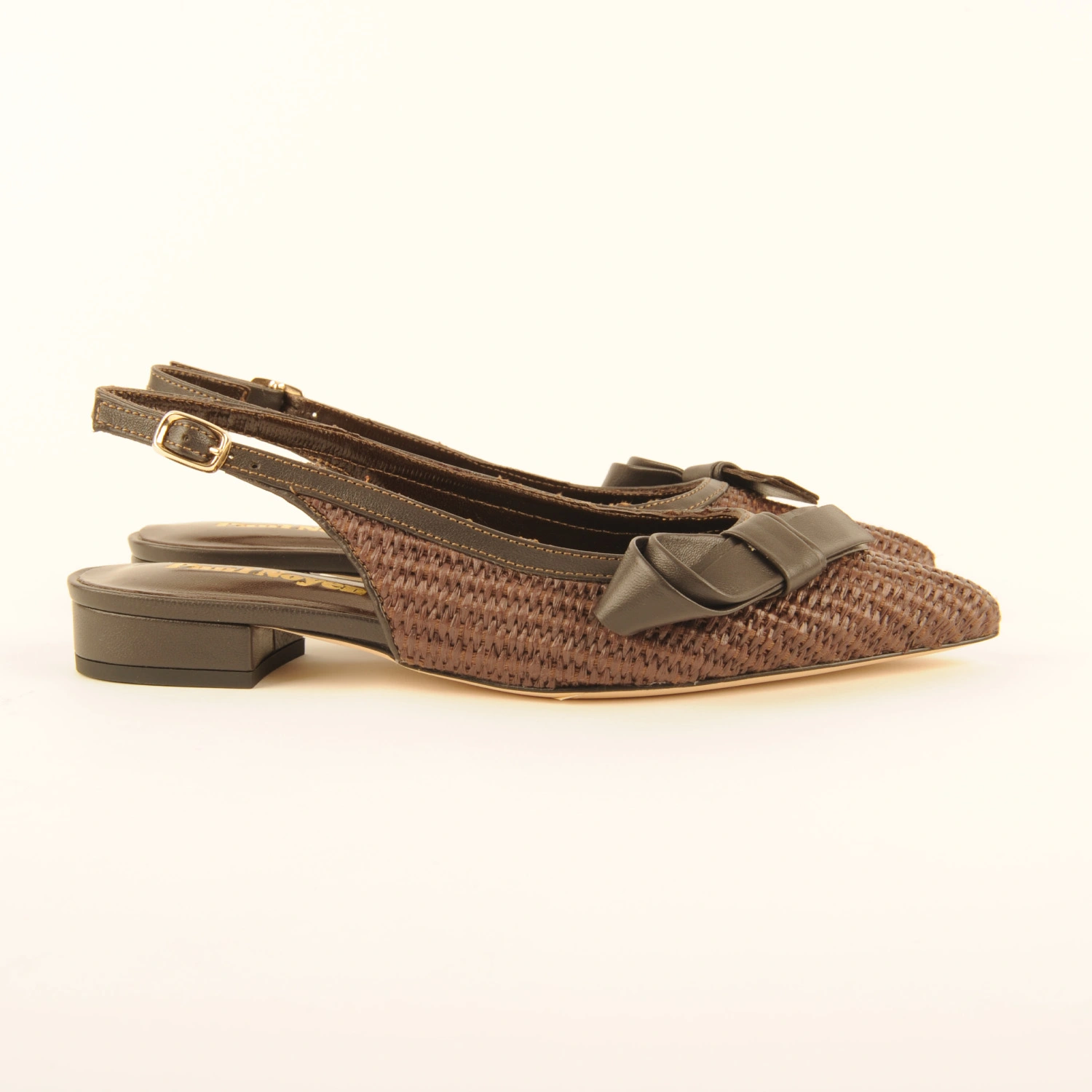 Jackie € 198.00 Colors Sizes 36 36+ 37 37+ 38 38+ 39 39+ 40 40+ 41 Quantity select a size to continue Product information Article number: 1217.50.1 Pointed slingback in a combination of dark brown raffia and dark brown leather, with a bow on the toe. This slingback is leather-lined and has a leather sole.