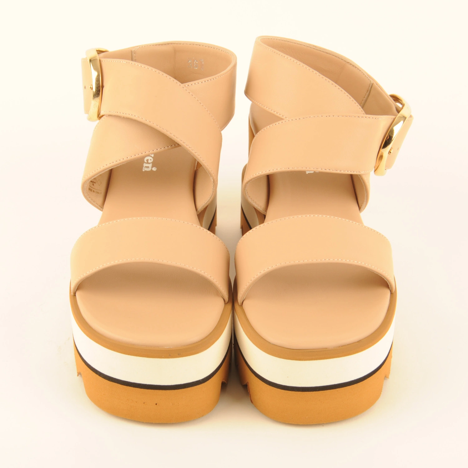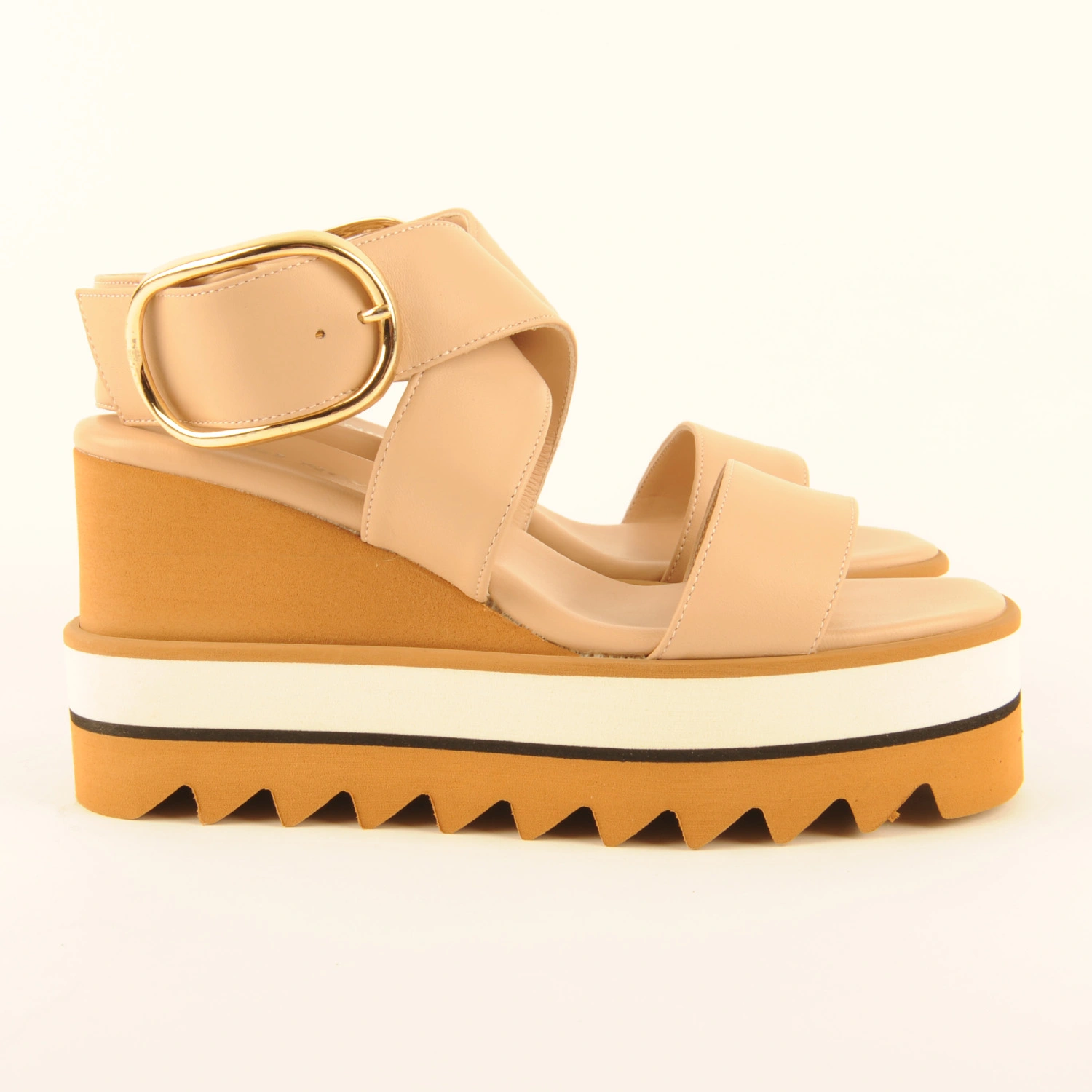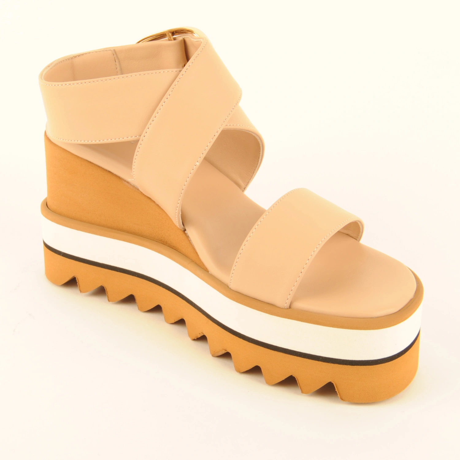 Sandal made of beige leather with an ankle strap and a large gold-coloured buckle, set on a thick beige and white rubber platform sole with a black stripe. This sandal is leather-lined. The platform sole is approximately 4.5 centimetres thick, with an additional wedge heel of about 4.5 centimetres, resulting in a total heel height of approximately 9 centimetres.