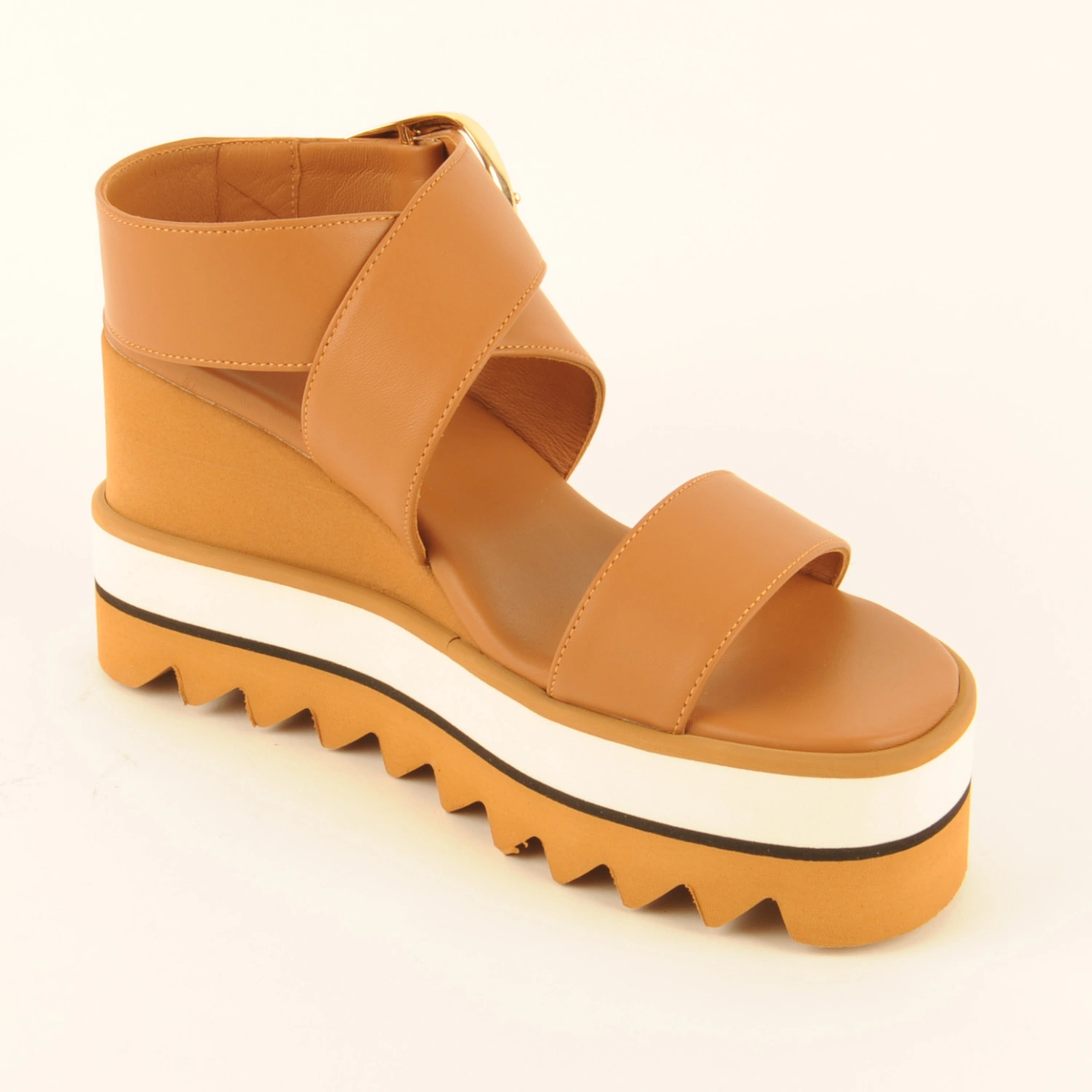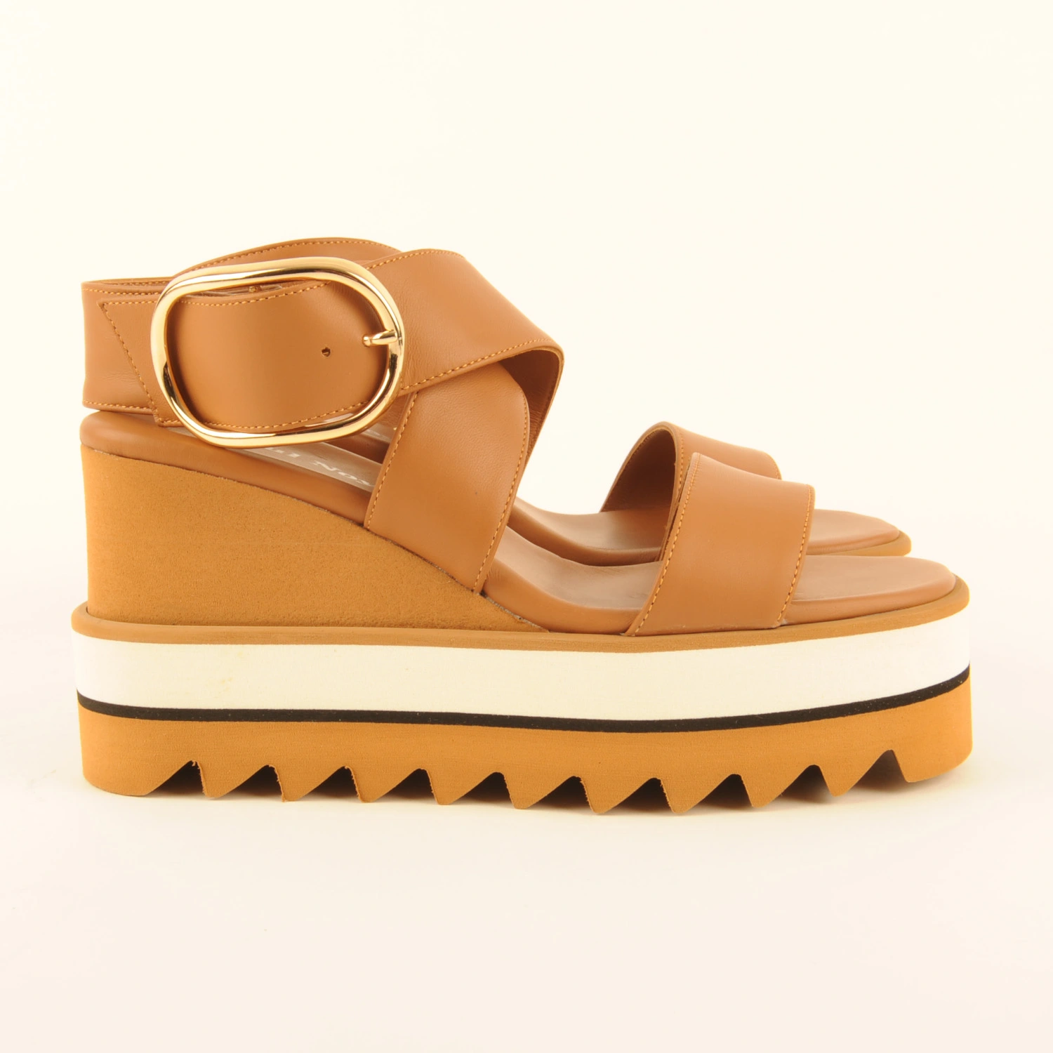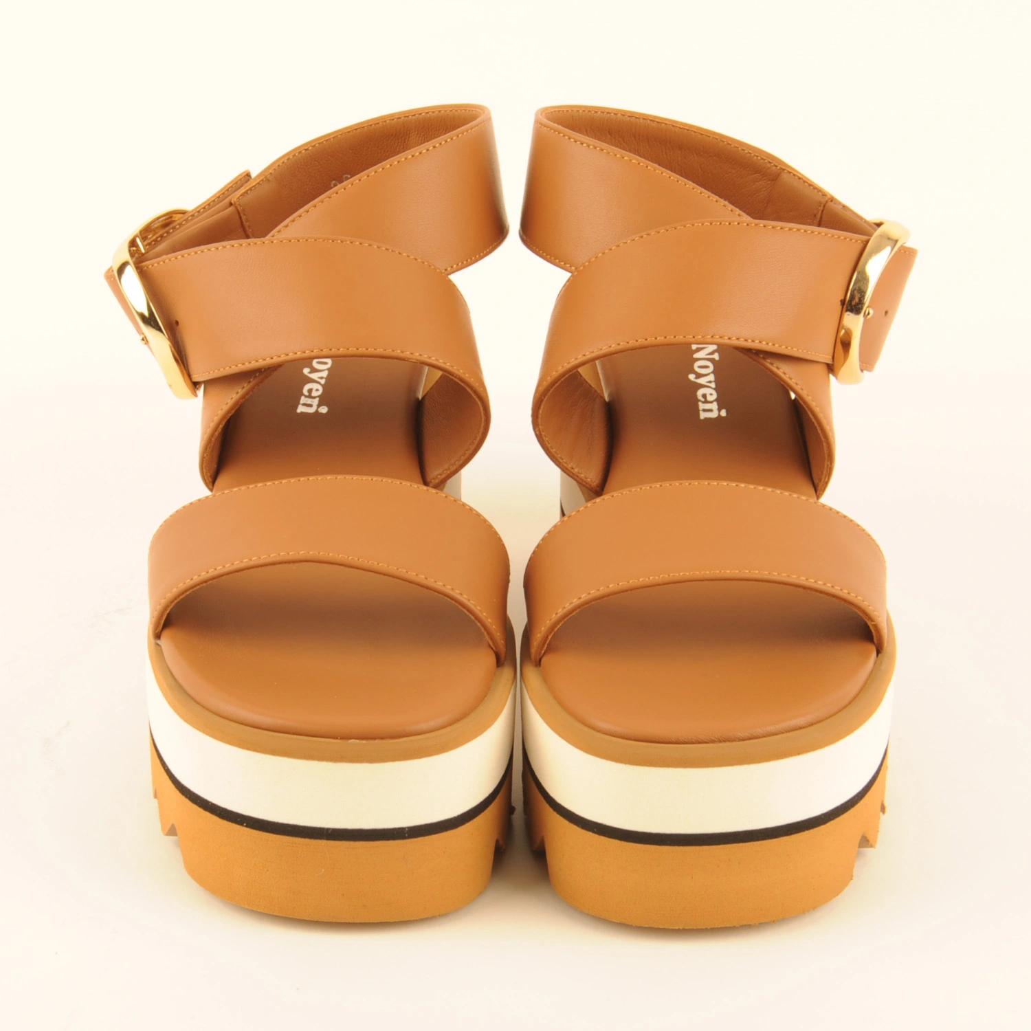 Sandal made of medium brown leather with an ankle strap and a large gold-coloured buckle, set on a thick medium brown and white rubber platform sole with a black stripe. This sandal is leather-lined. The platform sole is approximately 4.5 centimetres thick, with an additional wedge heel of about 4.5 centimetres, resulting in a total heel height of approximately 9 centimetres.