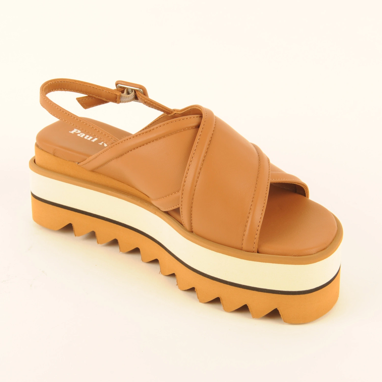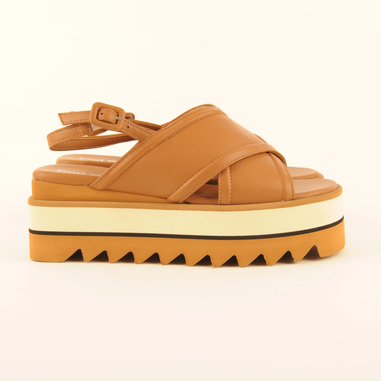 Sandal made of medium brown leather with wide crossed straps and a slingback, set on a thick medium brown and white rubber platform sole with a black stripe. This sandal is leather-lined and the platform sole is approximately 4.5 centimetres thick.