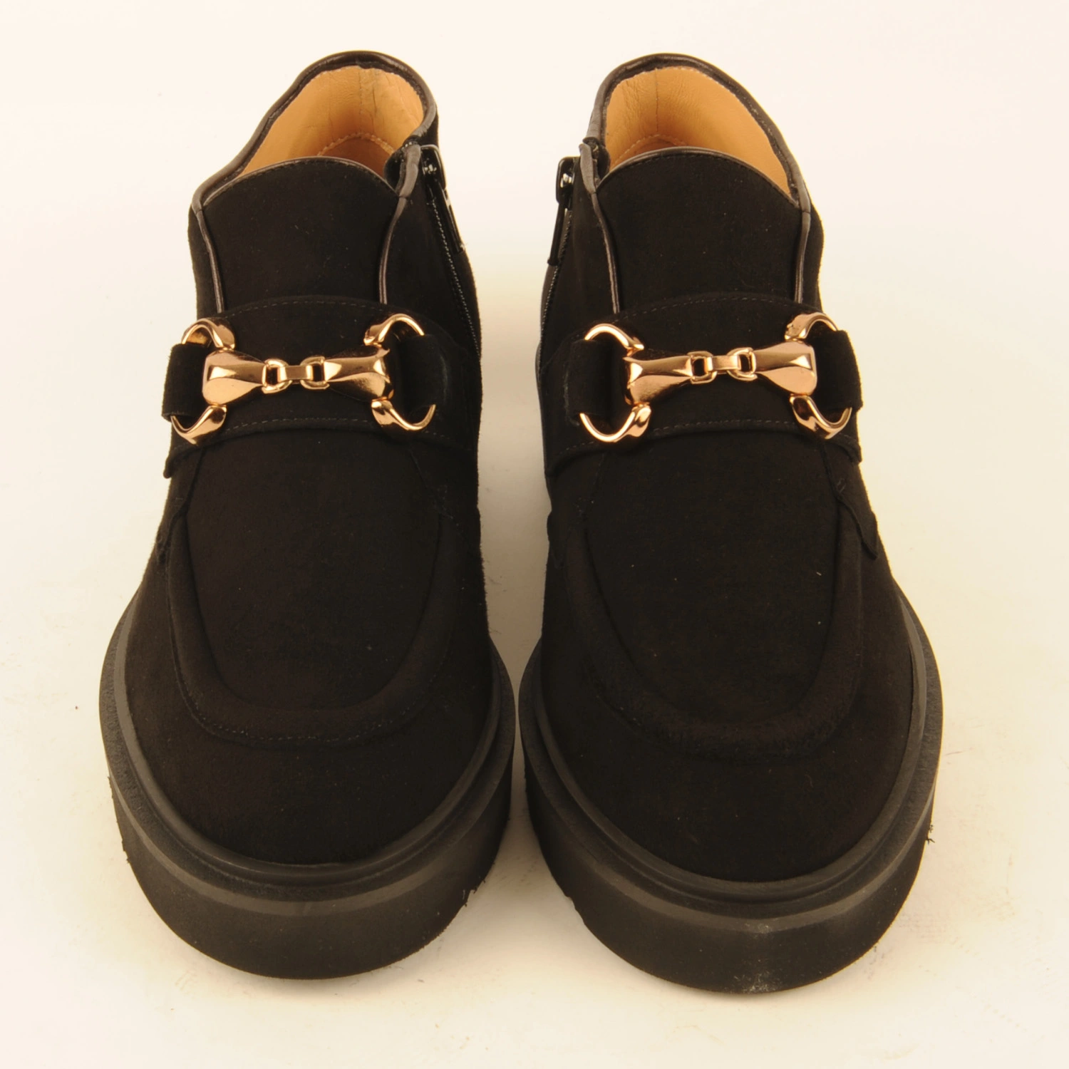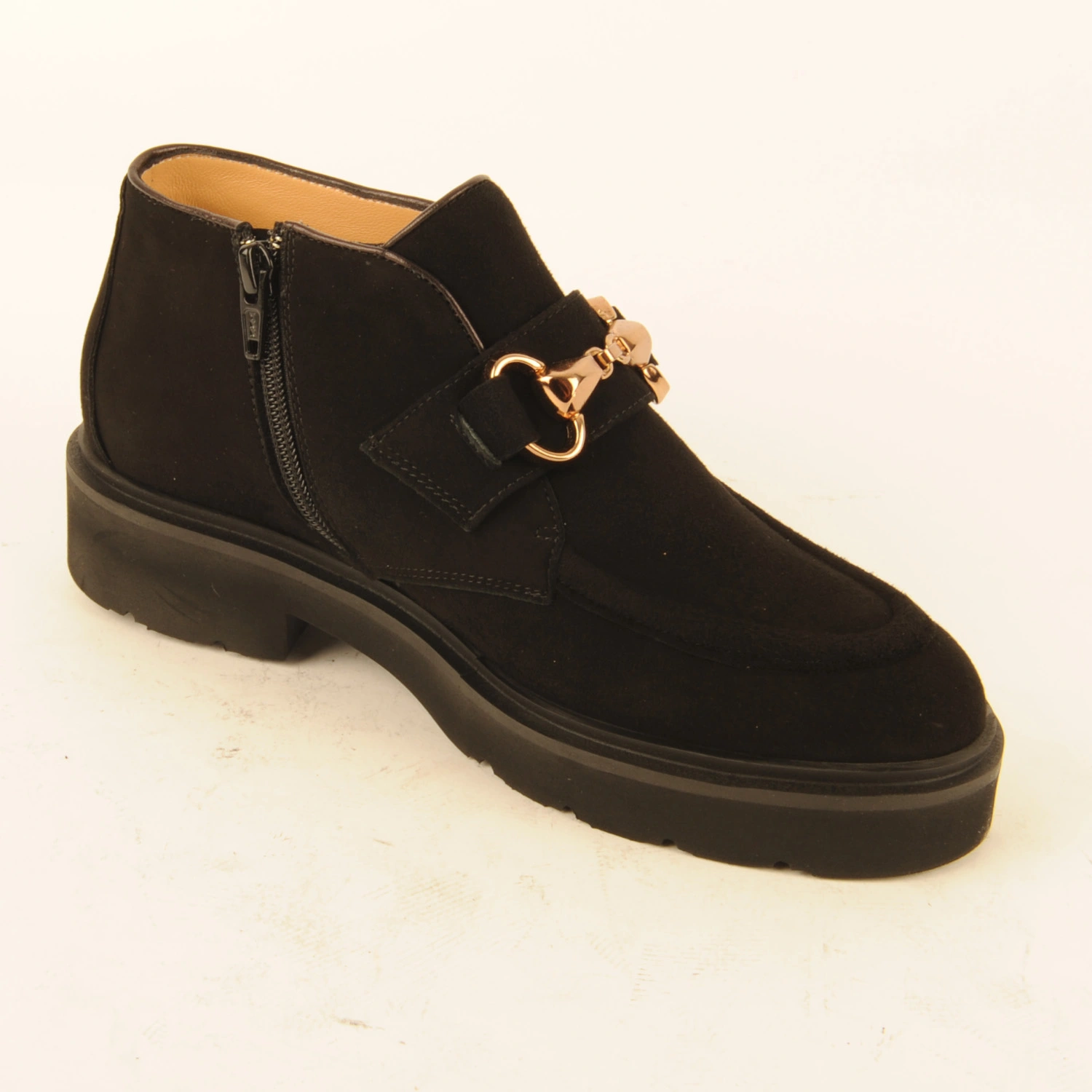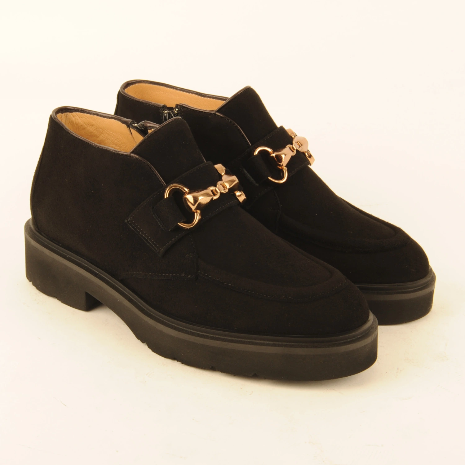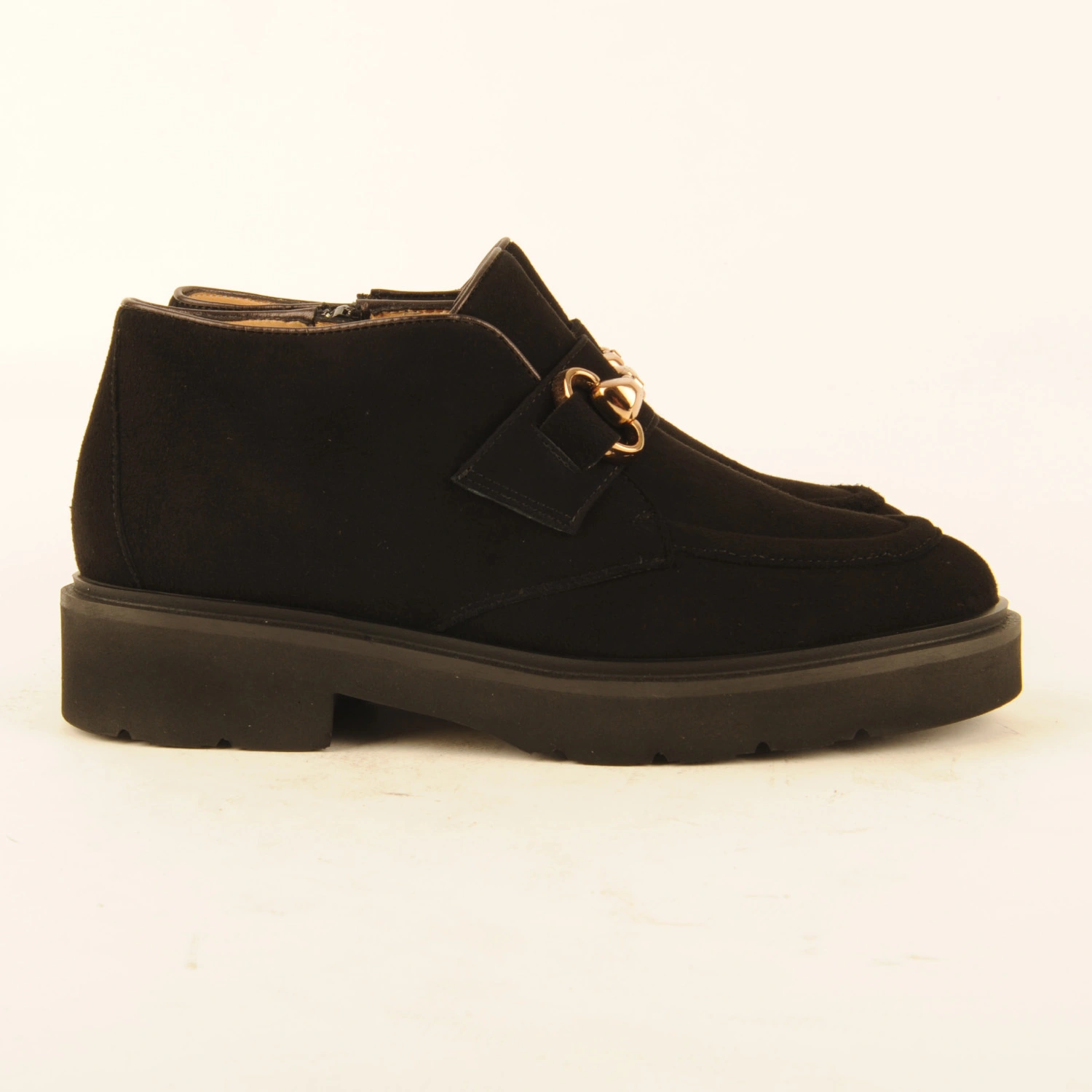 Caterina € 259.00 Colors Sizes 36 36+ 37 37+ 38 38+ 39 39+ 40 40+ 41 Quantity select a size to continue Product information Article number: 1531.10.67 Short ankle boot or high-cut shoe made of black suede with a gold-coloured accessory on the instep. The piping is finished with dark brown leather. This ankle boot is leather-lined and has a rubber sole.