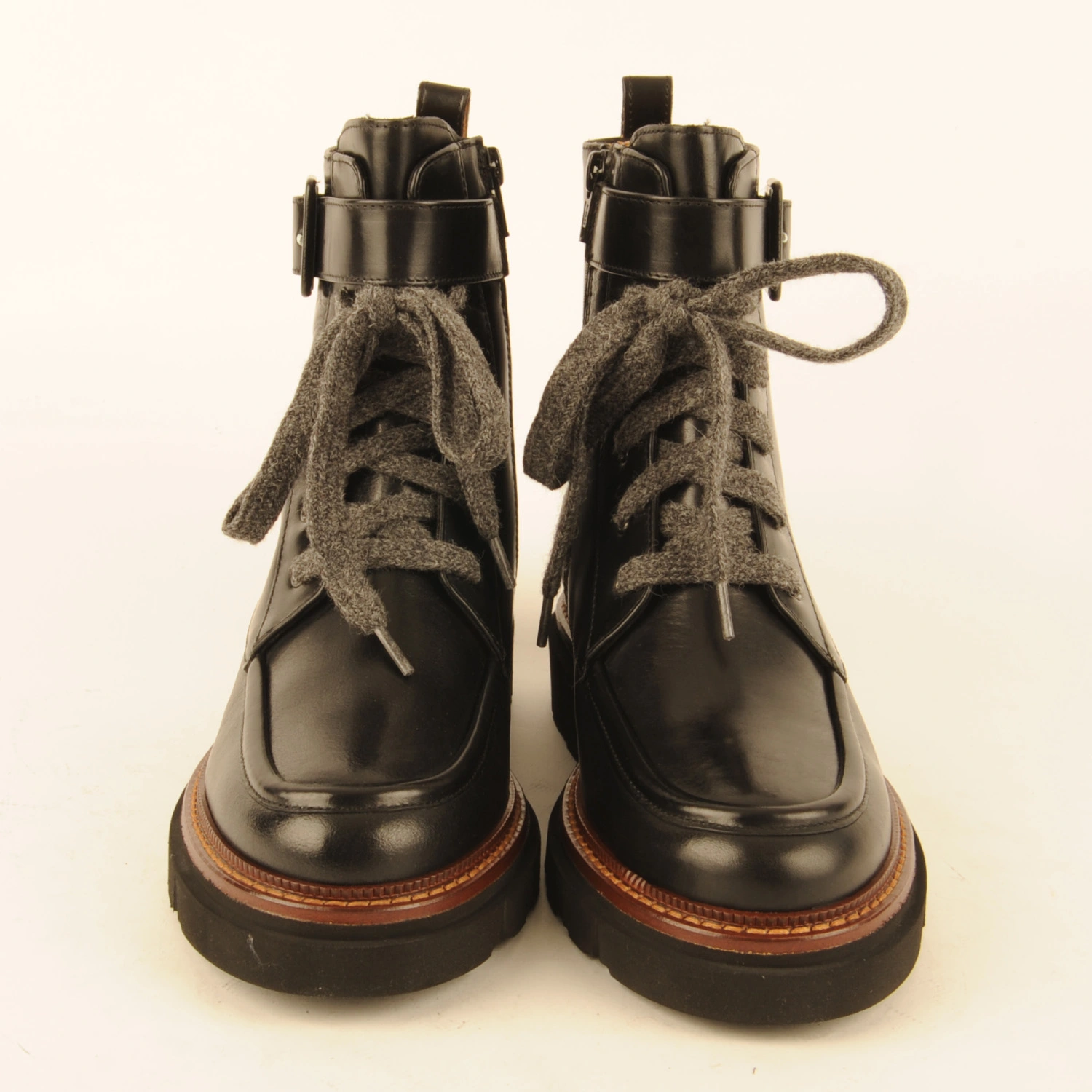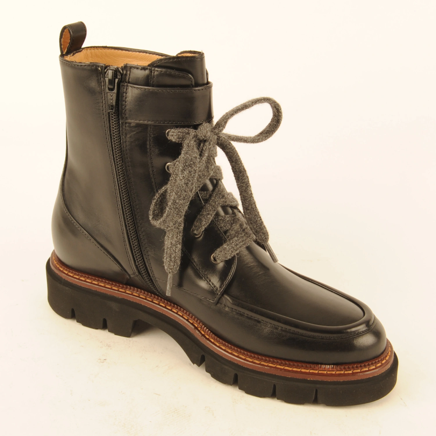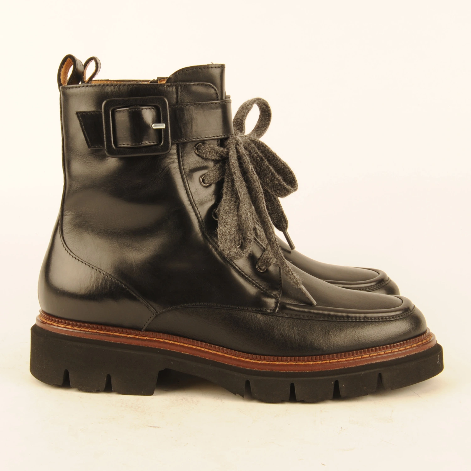 Zulema € 289.00 Colors Sizes 37 37+ 38 38+ 39 39+ 40+ 41 Quantity select a size to continue Product information Article number: 1534.10.26 Ankle boot made of black calf leather with piping and an ankle strap with grey fabric laces. This boot is leather-lined and has a rubber lug sole.