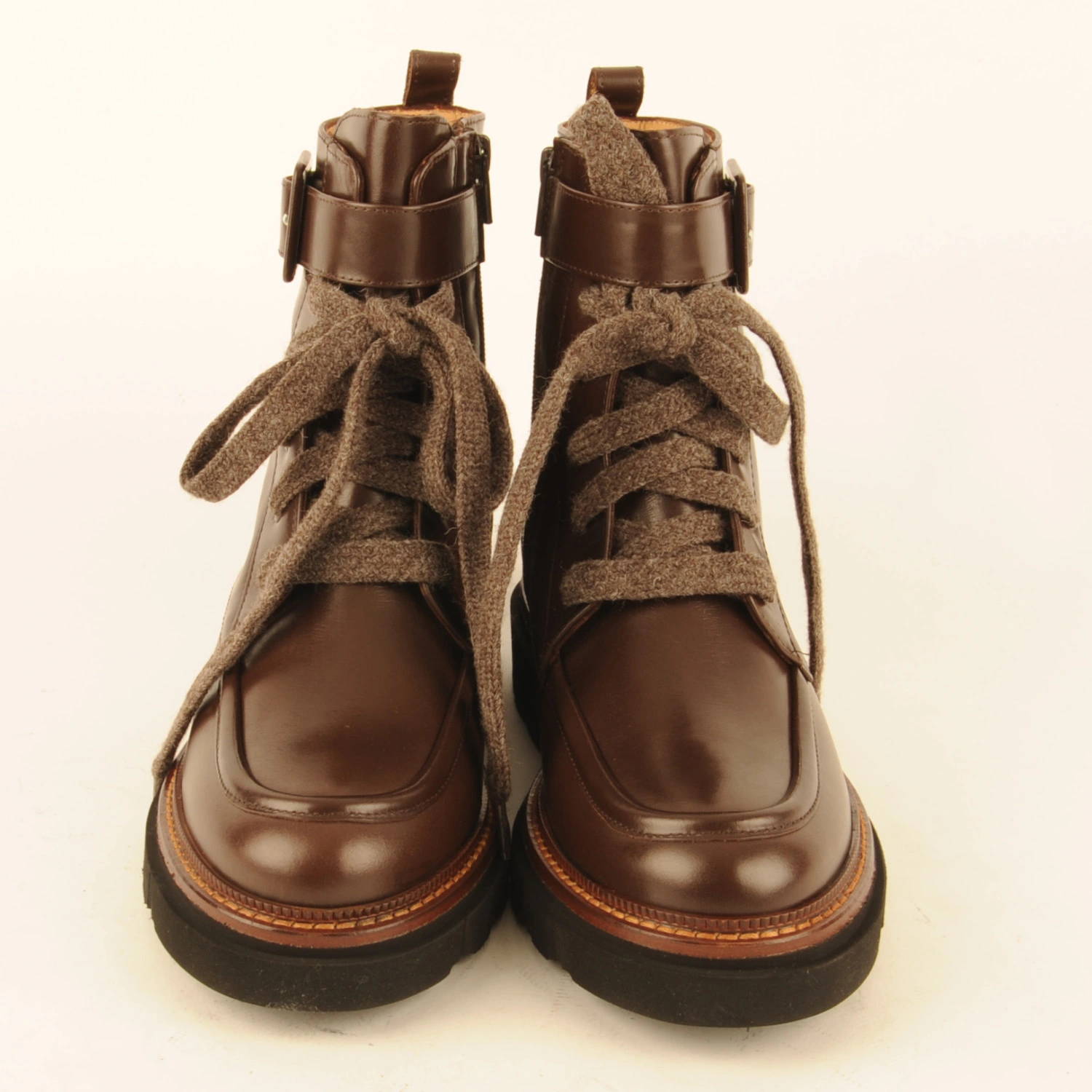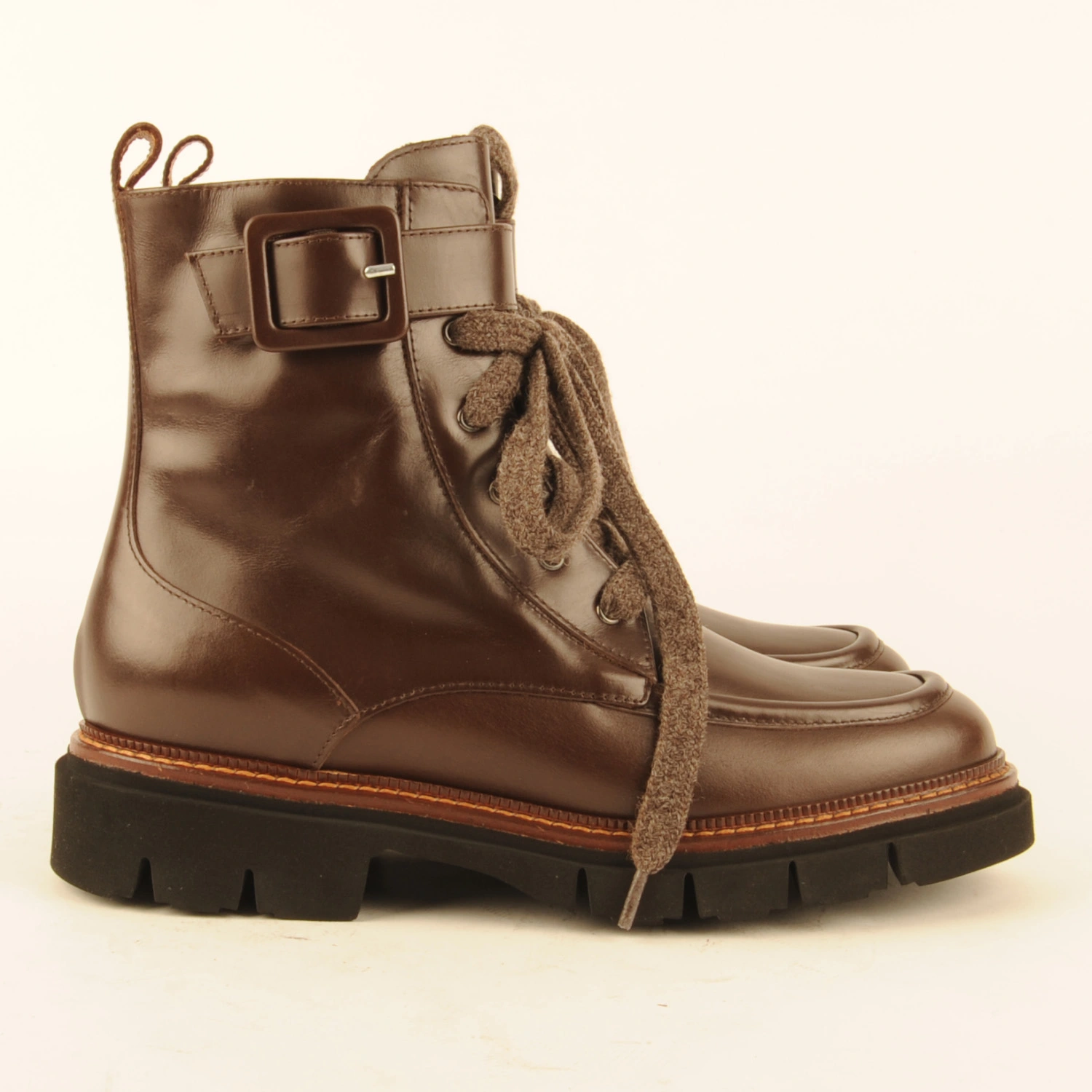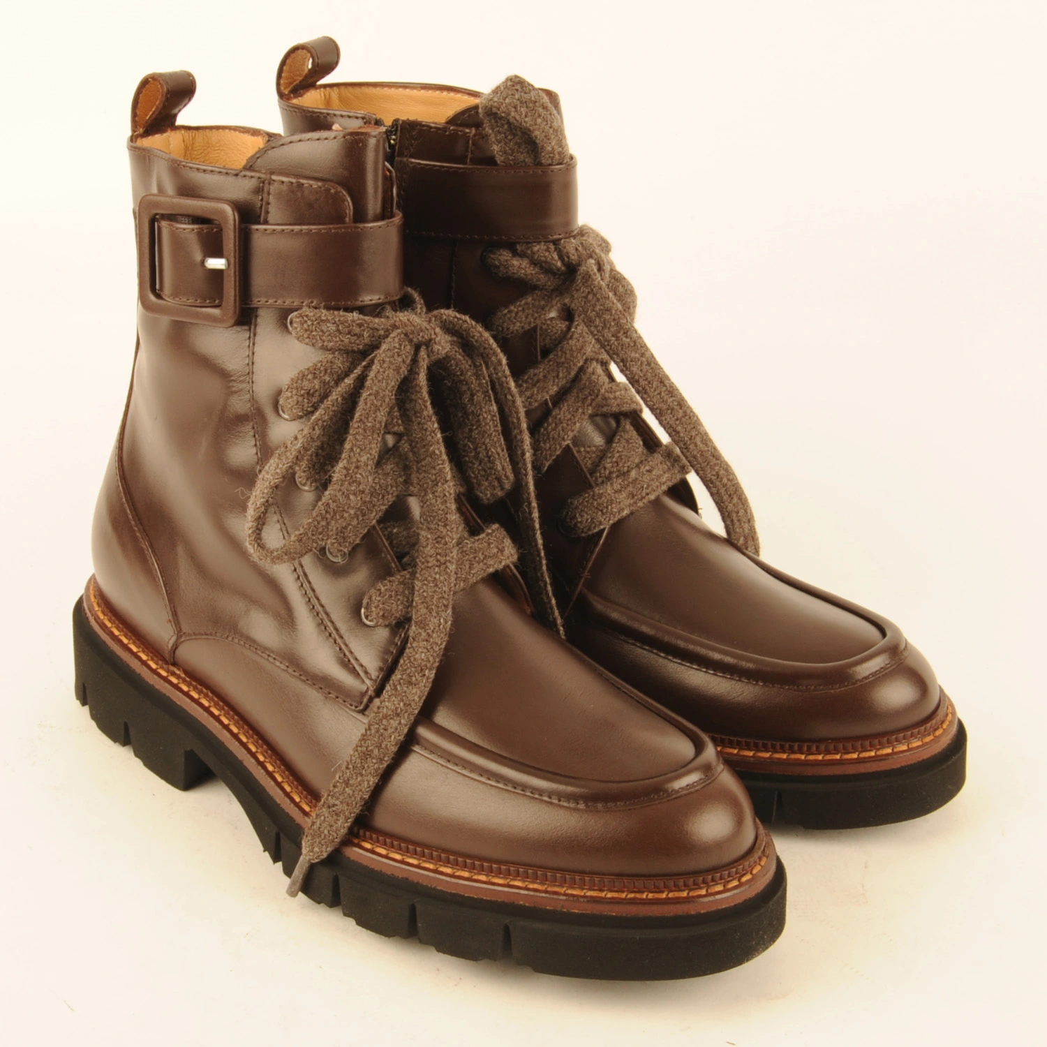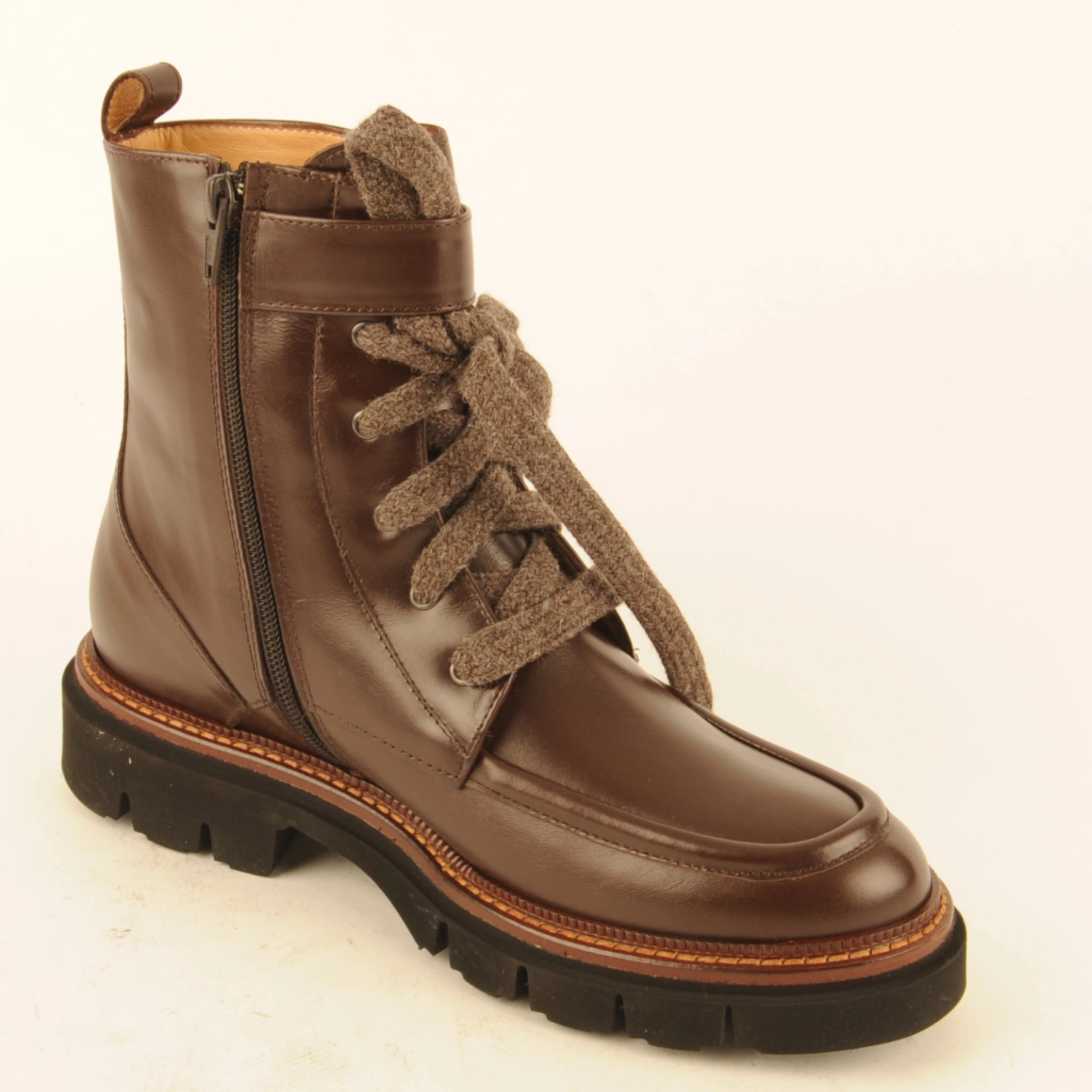 Zulema € 289.00 Colors Sizes 37 37+ 38 38+ 39 39+ 40 40+ 41 Quantity select a size to continue Product information Article number: 1534.50.17 Ankle boot made of dark brown calf leather with piping and an ankle strap with grey fabric laces. This boot is leather-lined and has a rubber lug sole.