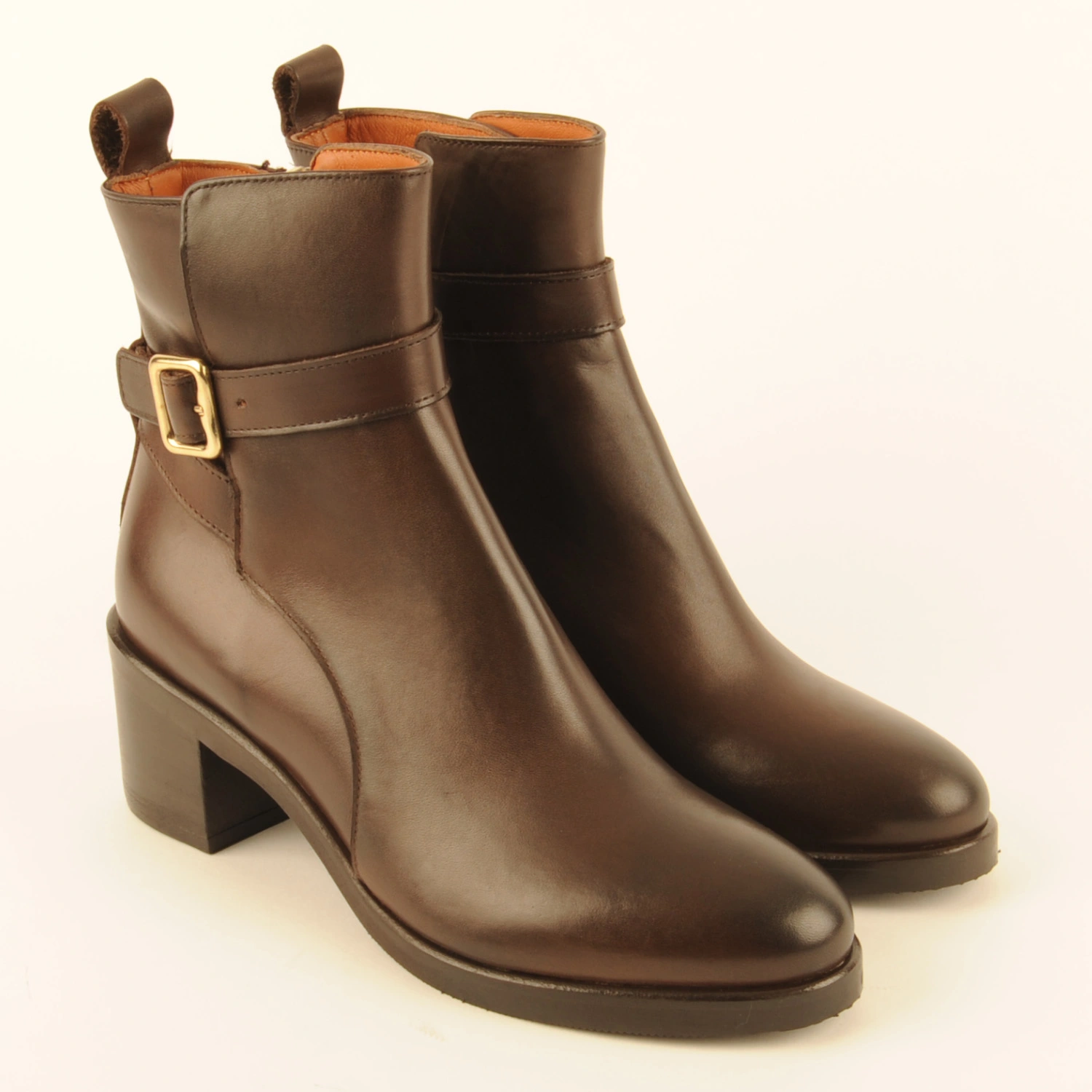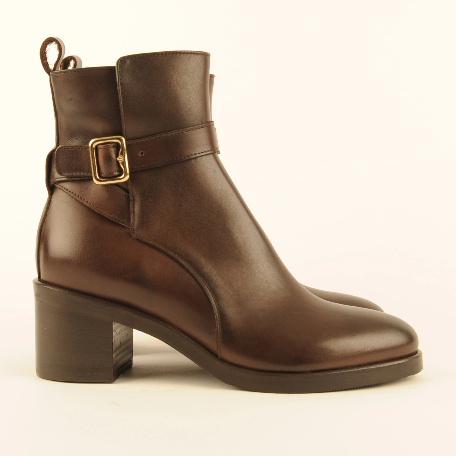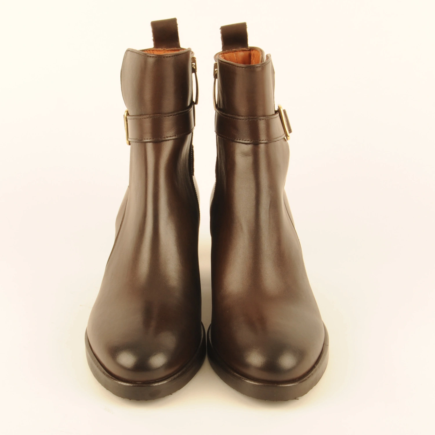 Enkellaars van donkerbruin leer met een goudkleurig gespje op de enkel. Dit laarsje is leer gevoerd en heeft een rubberen zool met een blokhak van 5 centimeter.