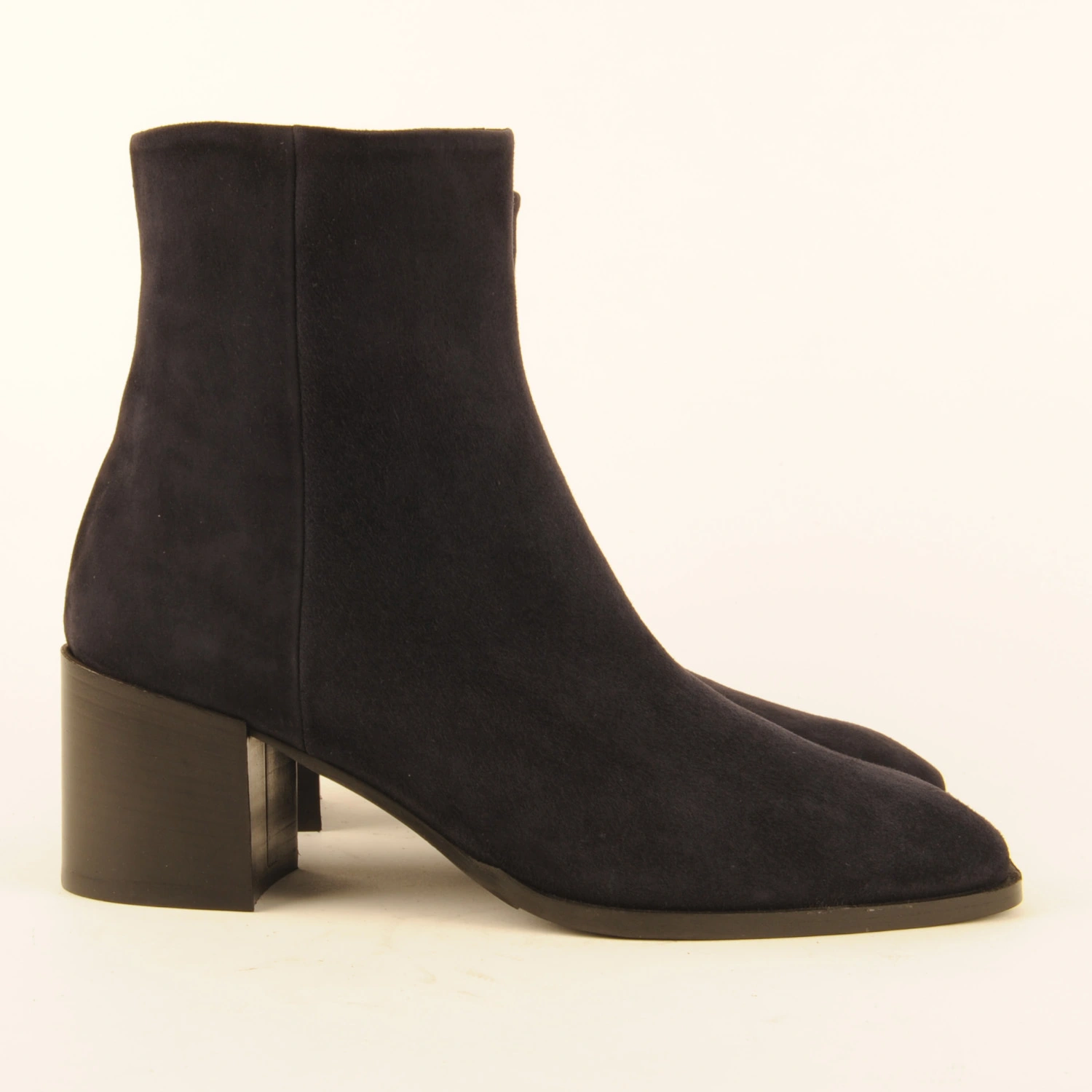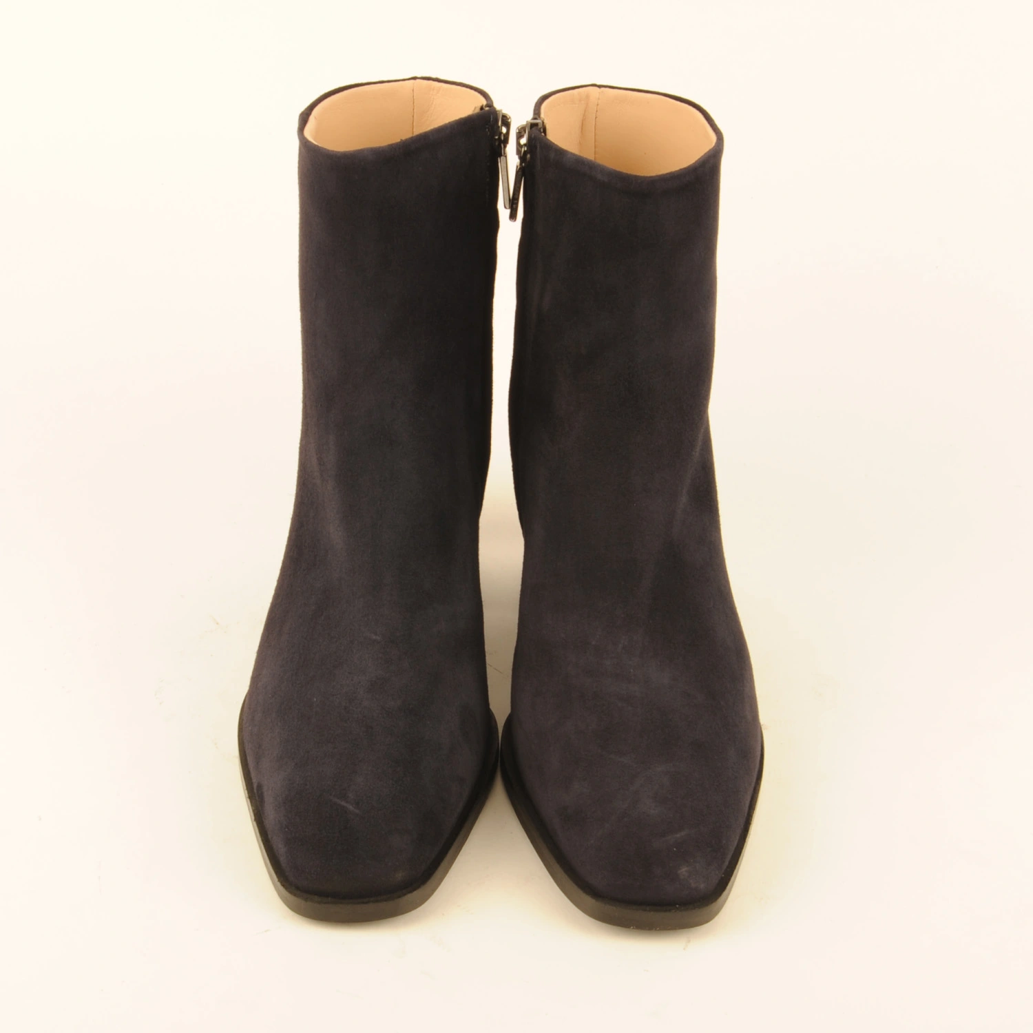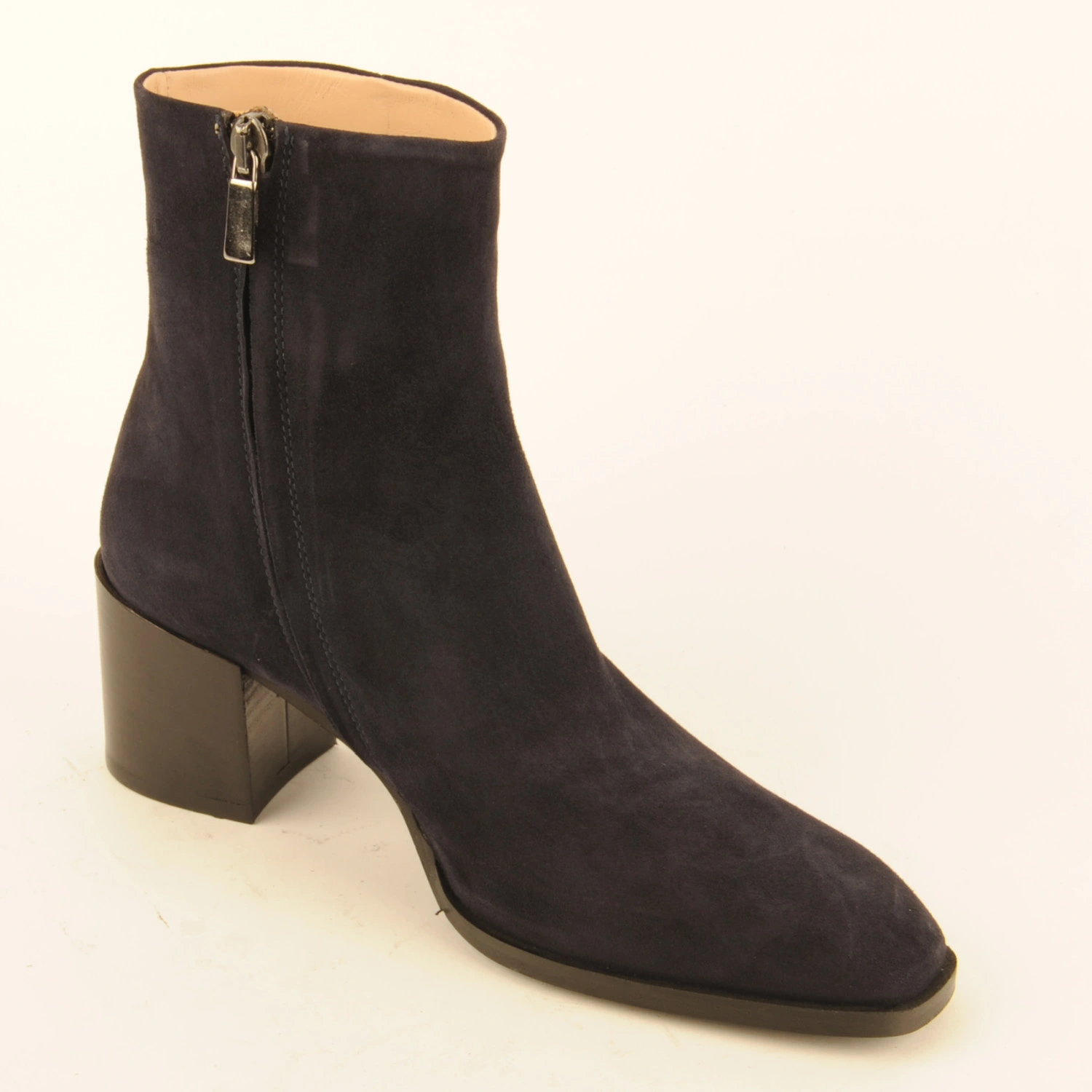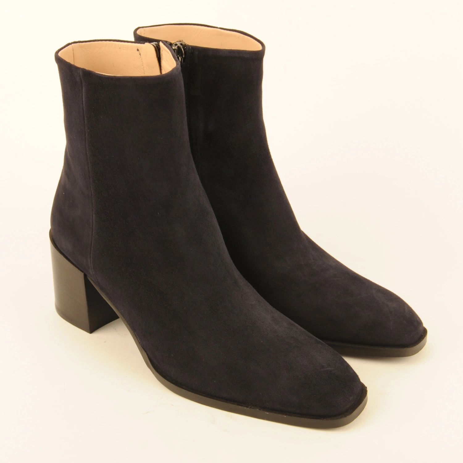 Enkellaars van donkerblauw suède met een carrè-leest. Dit laarsje is leer gevoerd en heeft een rubberen zool en een hak van 6 centimeter.