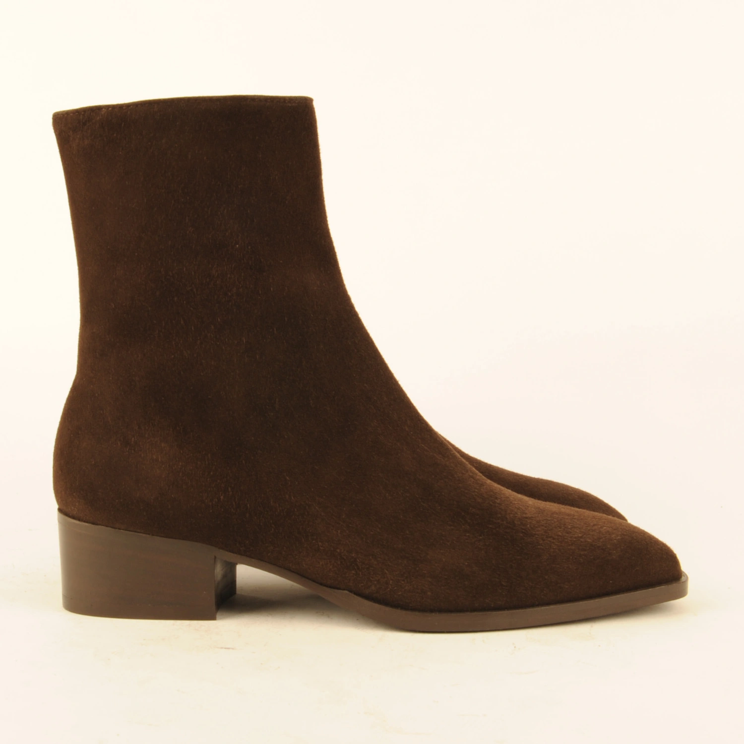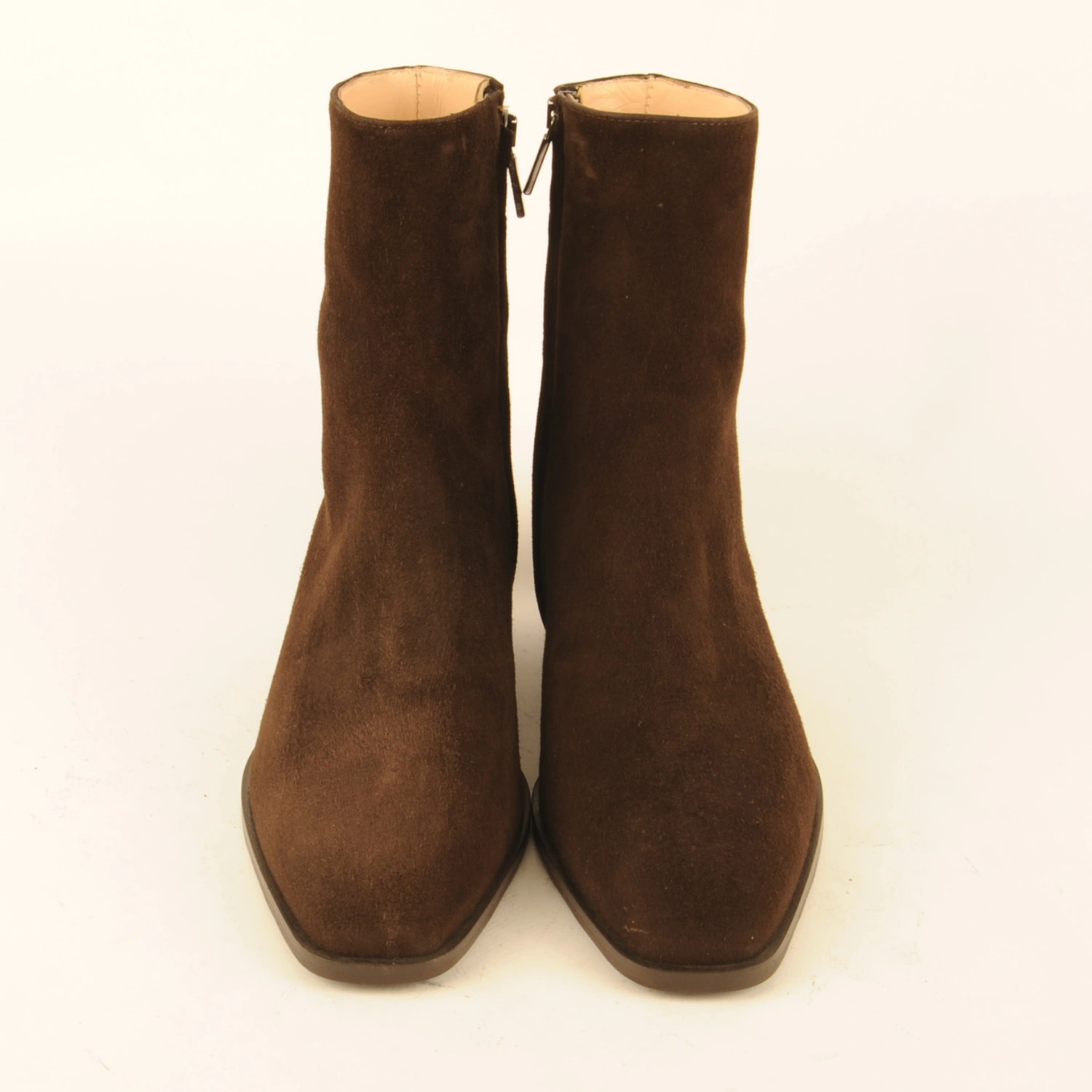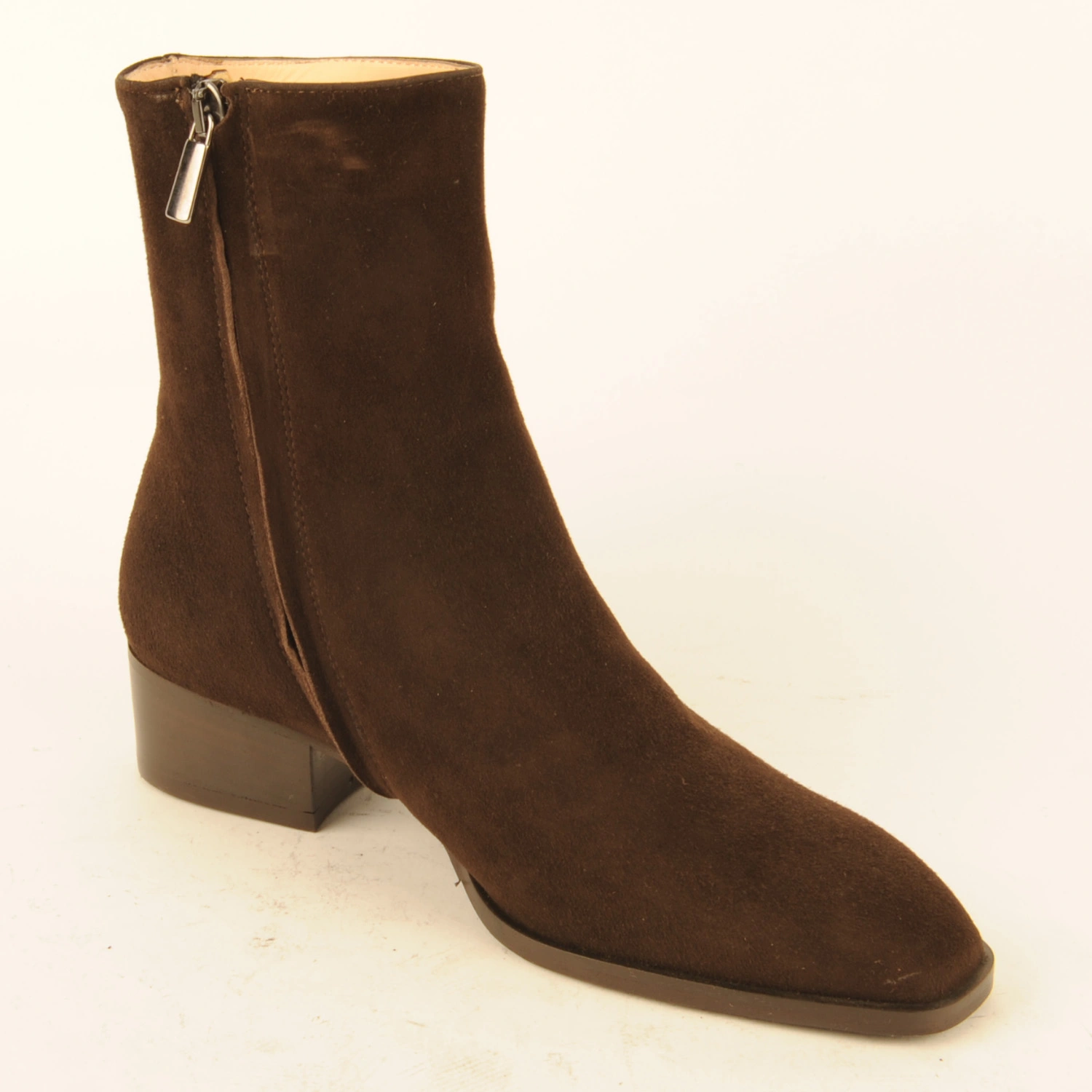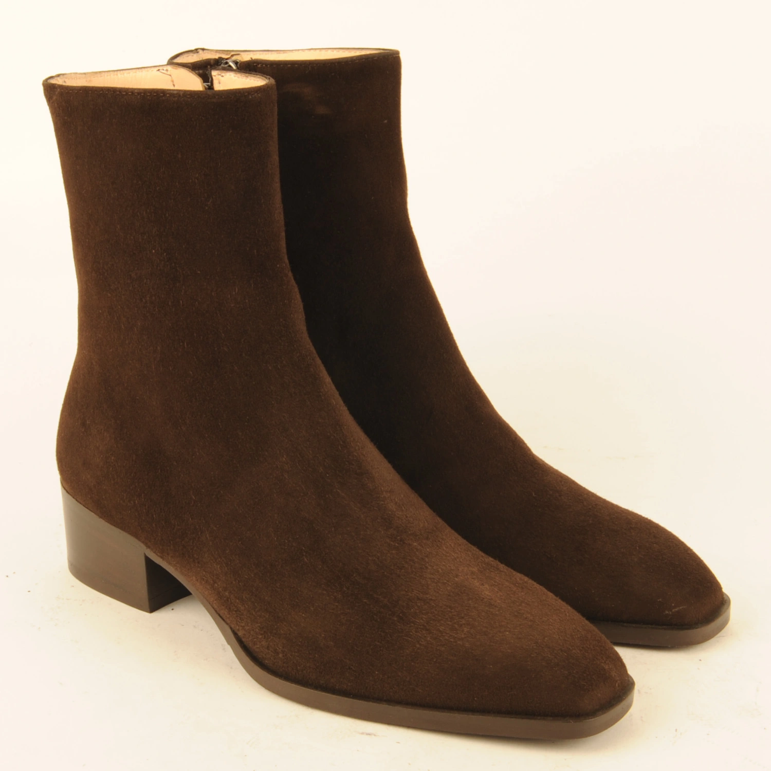 Enkellaars van donkerbruin suède met een carrè-leest. Dit laarsje is leer gevoerd en heeft een rubberen zool en een hak van 5 centimeter.