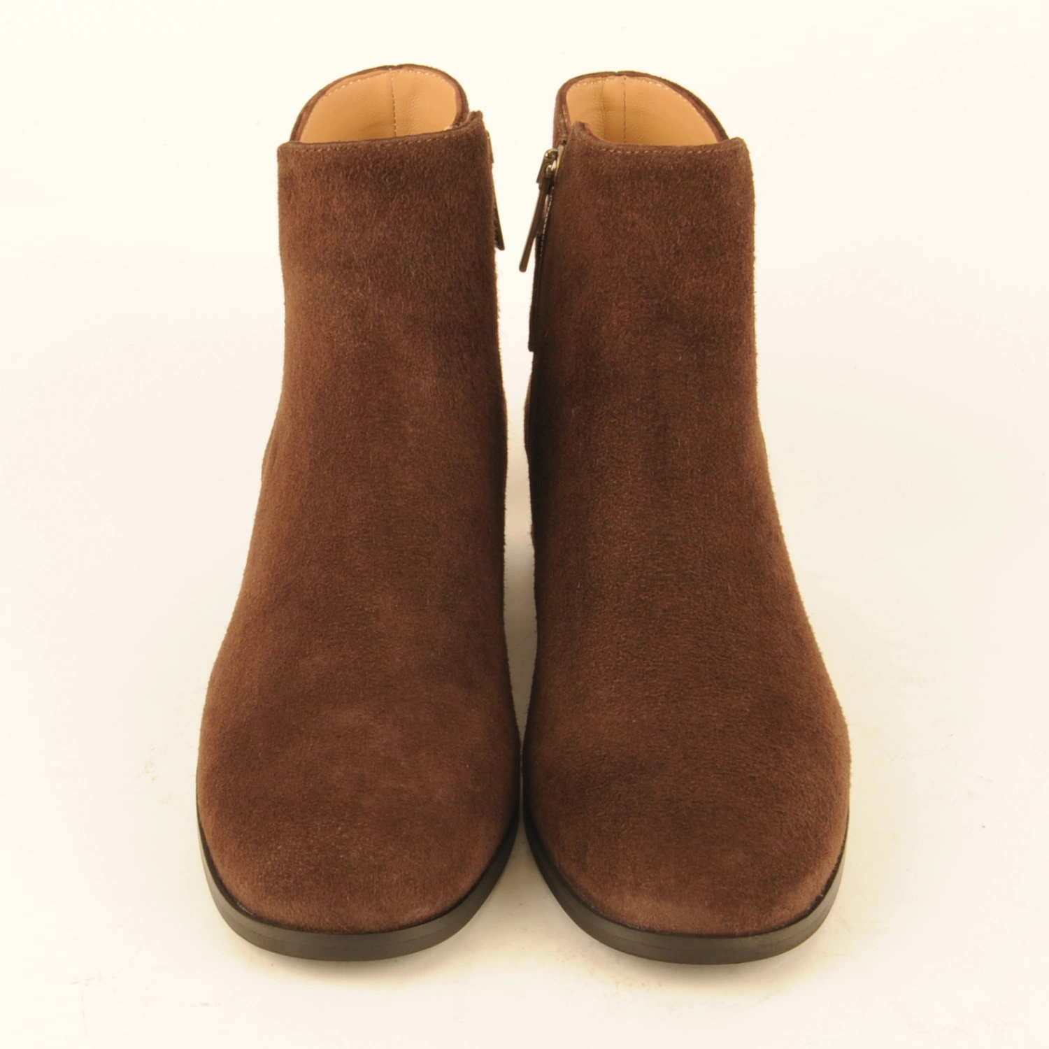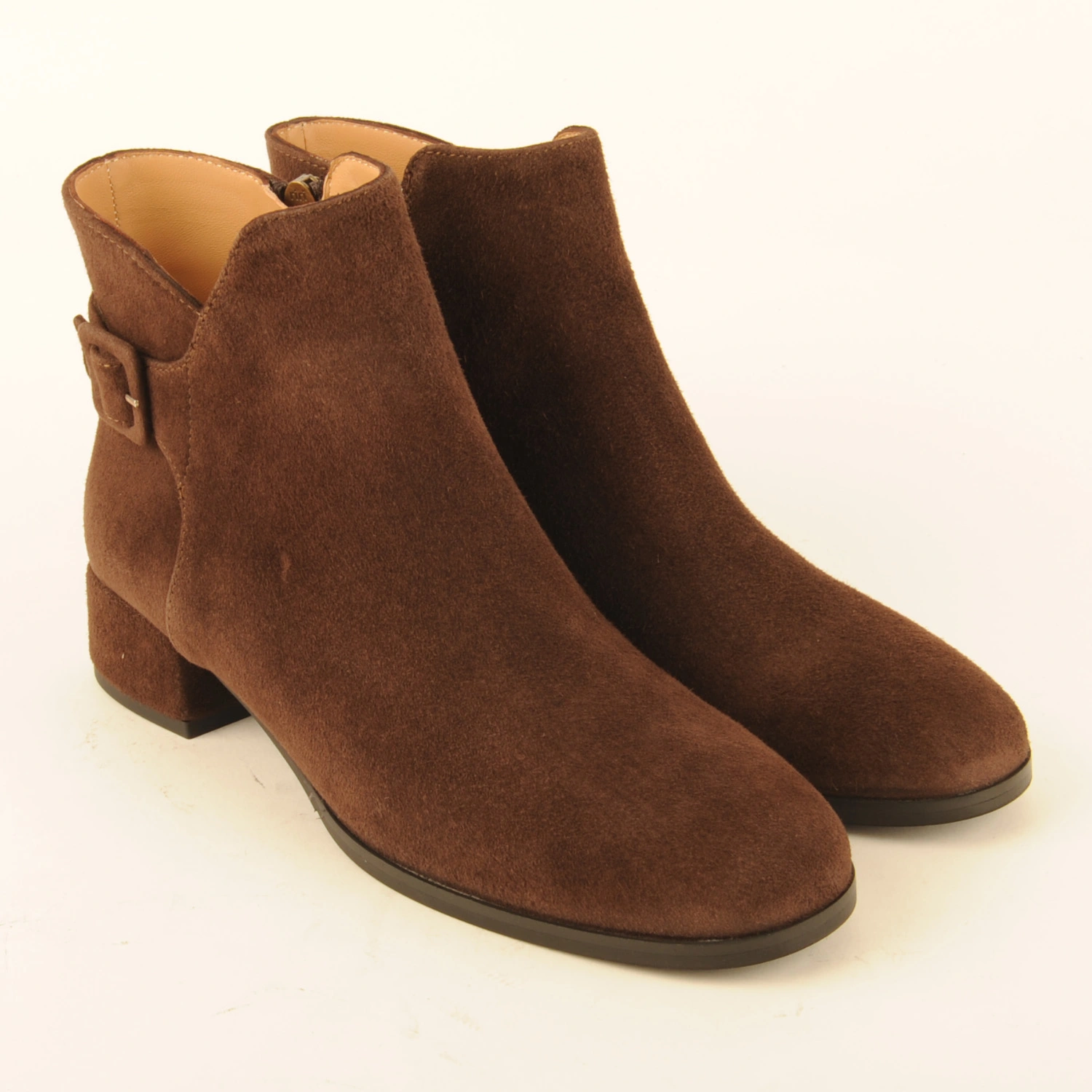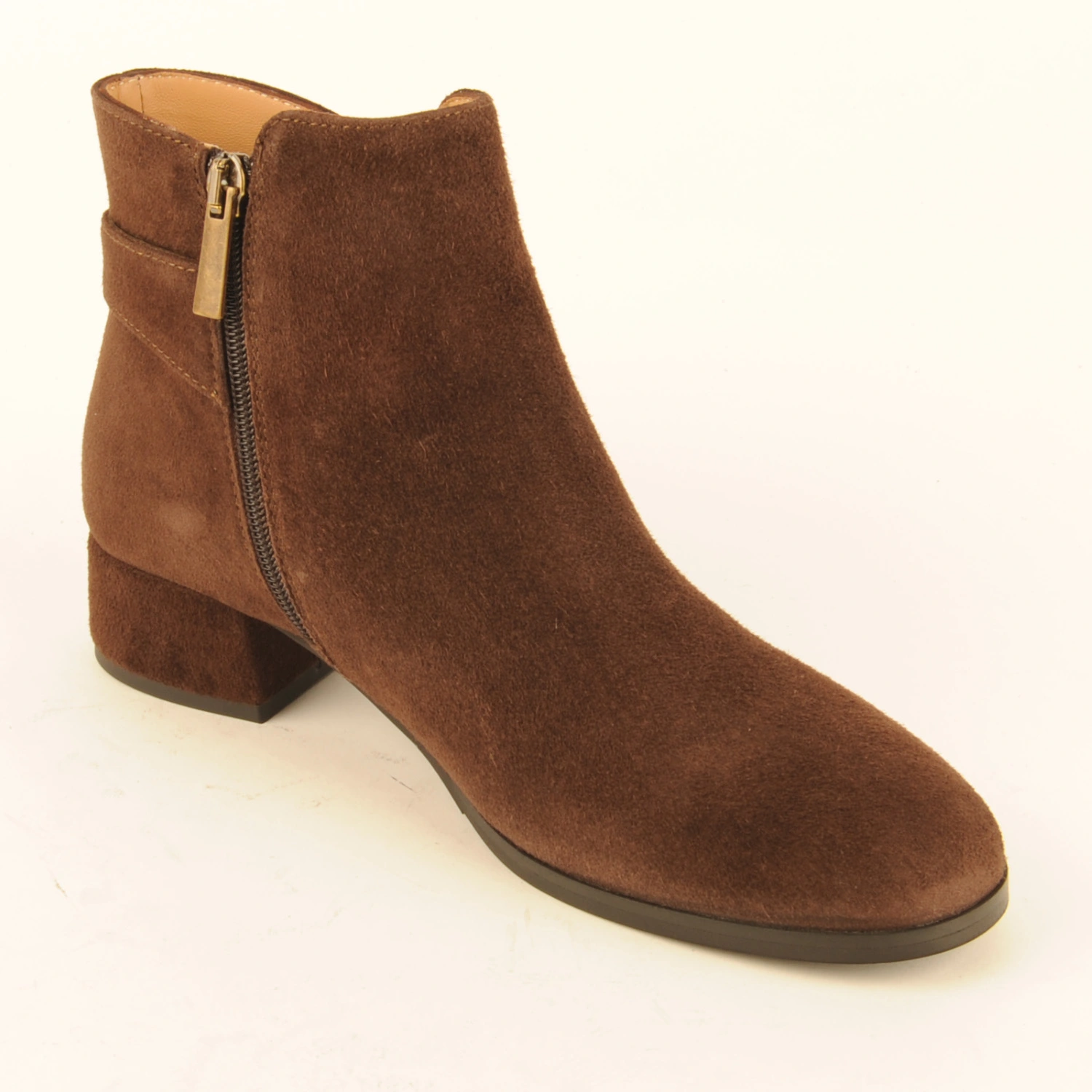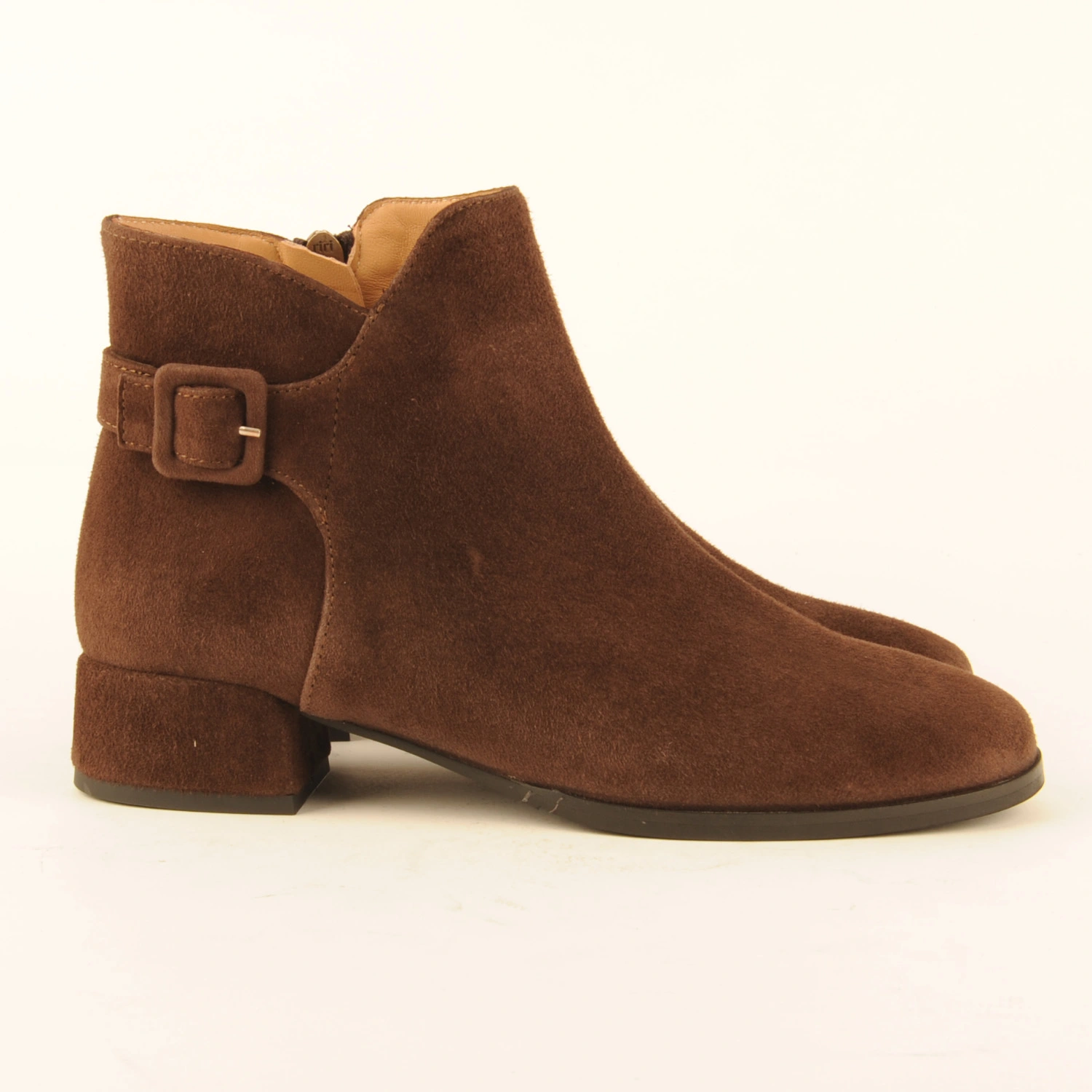 Enkellaars van donkerbruin suède met een gespje op de enkel en een hak van 3 centimeter. Het laarsje is leergevoerd en heeft een rubberen zool.
