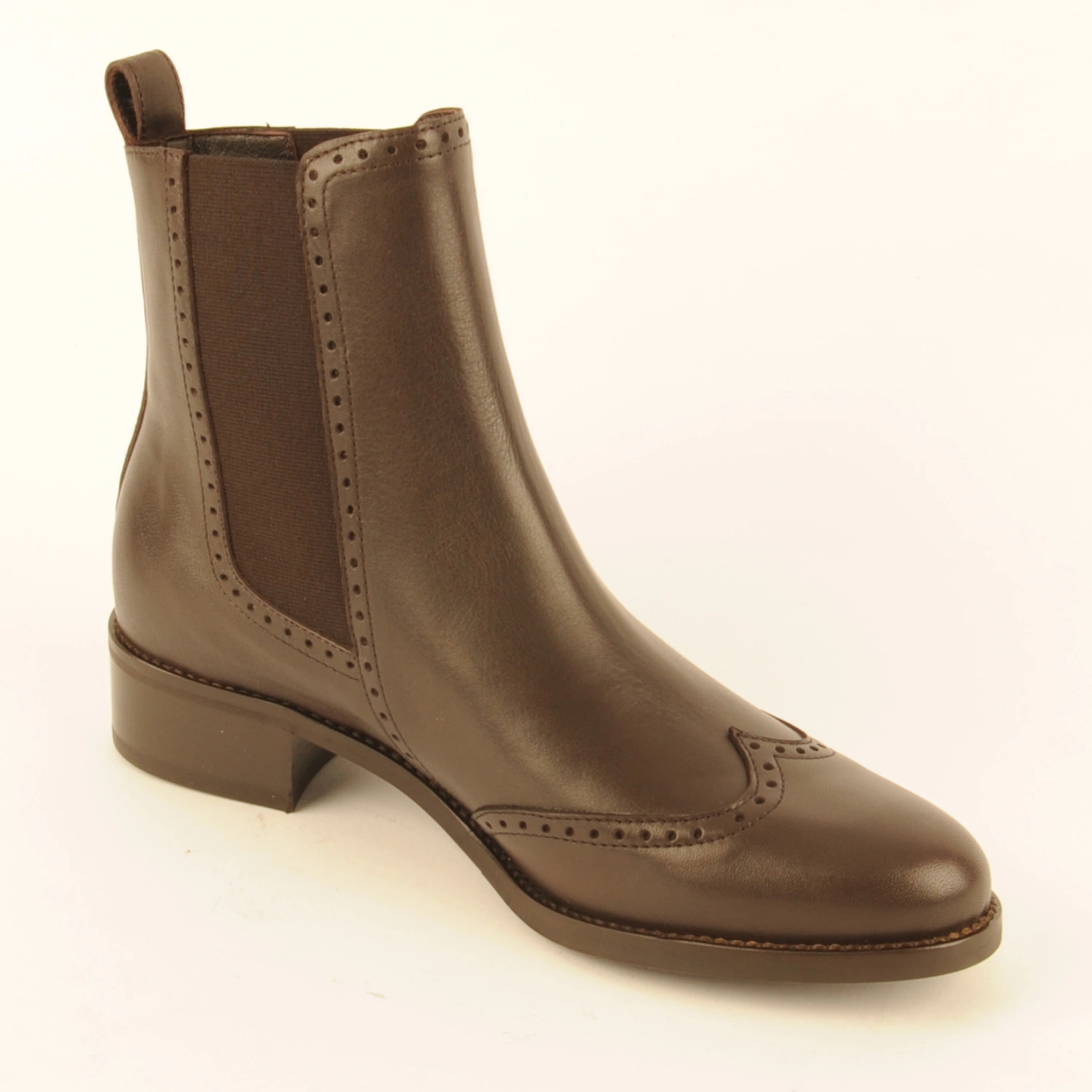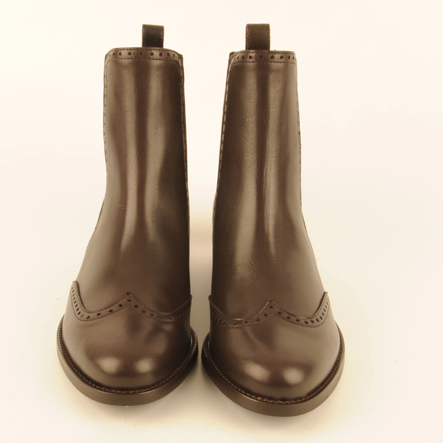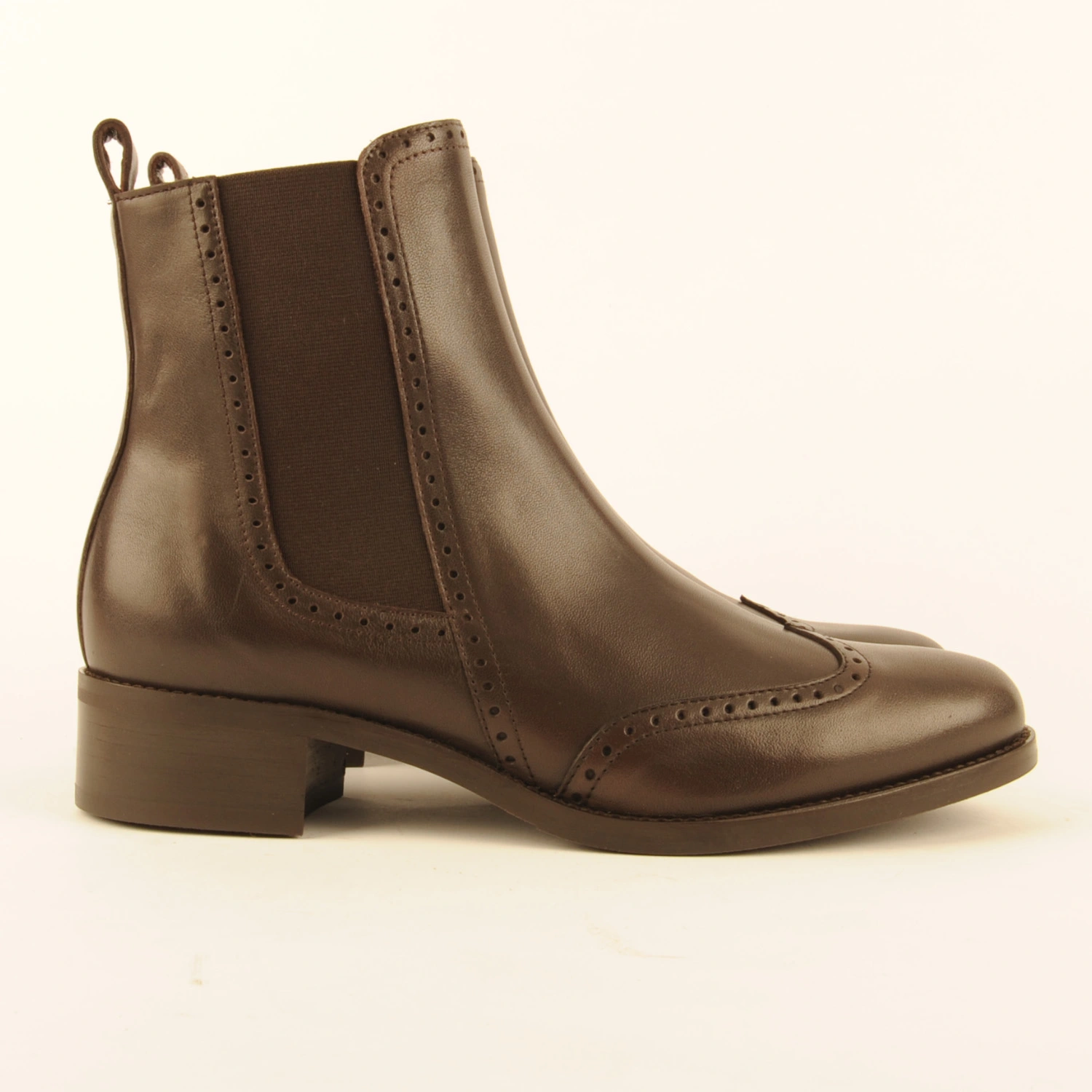 Enkellaarsje van donkerbruin leer met elastiek en diverse perforaties. Dit laarsje is leer gevoerd en heeft een rubberen zool met een hak van 3 centimeter.