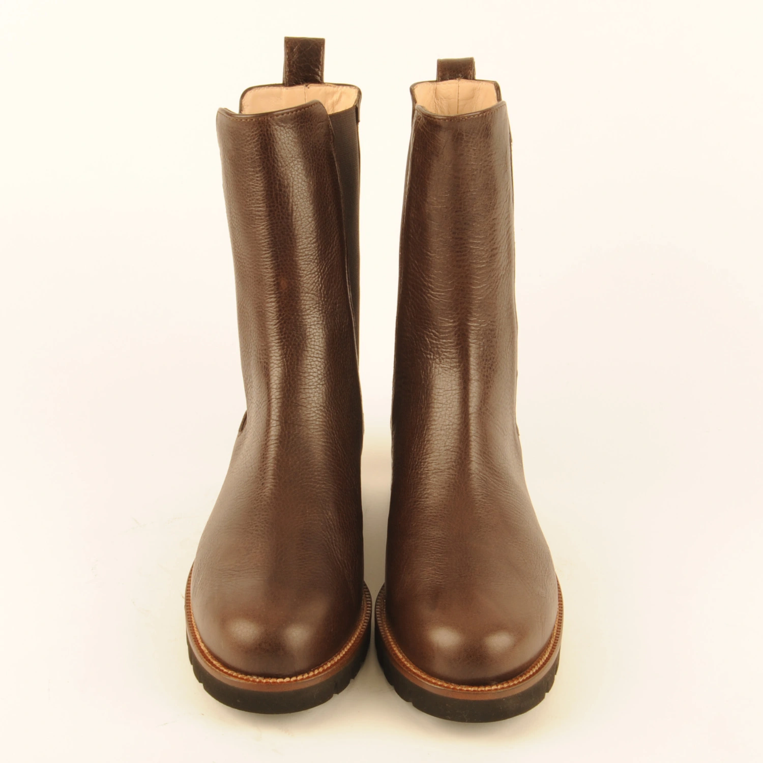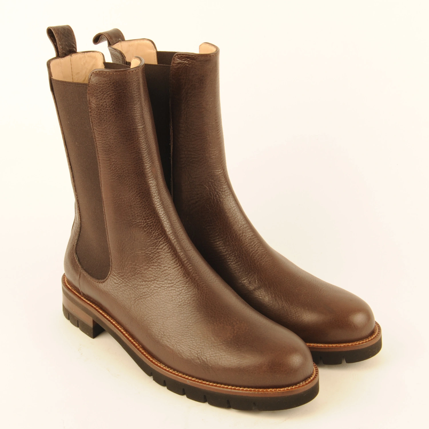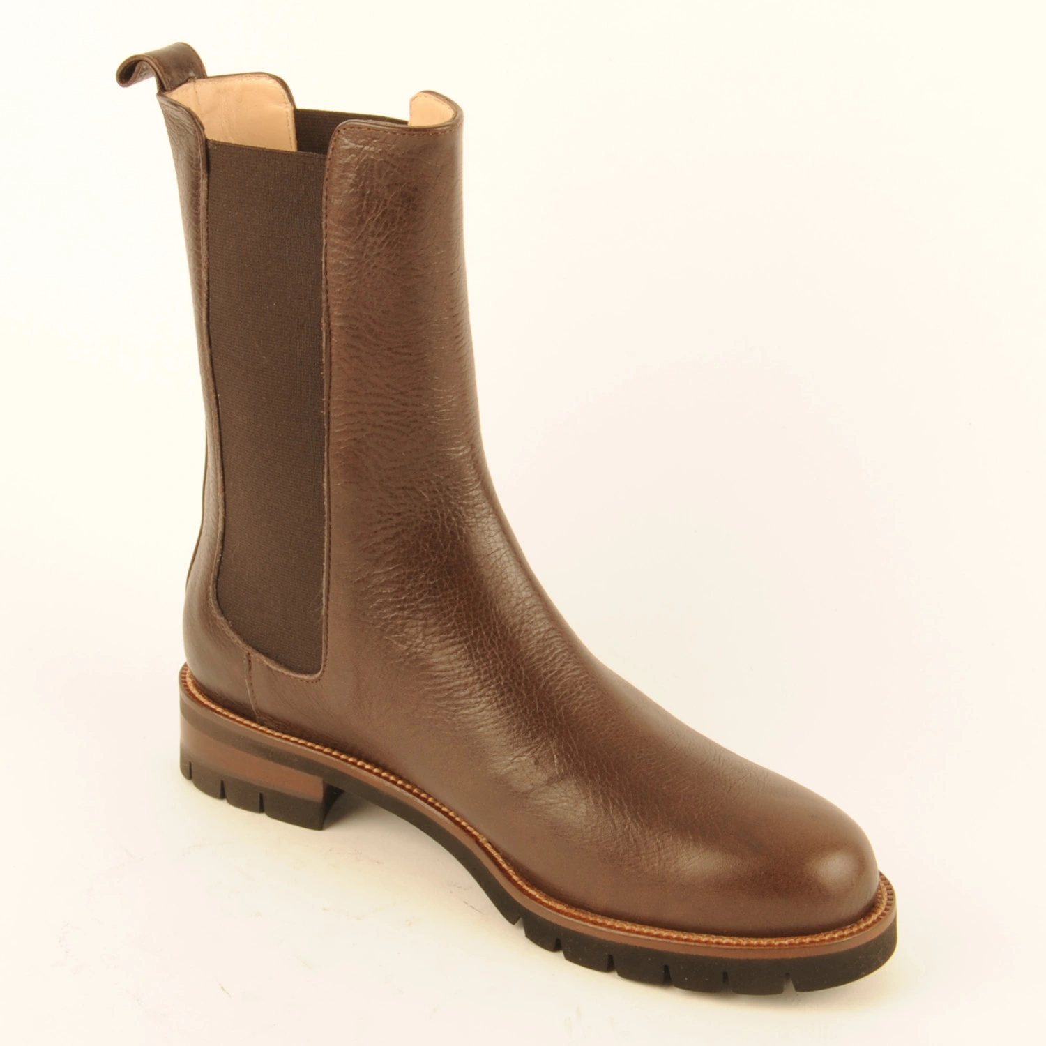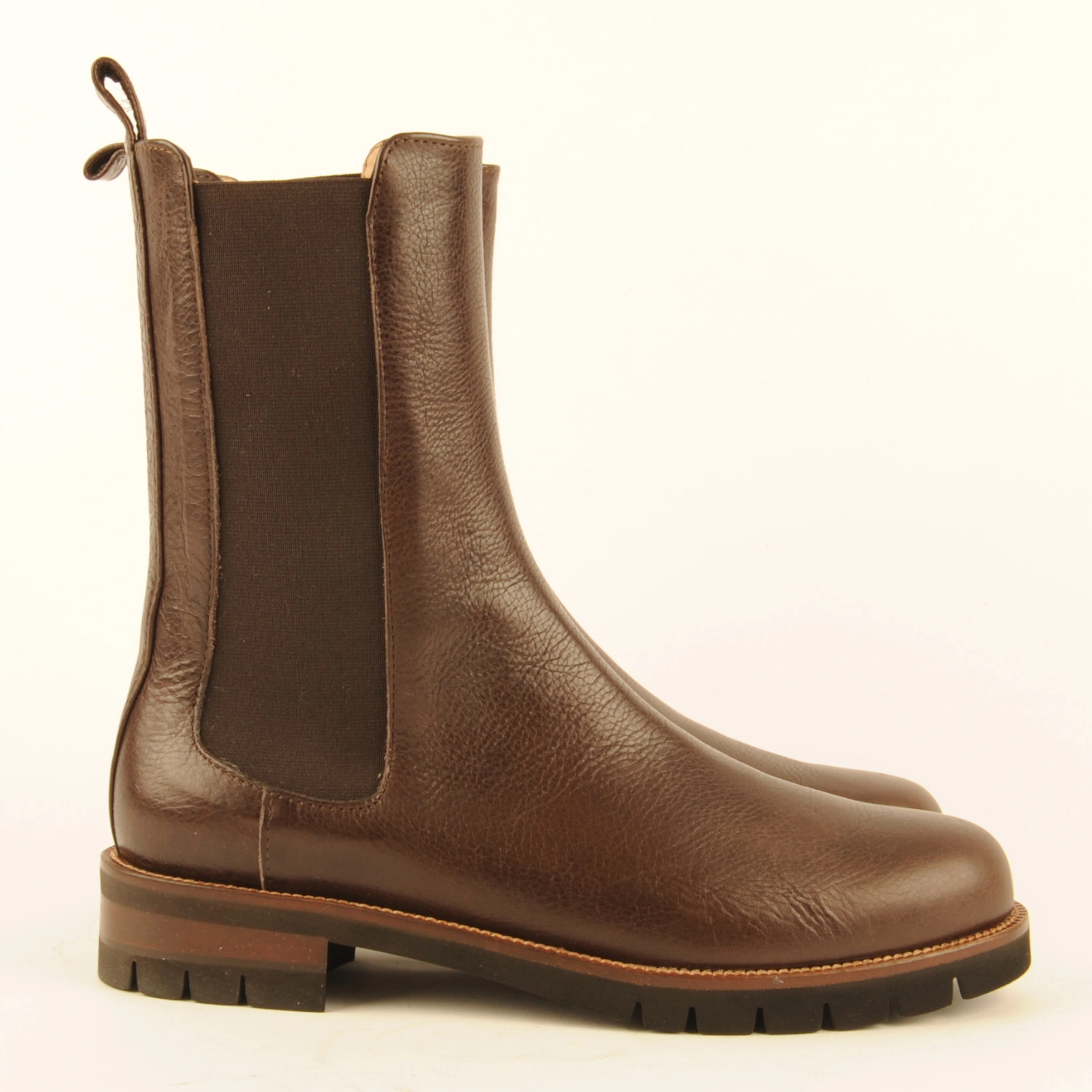 Iets langer enkellaarsje van donkerbruin hertenleer met donkerbruin elastiek. Dit laarsje is leer gevoerd en heeft een rubberen profielzool.
