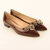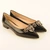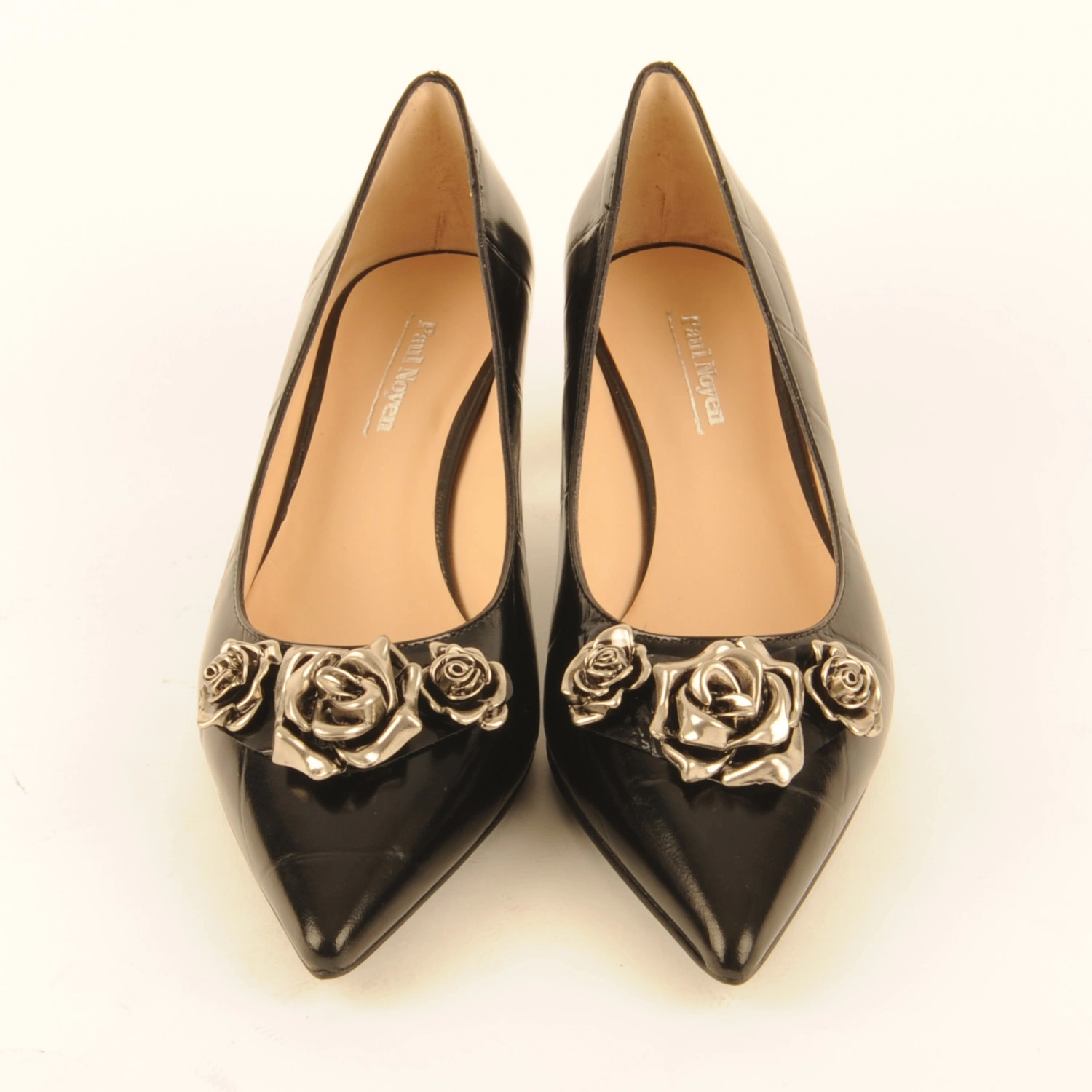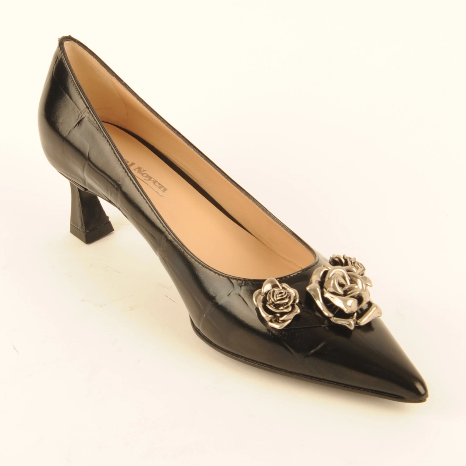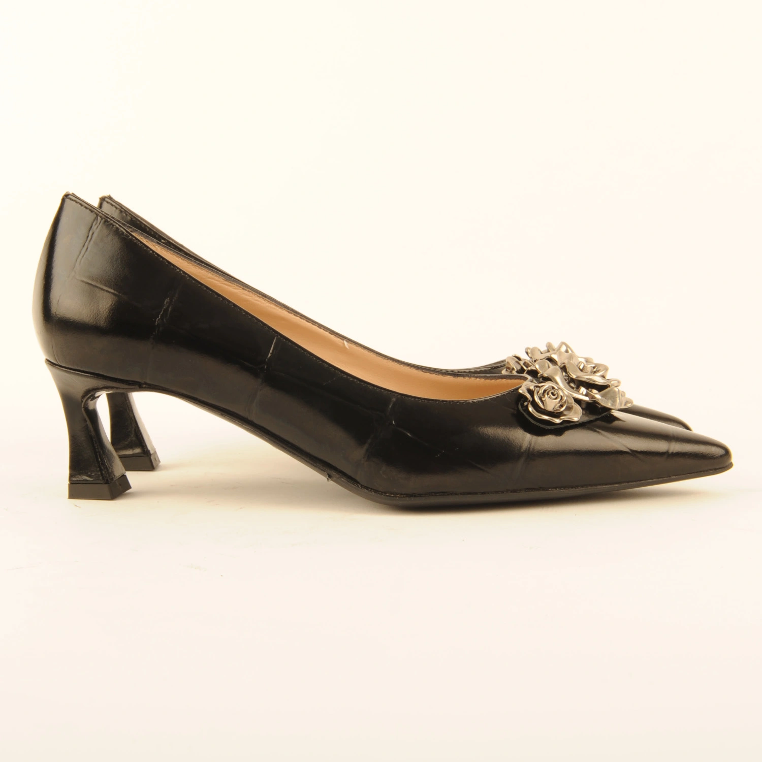 Spitse pump van zwart leer met krokodillenprint en drie zilverkleurige roosjes op de neus. Deze pump is leer gevoerd en heeft een deels leren en deels rubberen zool.