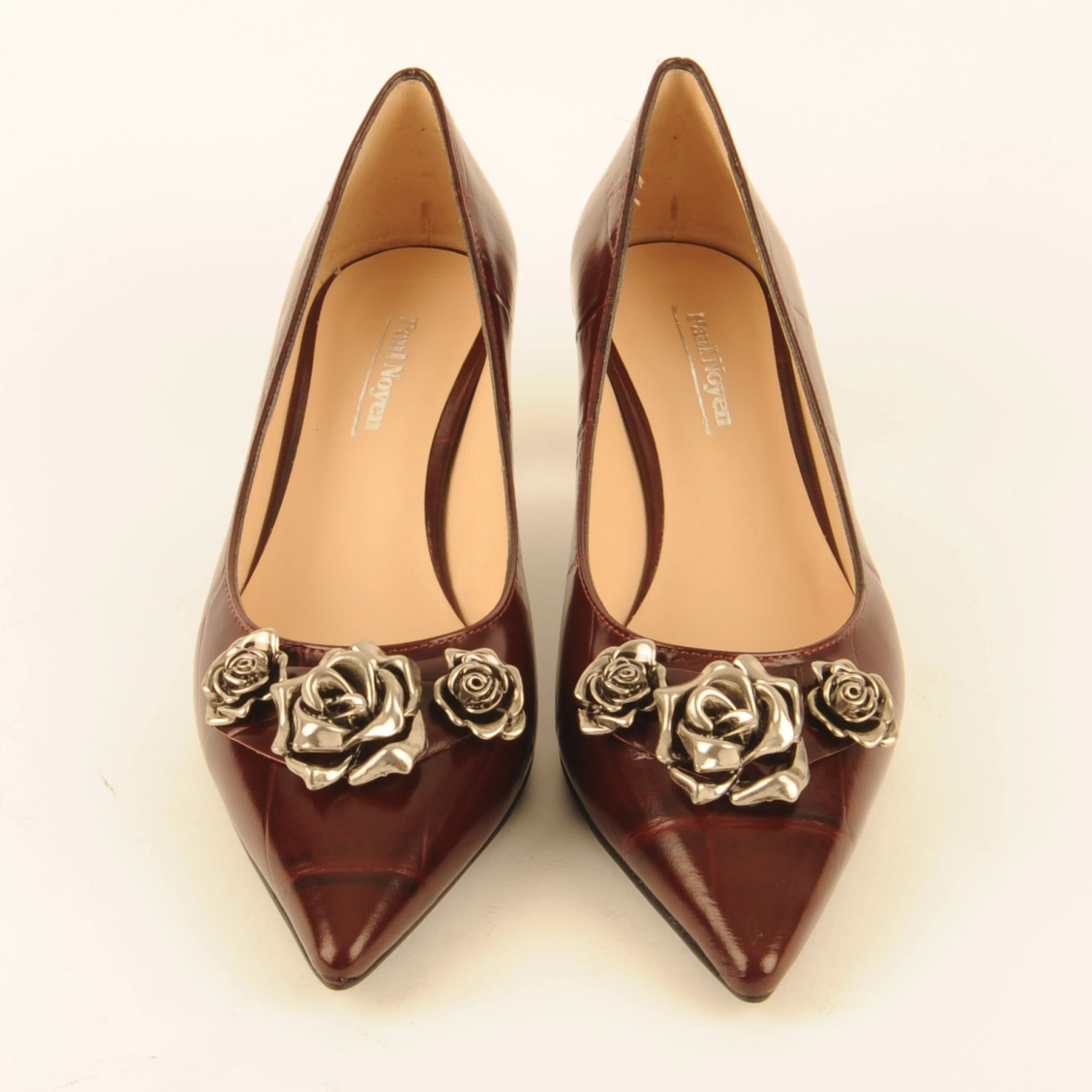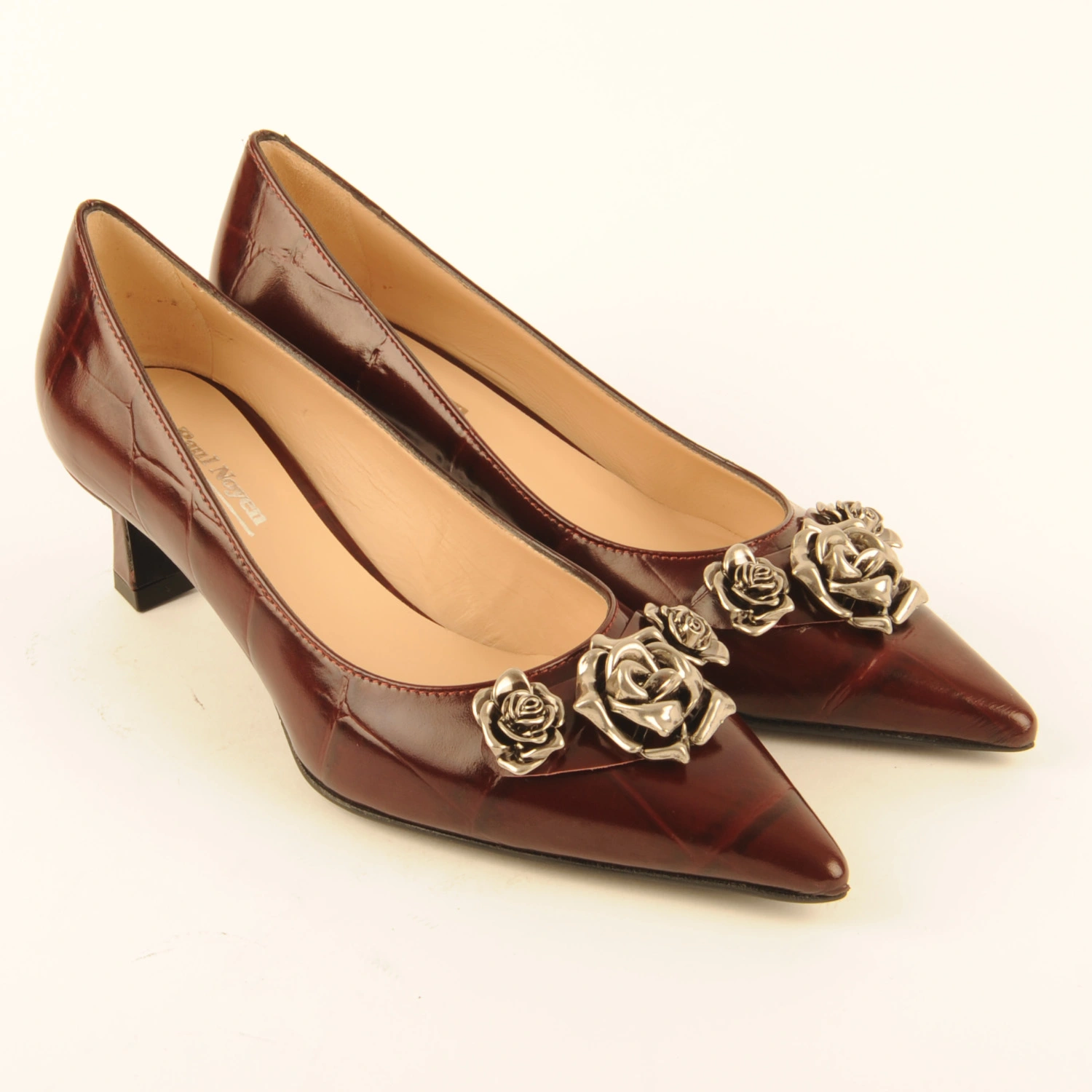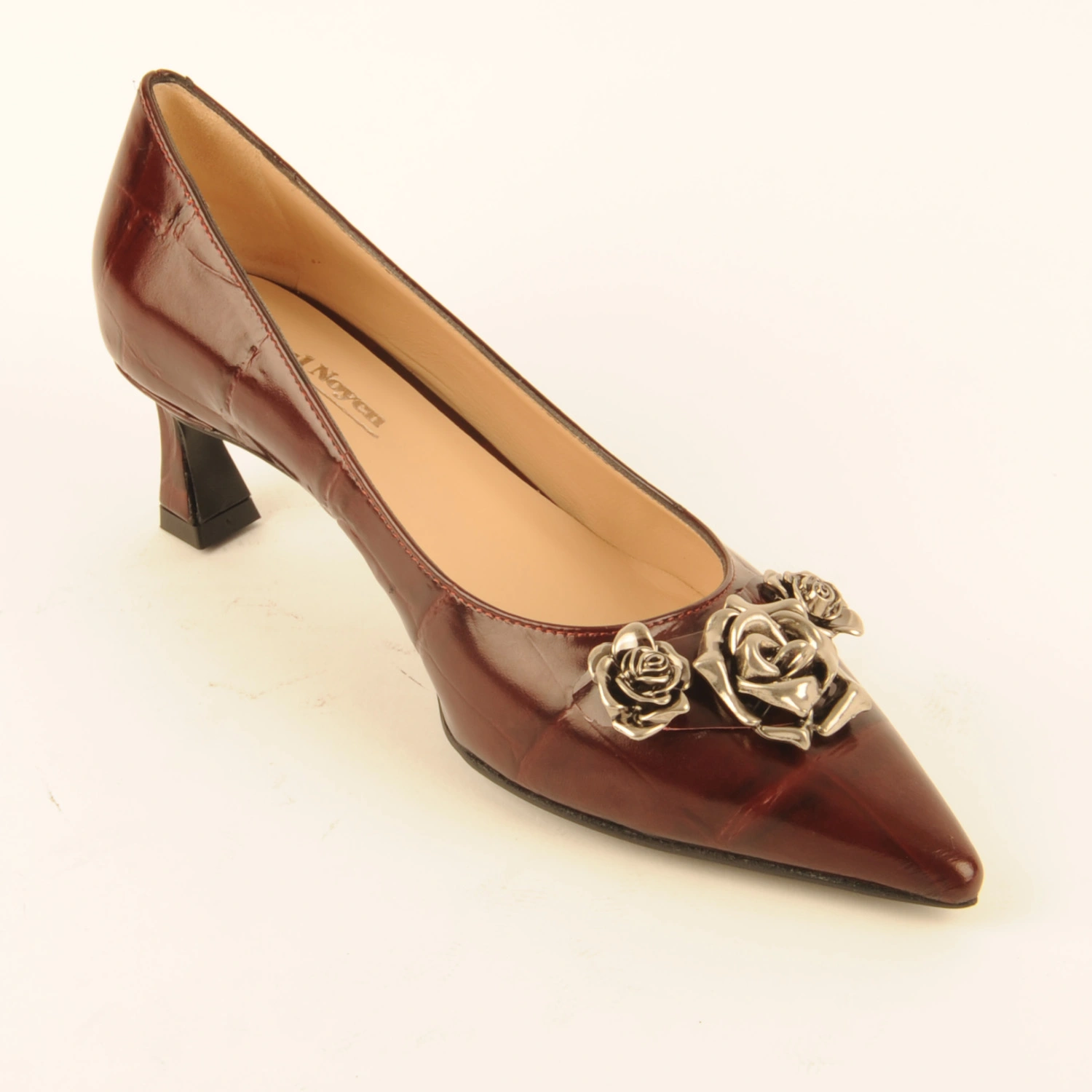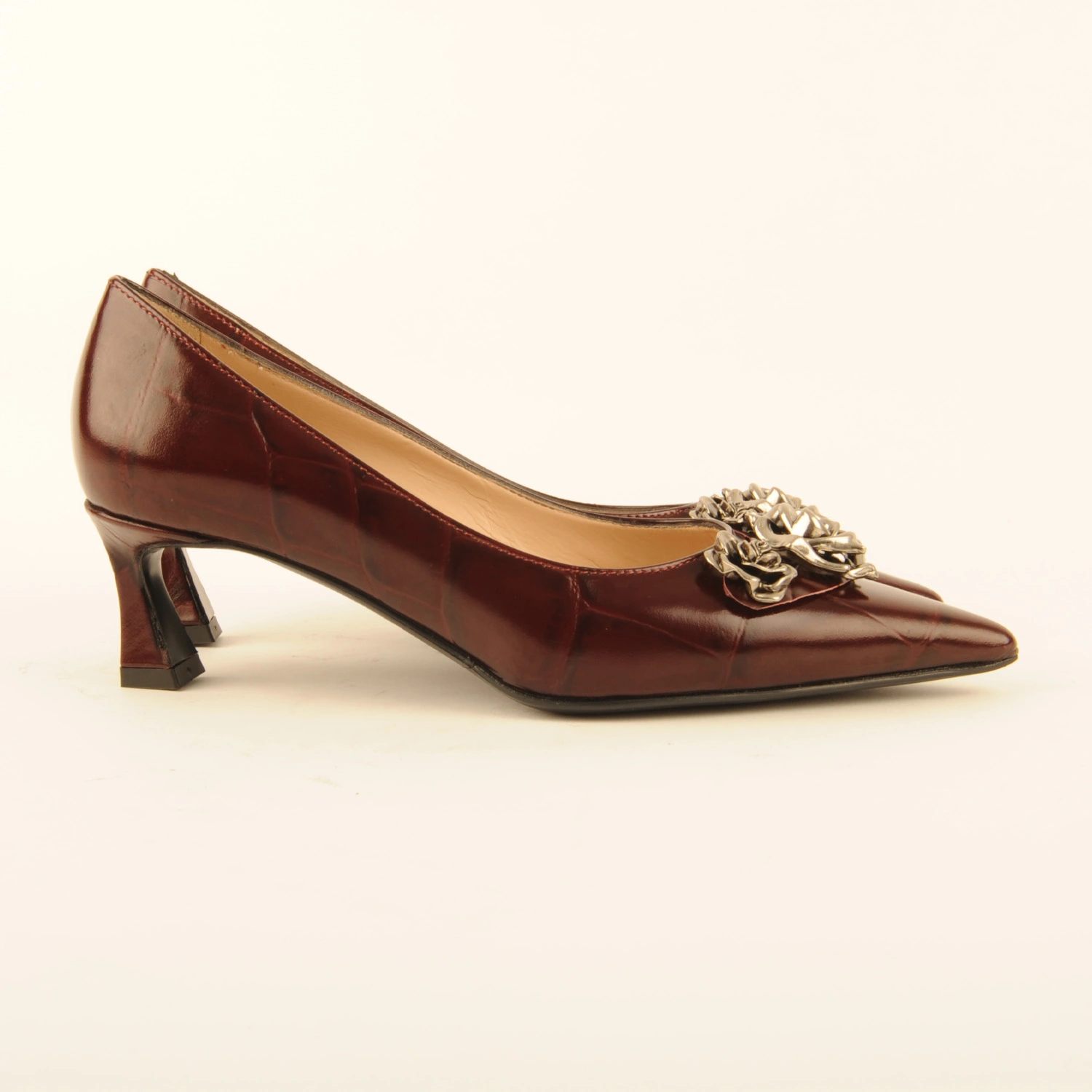 Spitse pump van bordeauxrood leer met krokodillenprint en drie zilverkleurige roosjes op de neus. Deze pump is leer gevoerd en heeft een deels leren en deels rubberen zool.