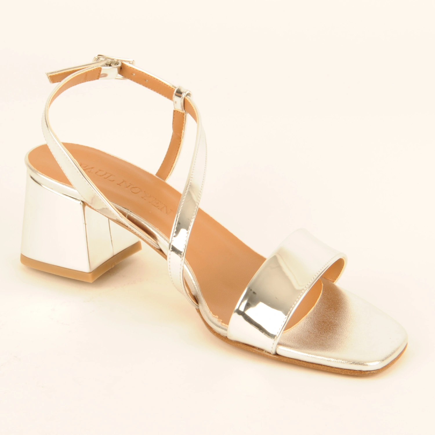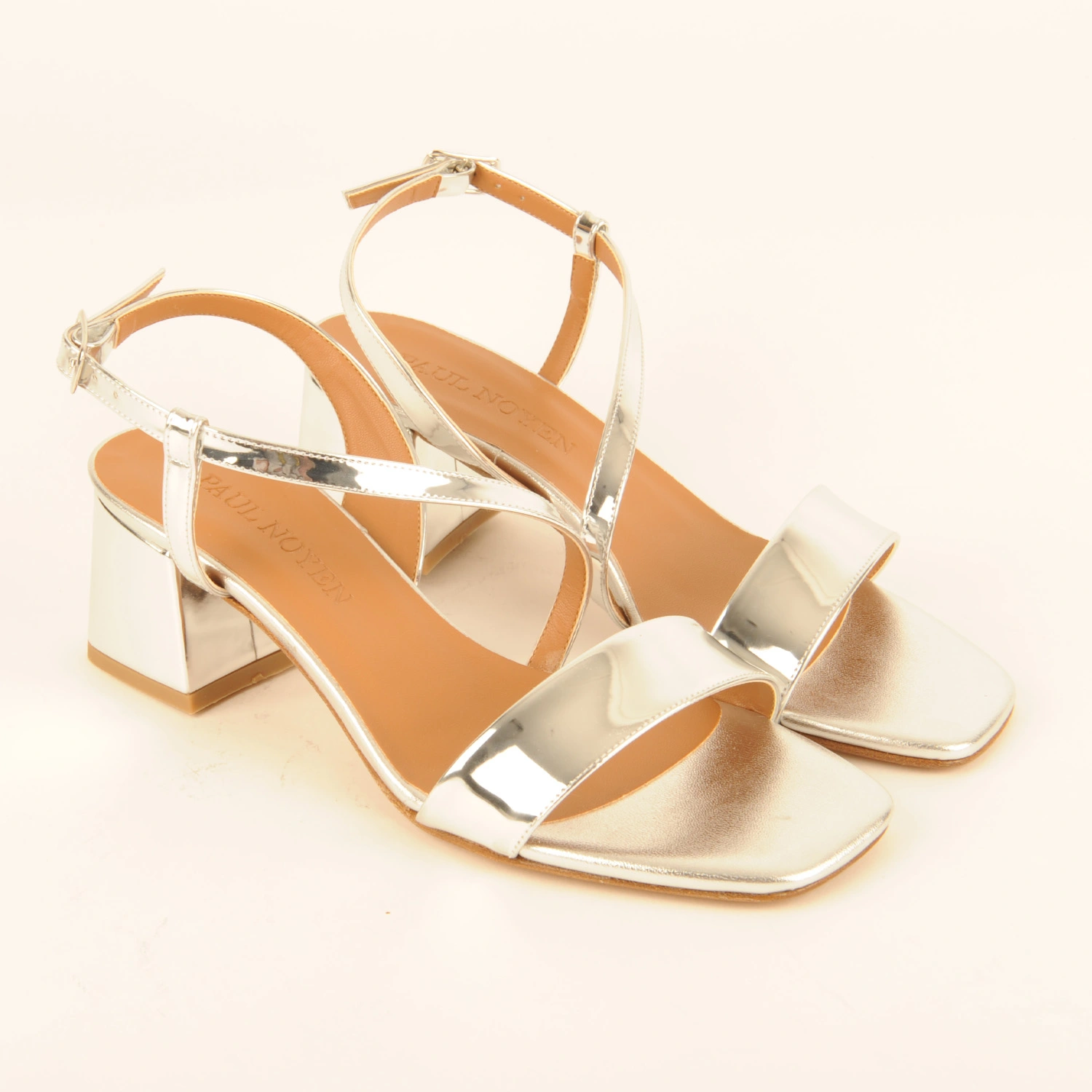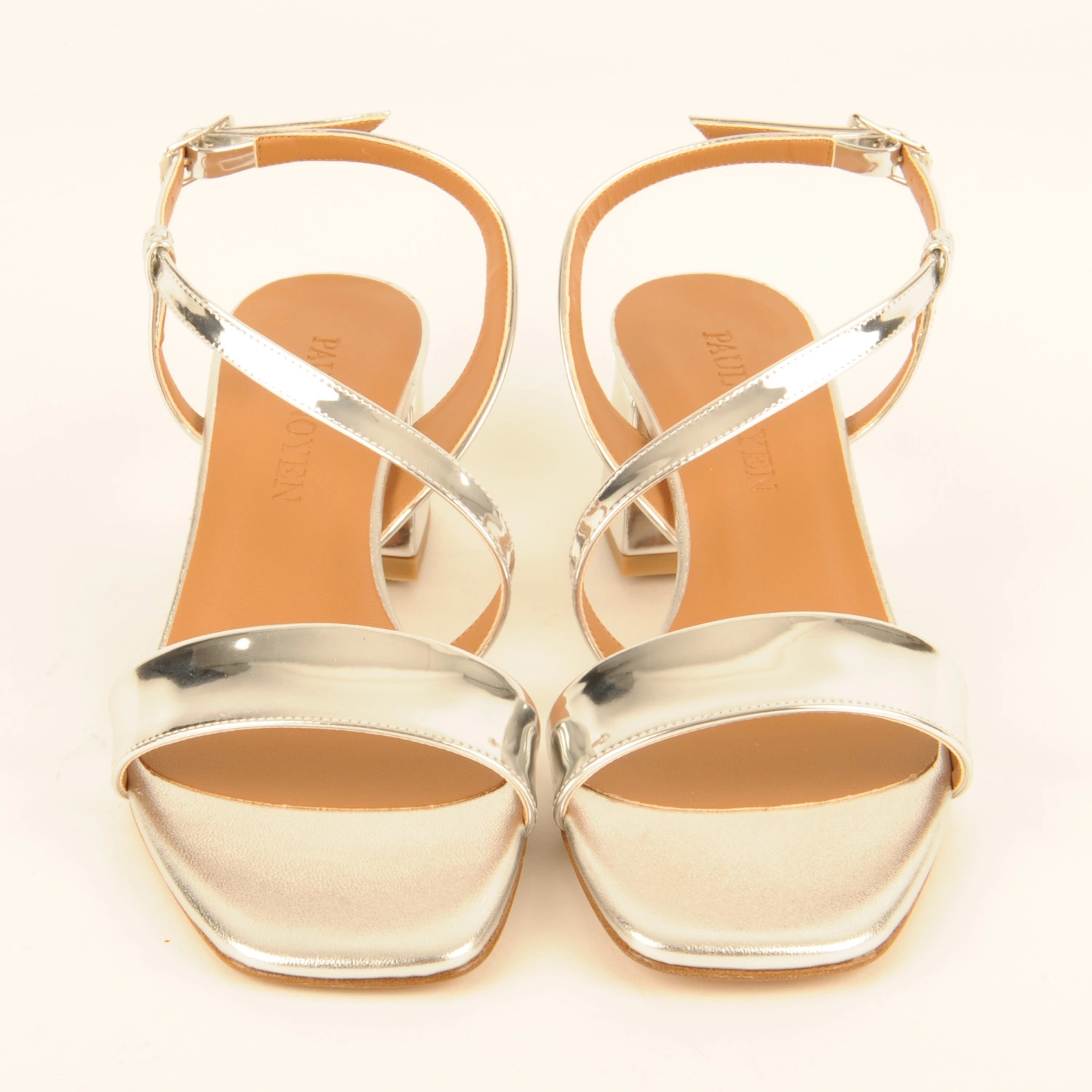 Sandalet in zilverkleur met een stevige hak van 5 centimeter en een leren zool.