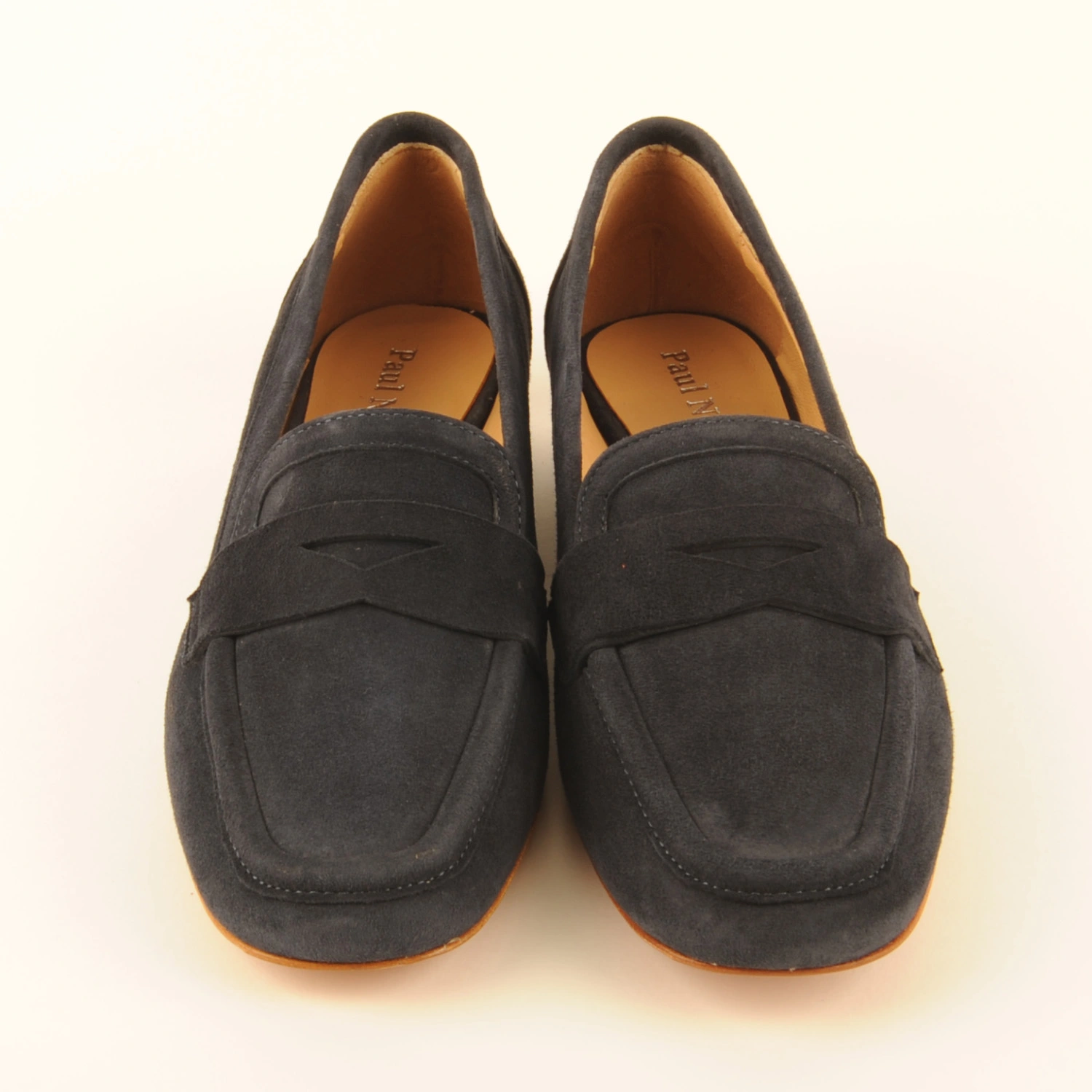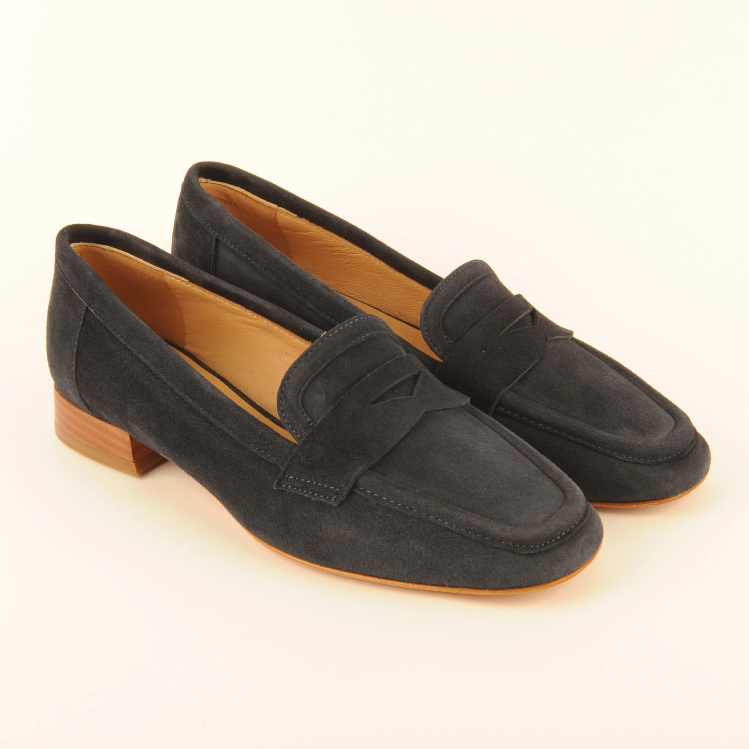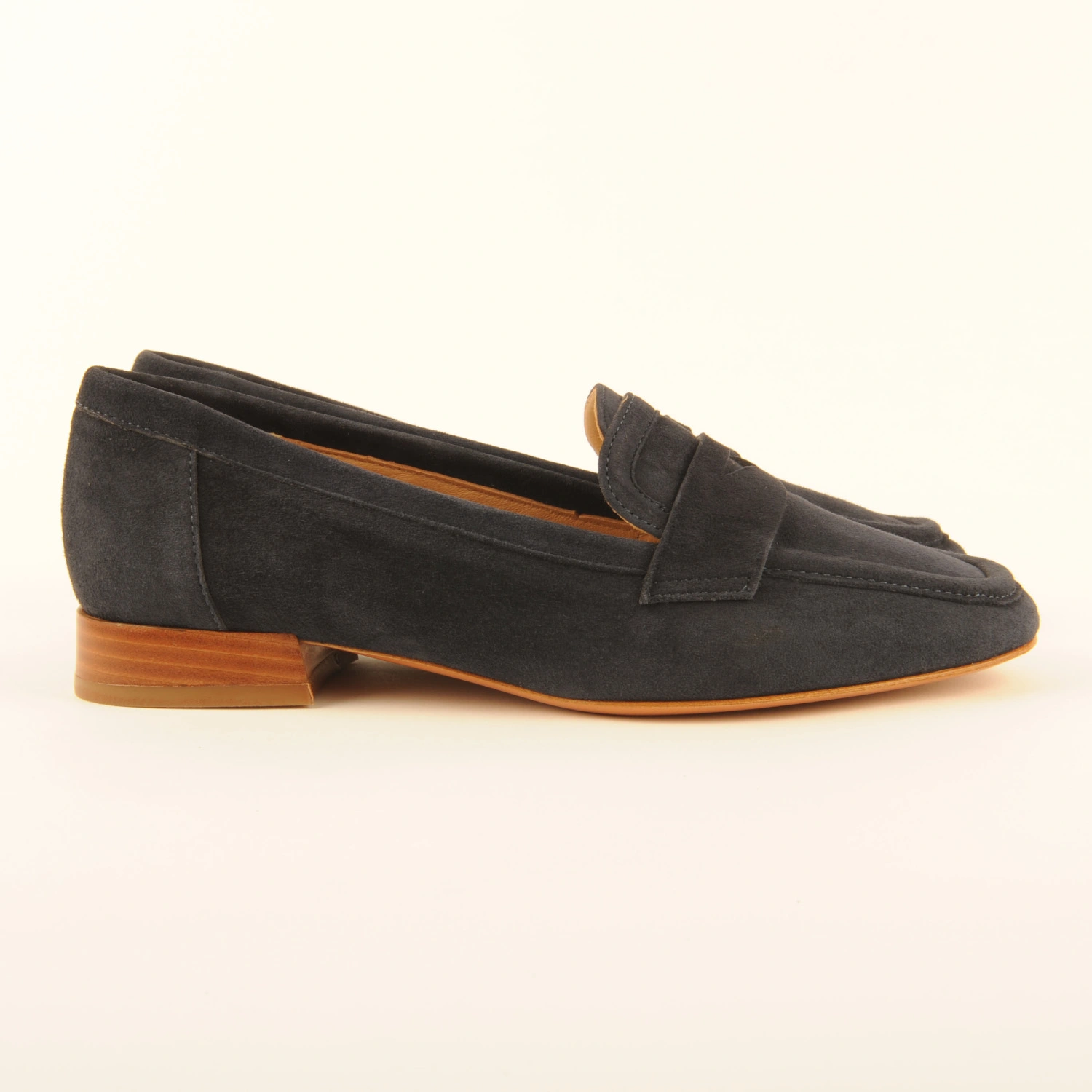 Mocassin van donkerblauw suède met een hakje van 2 centimeter. Deze instapper is leer gevoerd en heeft een leren zool.