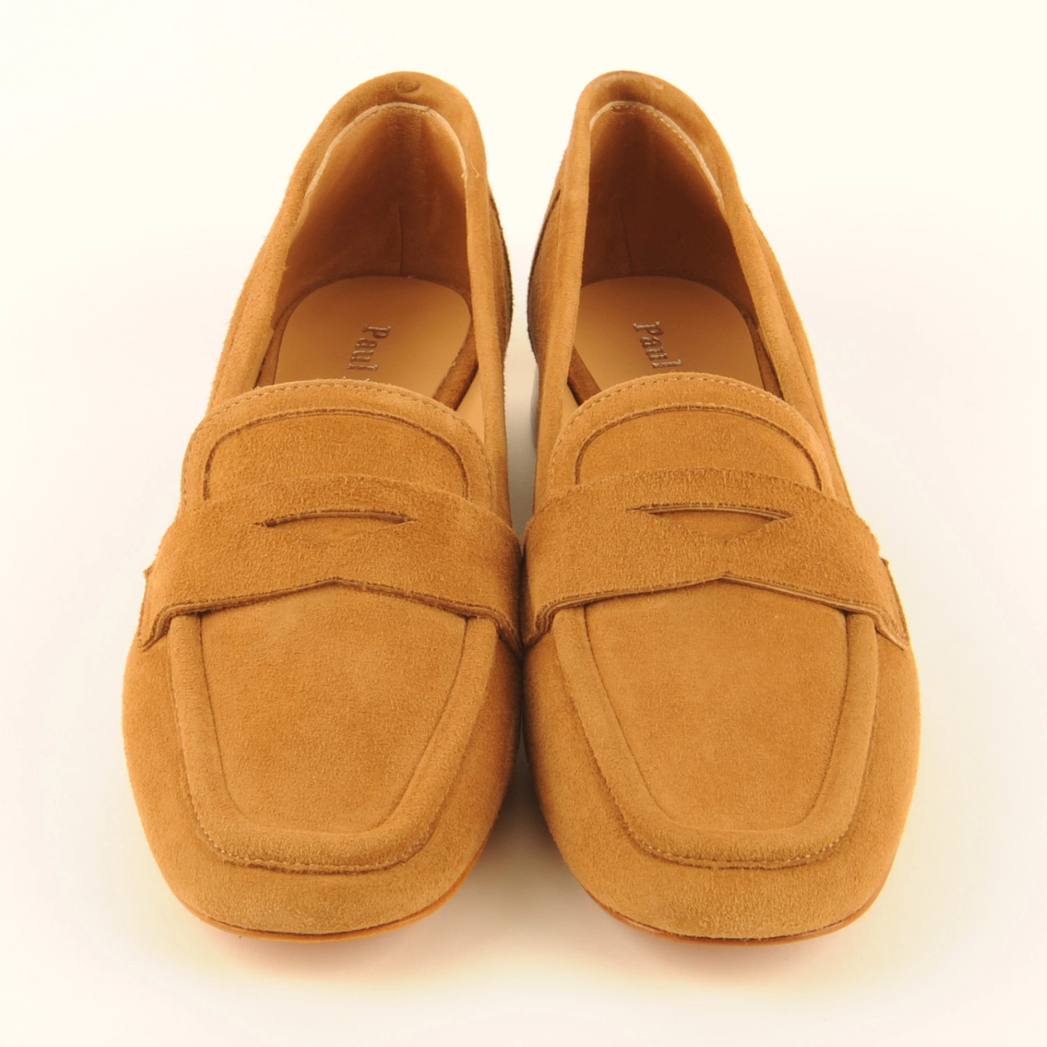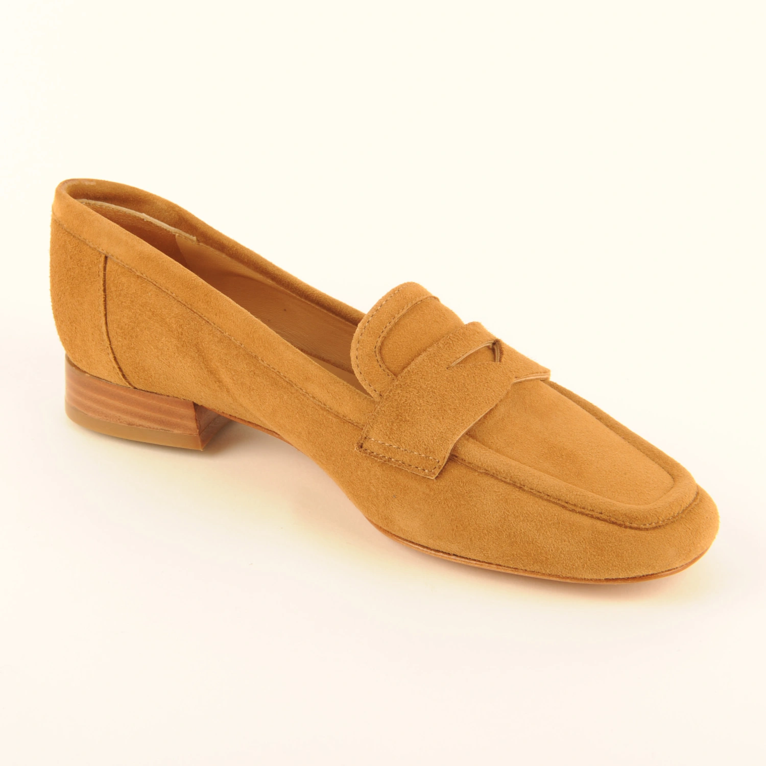 Mocassin van middenbruin suède met een hakje van 2 centimeter. Deze instapper is leer gevoerd en heeft een leren zool.