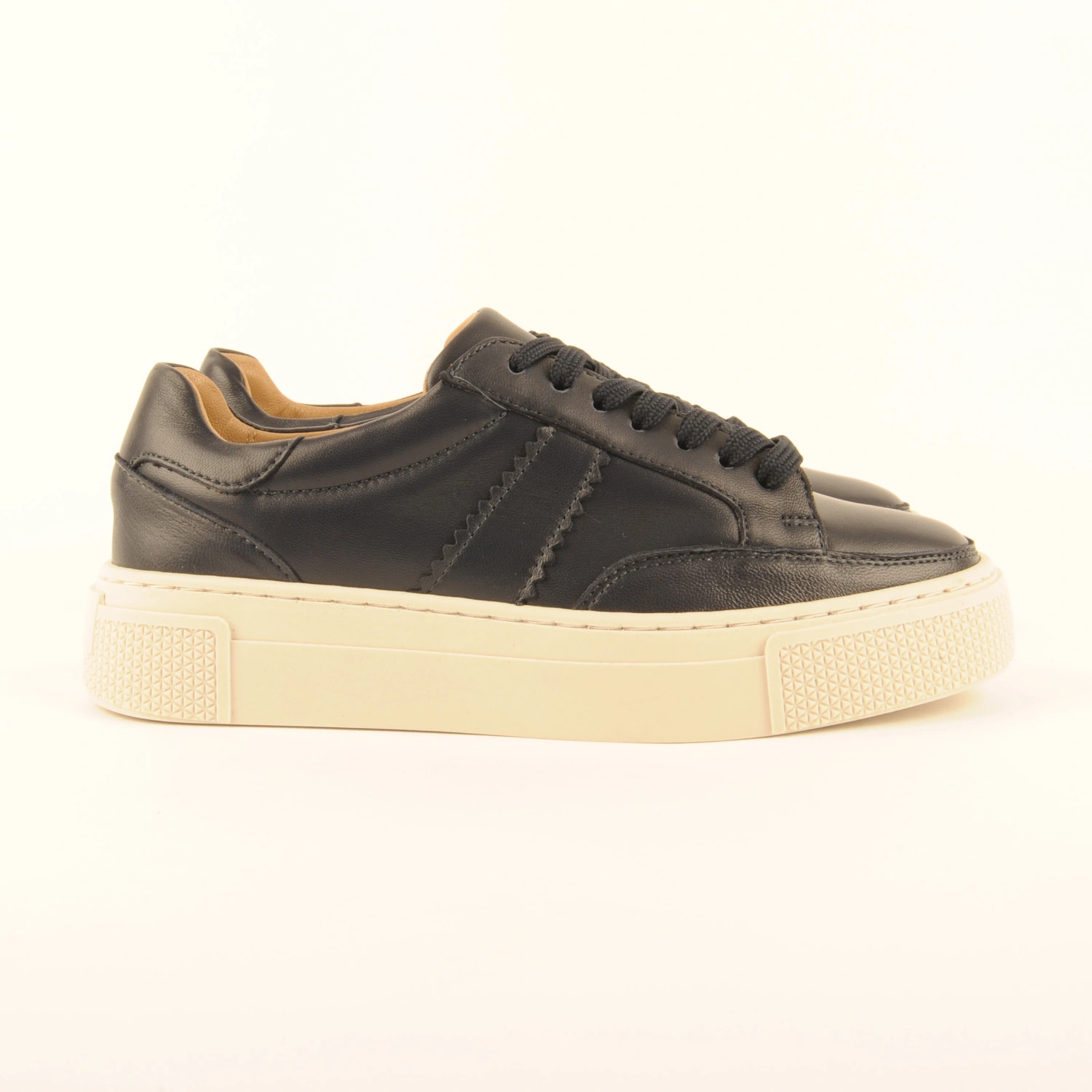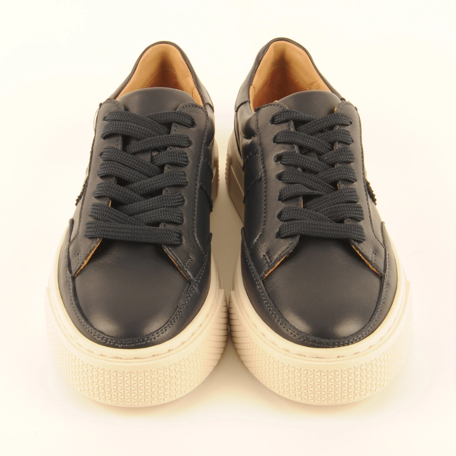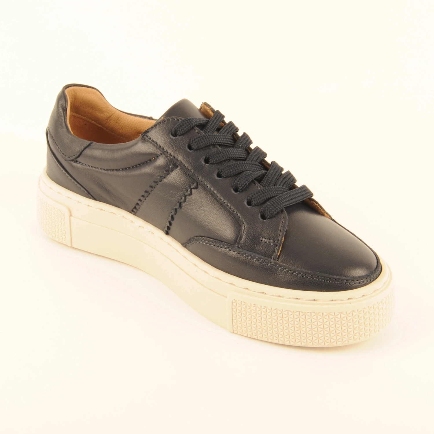 Sneaker van donkerblauw leer met een kartelrandje aan de zijkant. Deze sneaker is leer gevoerd en heeft een dempende binnenzool en een offwhite, wat dikkere rubberen zool.