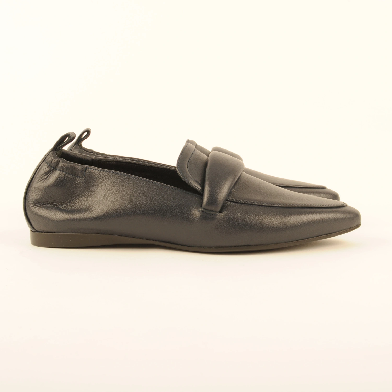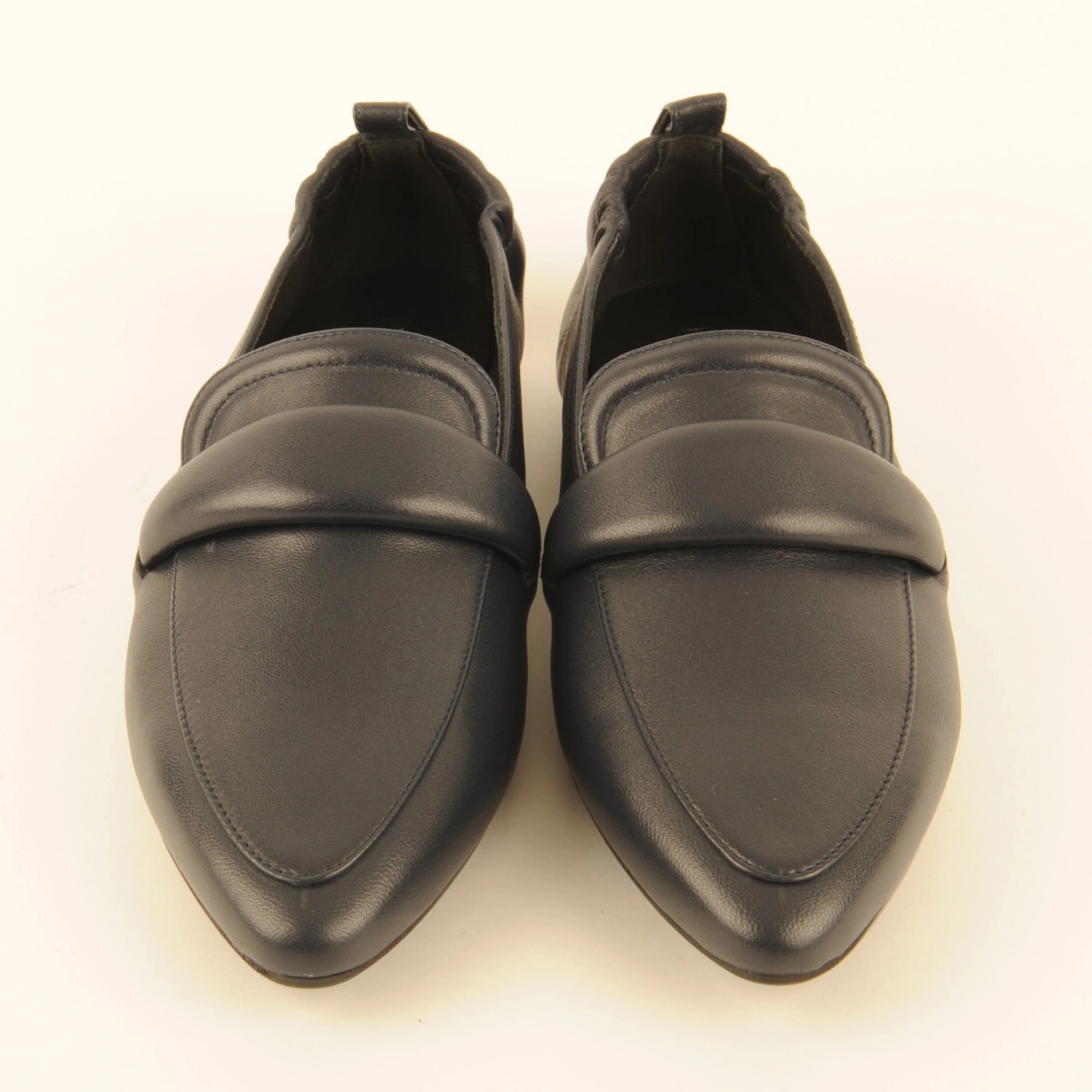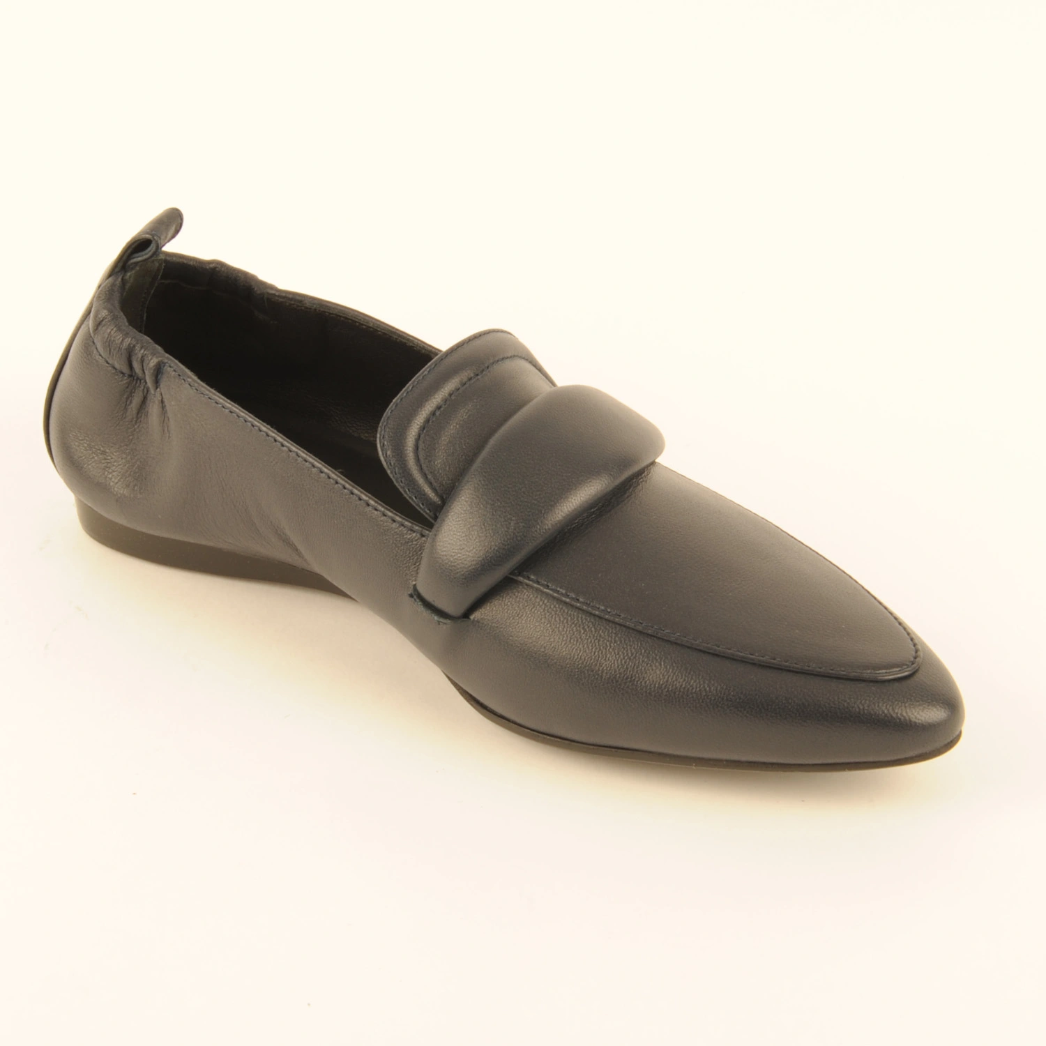Spitse instapper van donkerblauw leer met een elastische hiel en een dunne rubberen zool. Deze instapper is leer gevoerd.