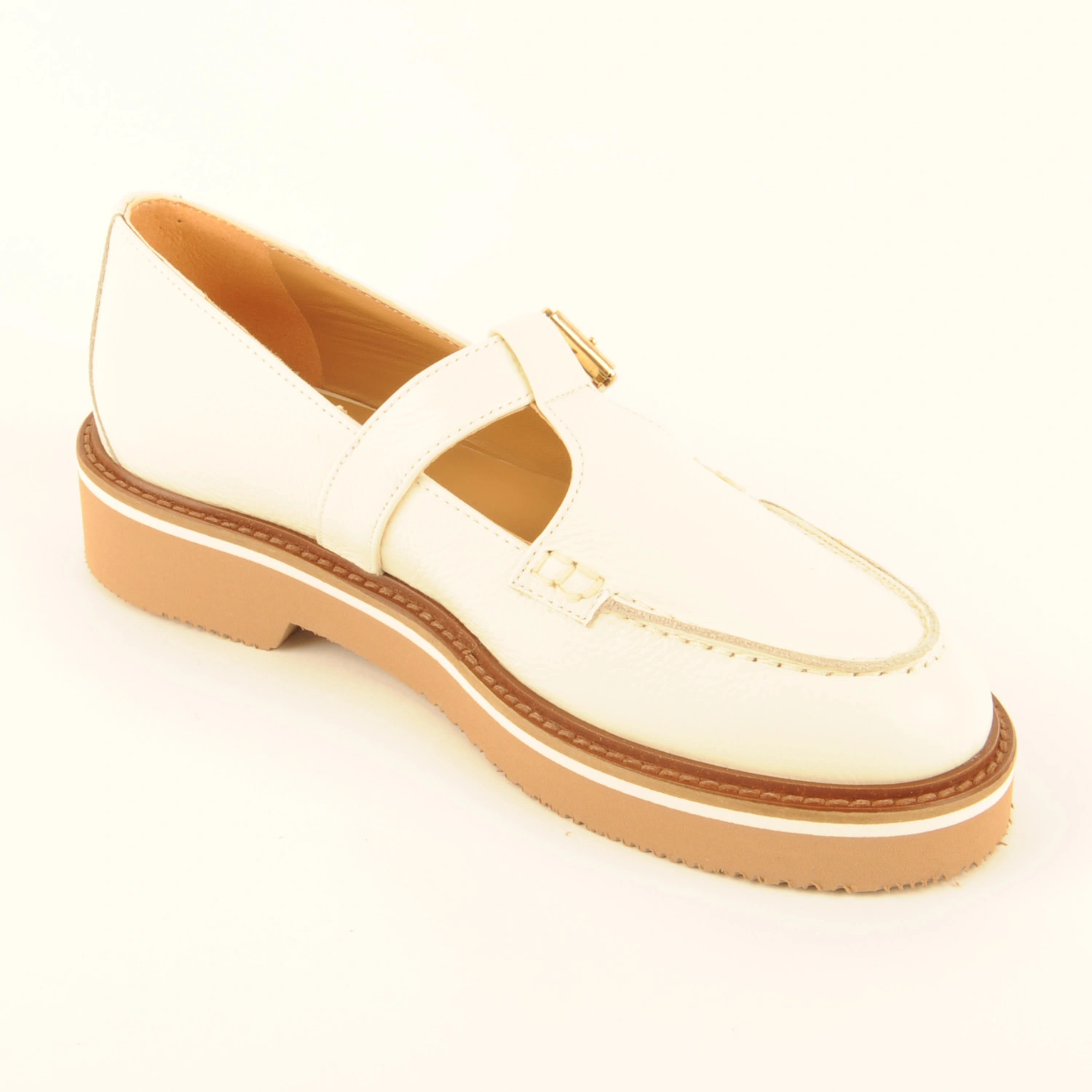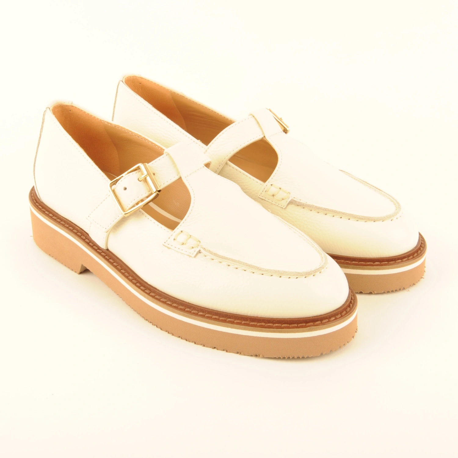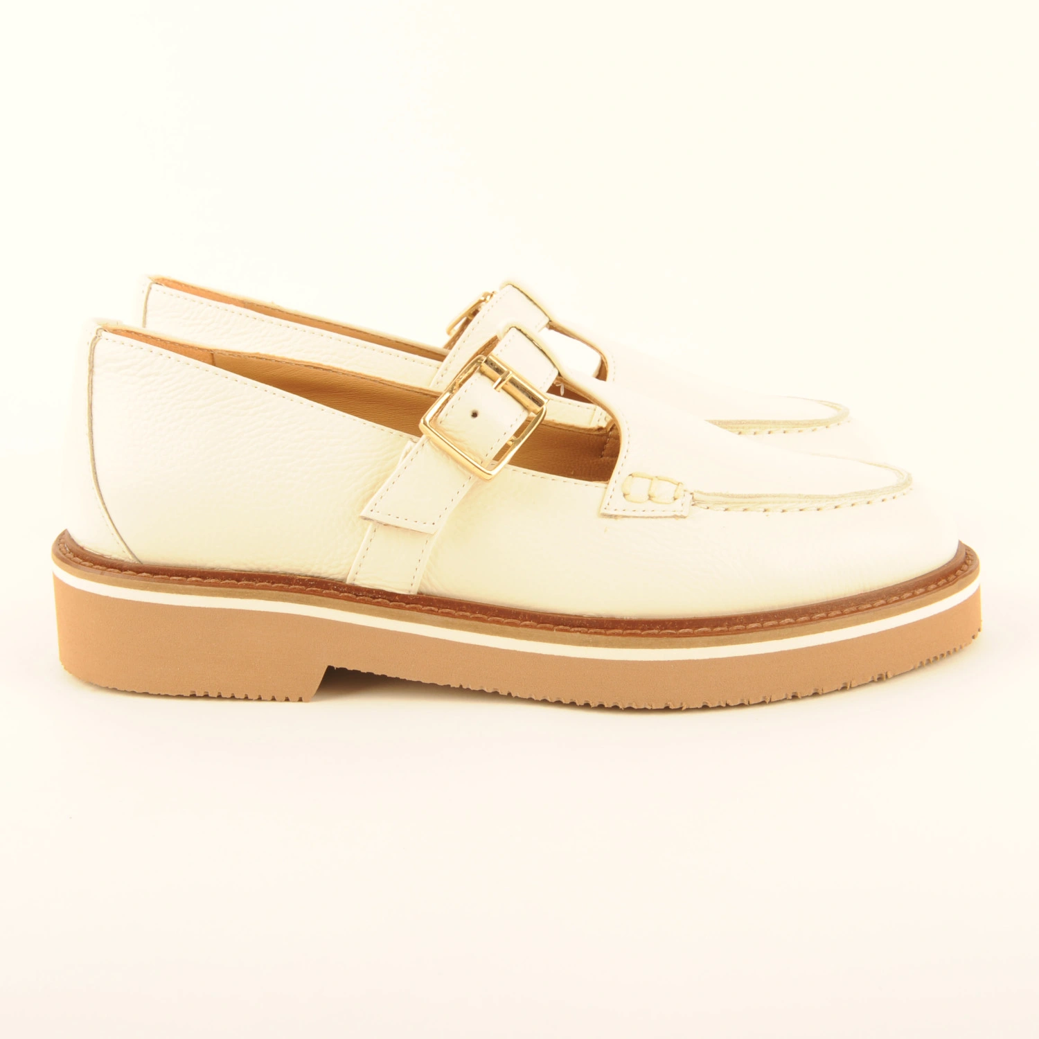 Instapper van wolwit gekrispeld leer met een T-band en een goudkleurig gespje. Deze instapper is leer gevoerd en heeft een beige/bruine rubberen zool met een witte streep.