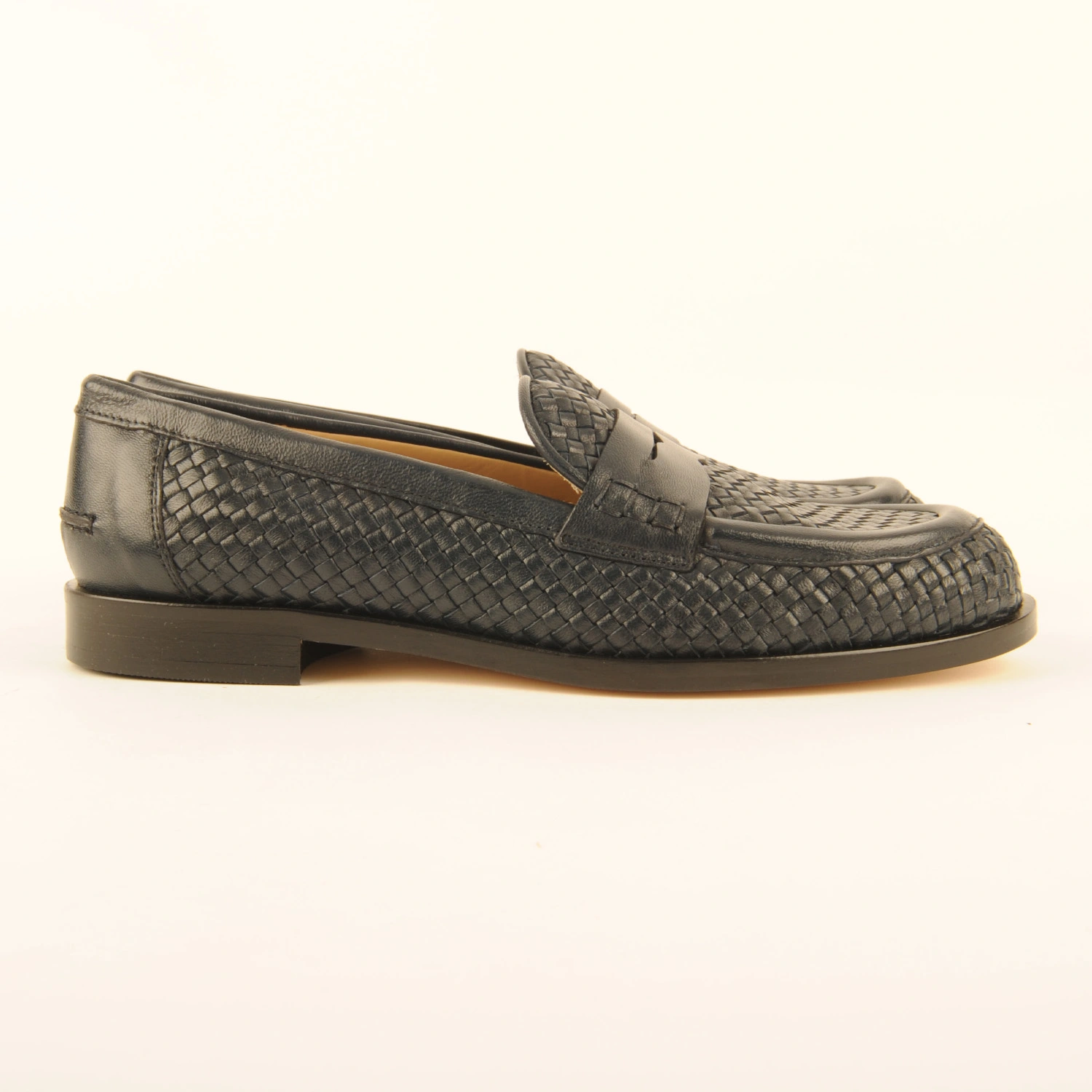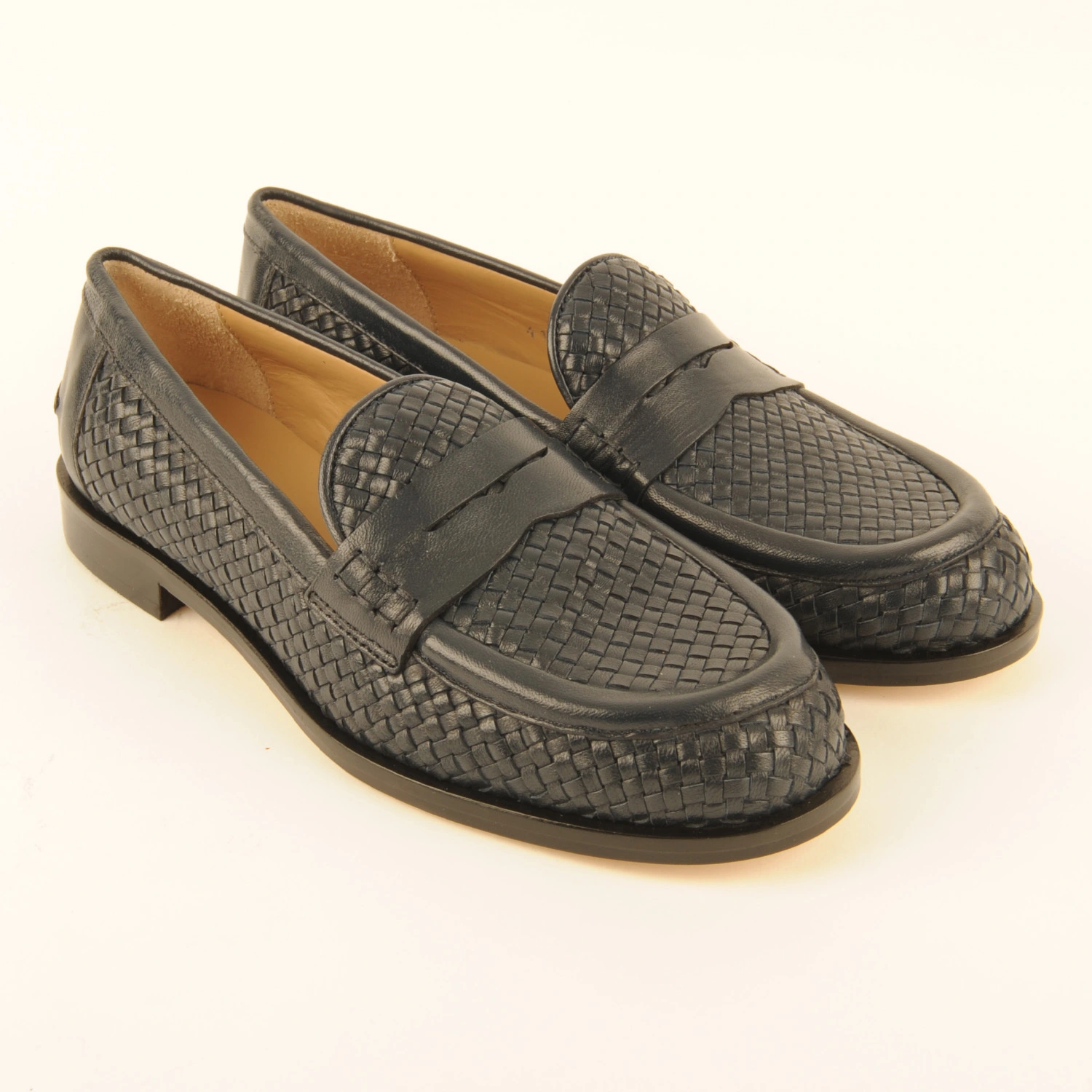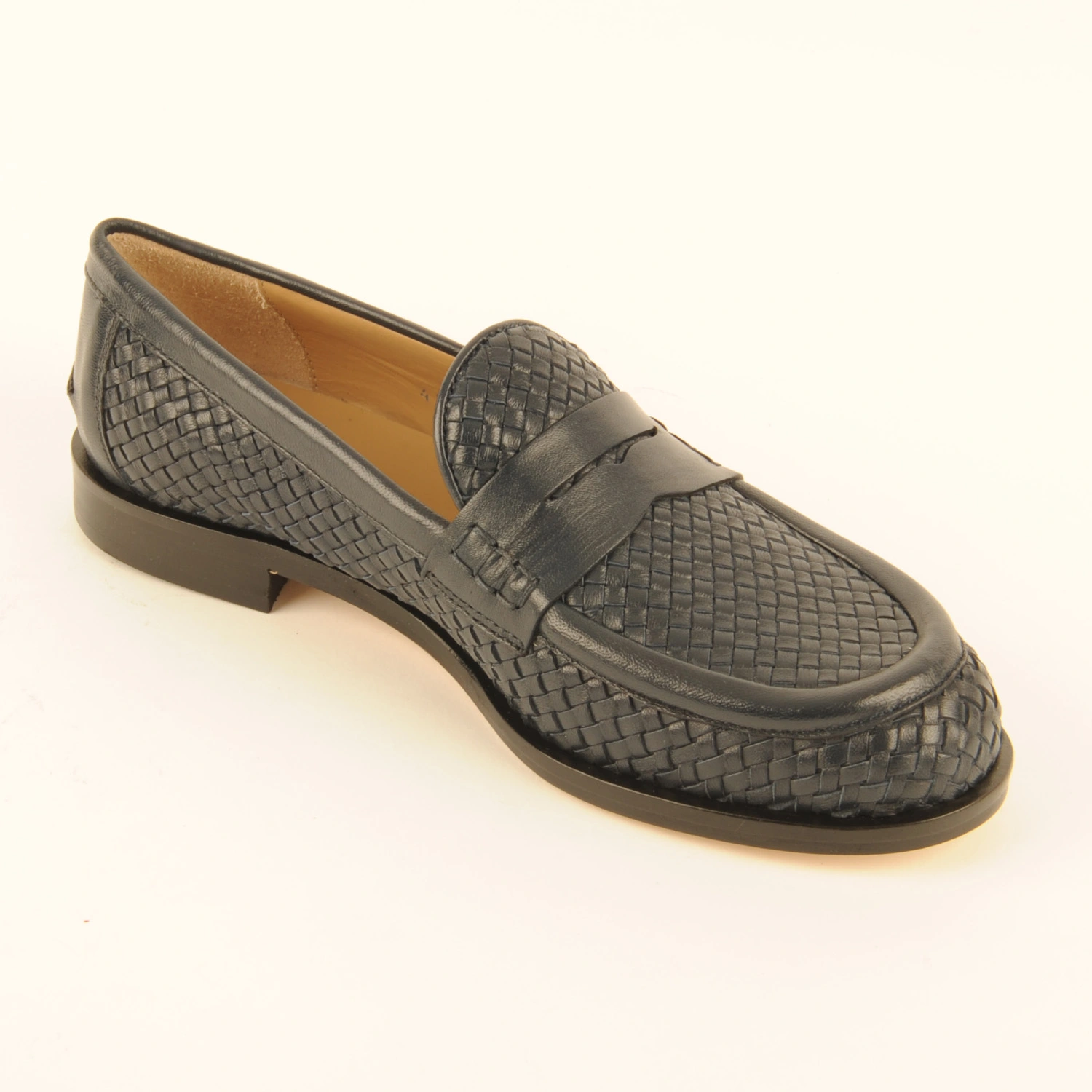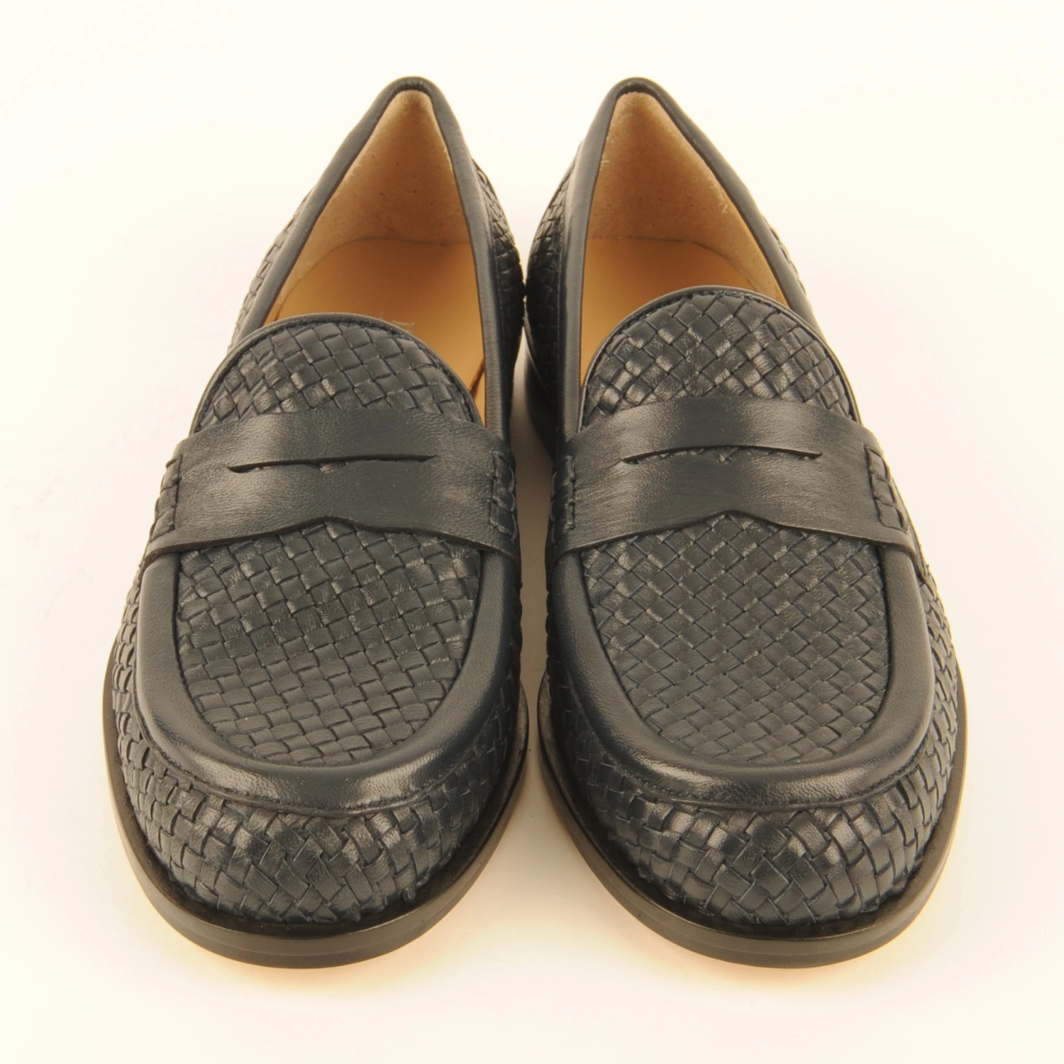 Penny mocassin van donkerblauw gevlochten leer. Deze instapper is leer gevoerd en heeft een leren zool. Dit artikel valt een halve maat groter dan normaal. Wij adviseren u daarom een halve maat kleiner te bestellen.