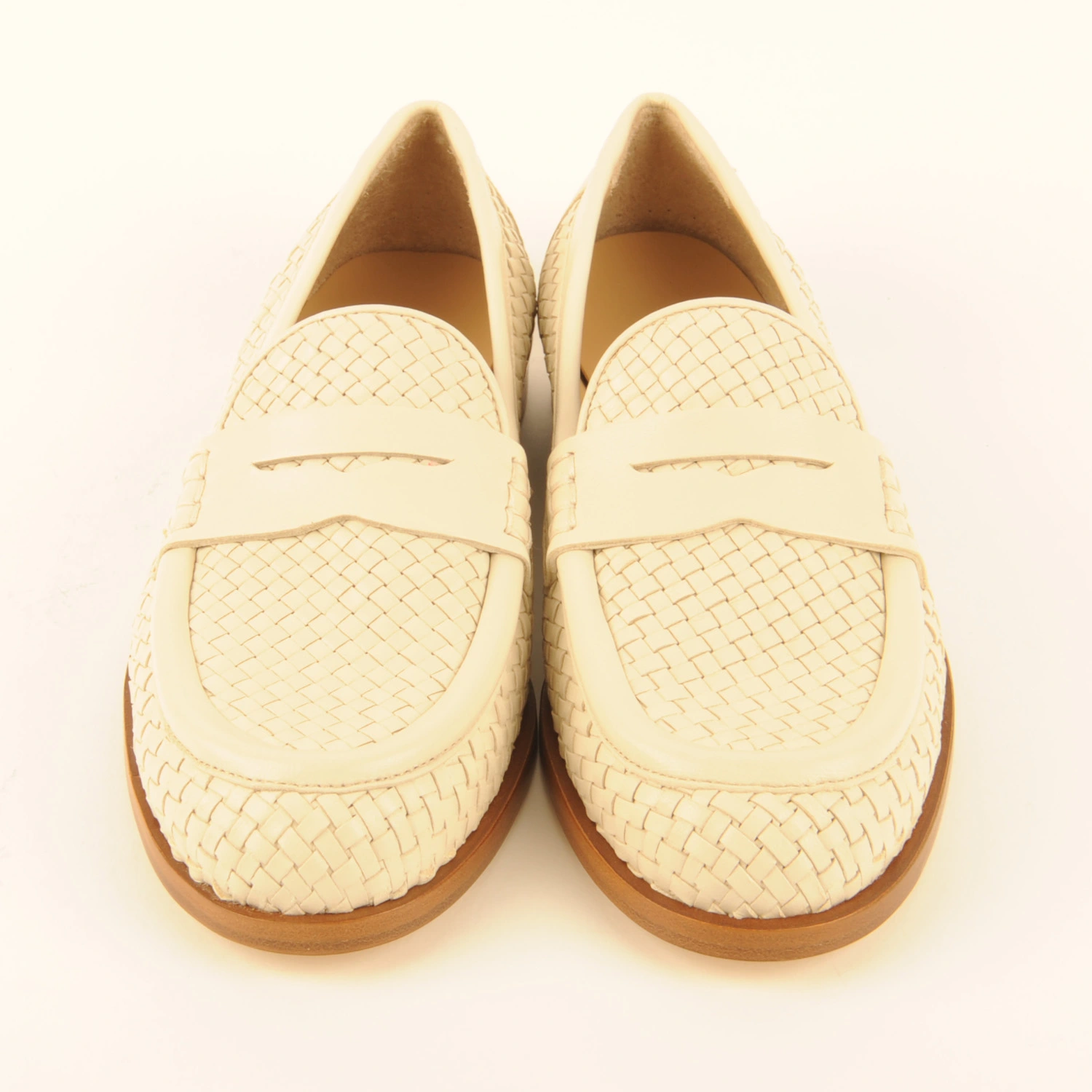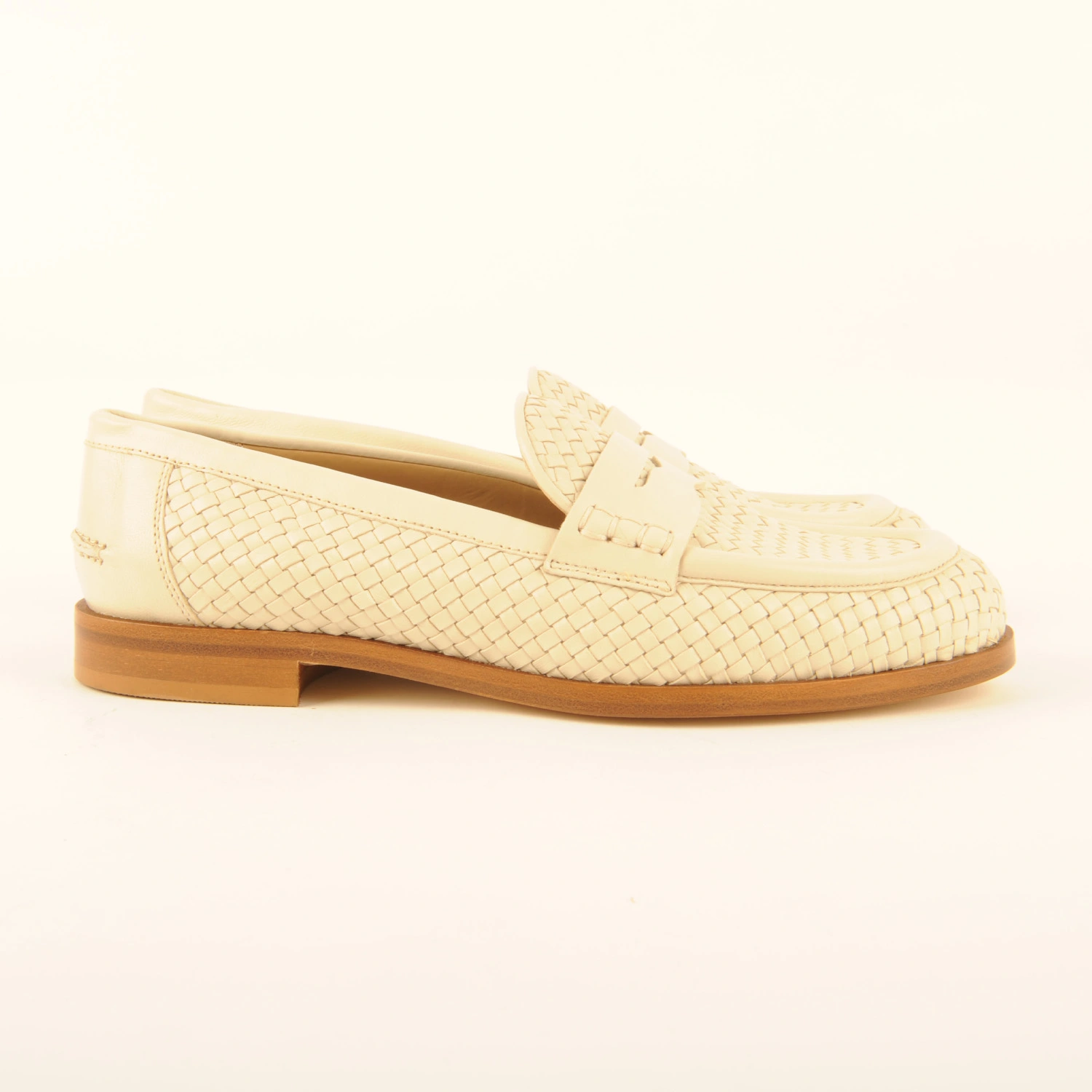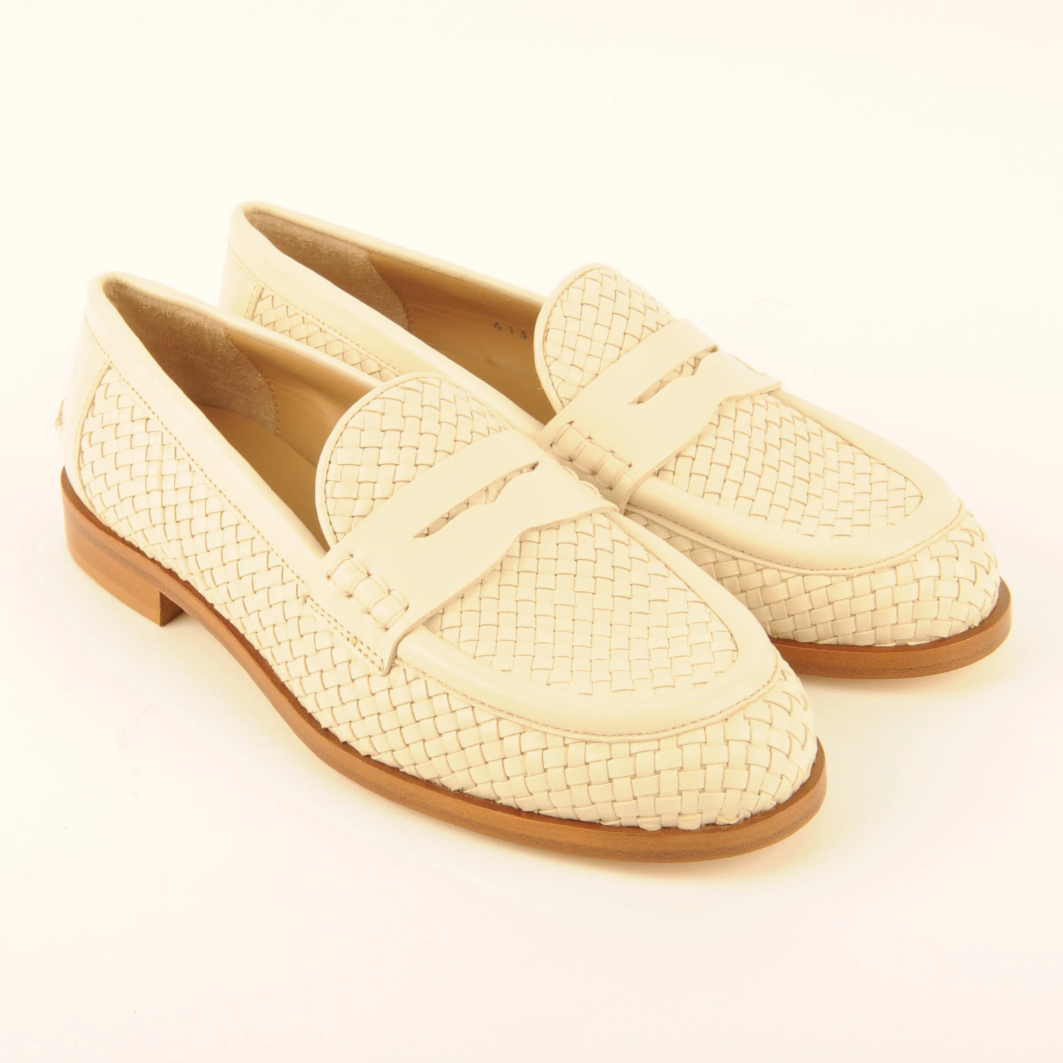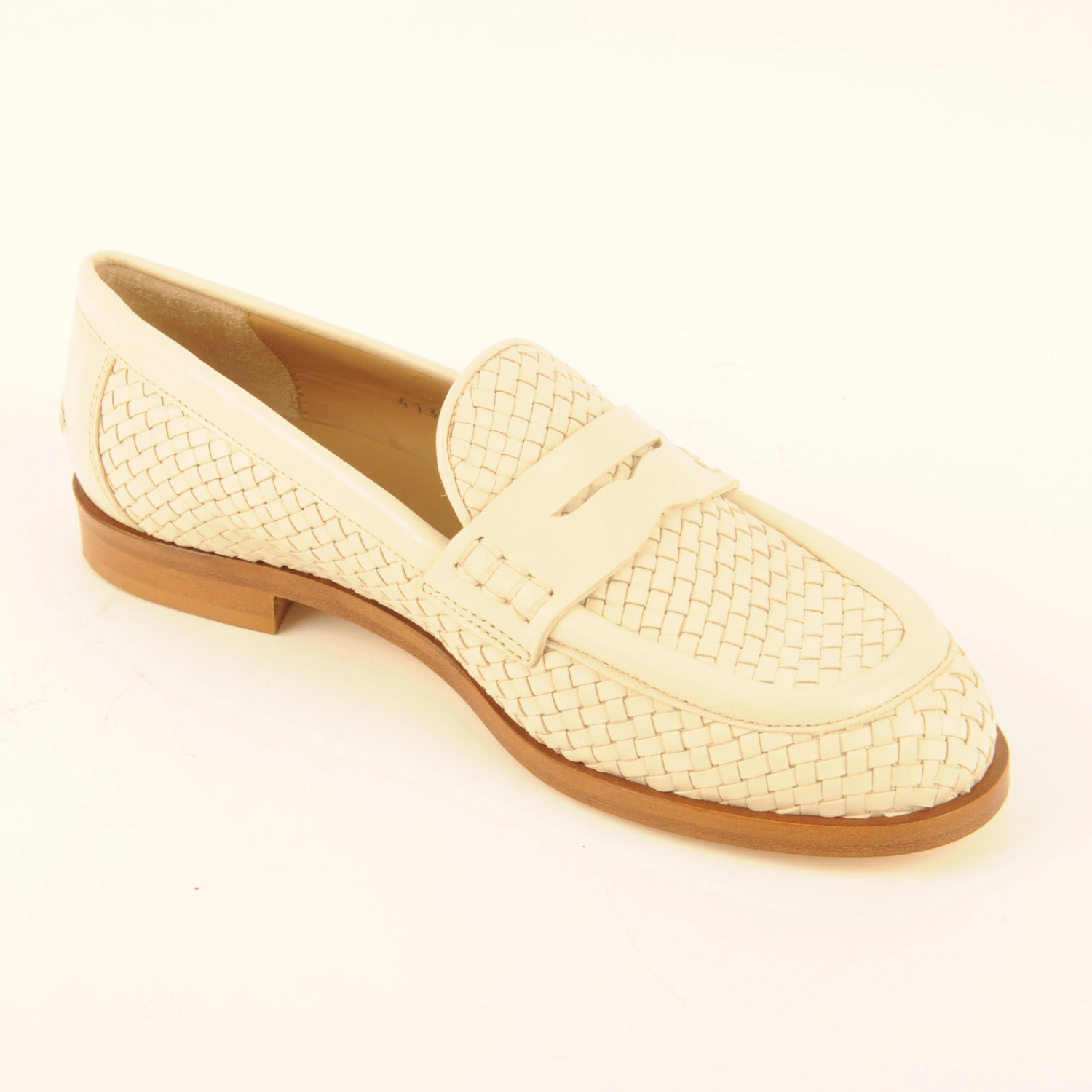 Penny mocassin van wolwit gevlochten leer. Deze instapper is leer gevoerd en heeft een leren zool. Dit artikel valt een halve maat groter dan normaal. Wij adviseren u daarom een halve maat kleiner te bestellen.